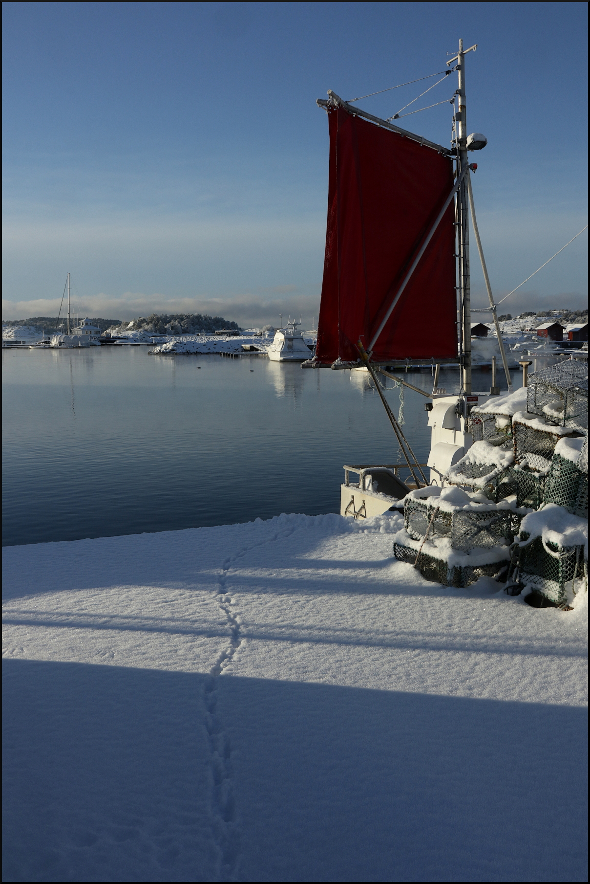 Rött, vitt och blått – den norska flaggan dominerar färgerna denna kyliga dag. Norgefärjan verkar dock ha tagit semester och i hamnen skrålas det inte mellan motorbåtarna. Gränshandeln känns avlägsen en sån här dag, istället breder tystnaden sig ut endast avbruten av att Kosterbåten lägger ut till öbornas glädje.