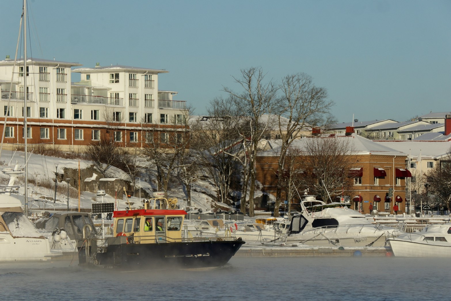 En del som har sjön som arbetsplats måste trotsa kylan med vi andra med våra fritidsbåtar bara inser att hamnen inte är en så gästvänlig plats i januari. Fast det finns alltid några optimister, som tror på en tidig vår, i ständig beredskap så fort trossarna har tinat och isen släppt runt skrovet.