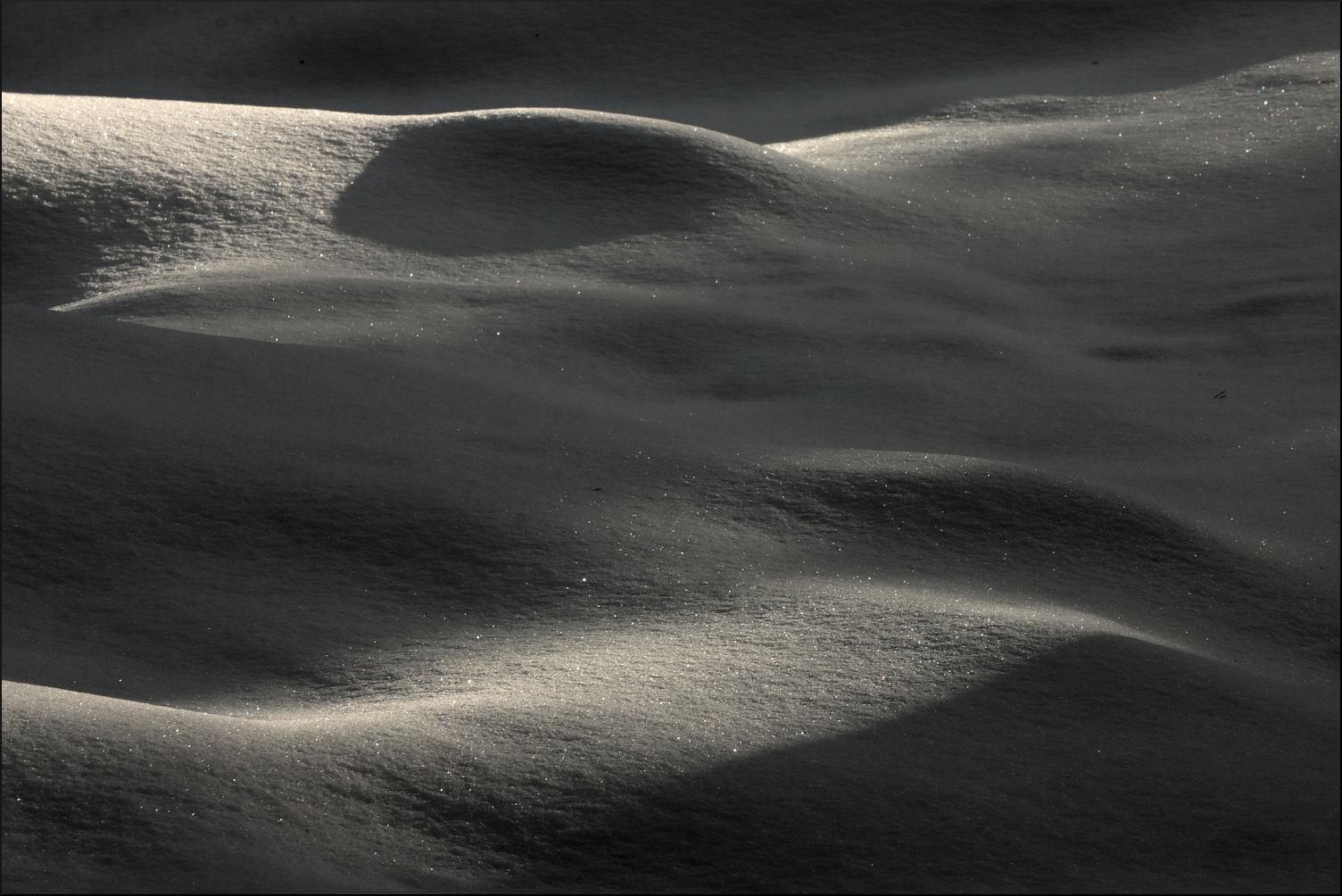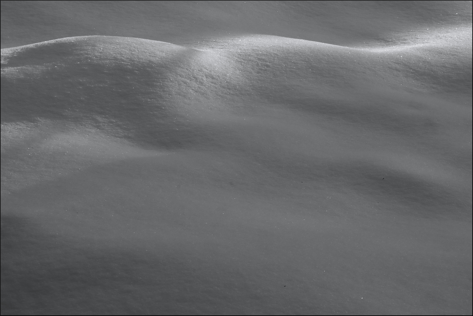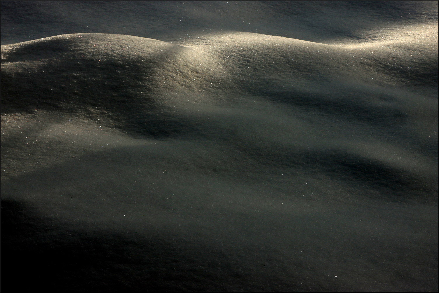 Sen skiftar snön hela tiden i nyanser, egentligen aldrig vit, endast reflekterande sol, himmel och miljön runtomkring den befinner sig i. Vid en första anblick verkar snön vara ”vit som snö”. Men sen börjar man kisa lite med ögonen och upptäcker skiftningar och andra färgskalor. Fantasin kanske tar vid, snöblindheten och gnistrande reflexer lurar ögonen som försöker hitta rätt. Vad är rätt eller fel när man skall försöka återge snön i bild. Minnet sviker snabbt exponeringsögonblicket och experimentet med att tolka dess uttryck hittar inte vägs ände. Det blir till slut något helt annat, ljus och struktur finns där i grunden, men tidpunkt och plats blir en helt annan.