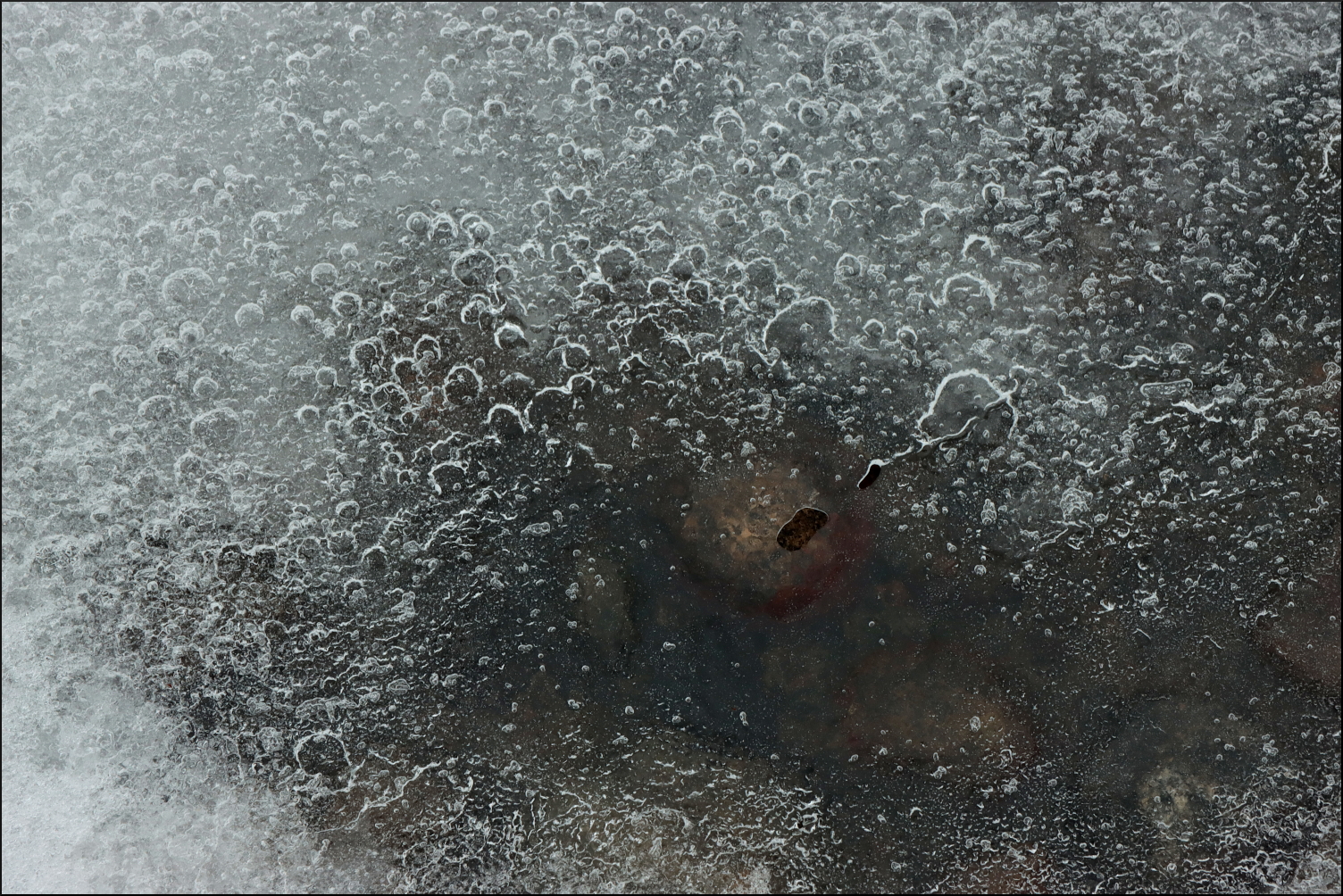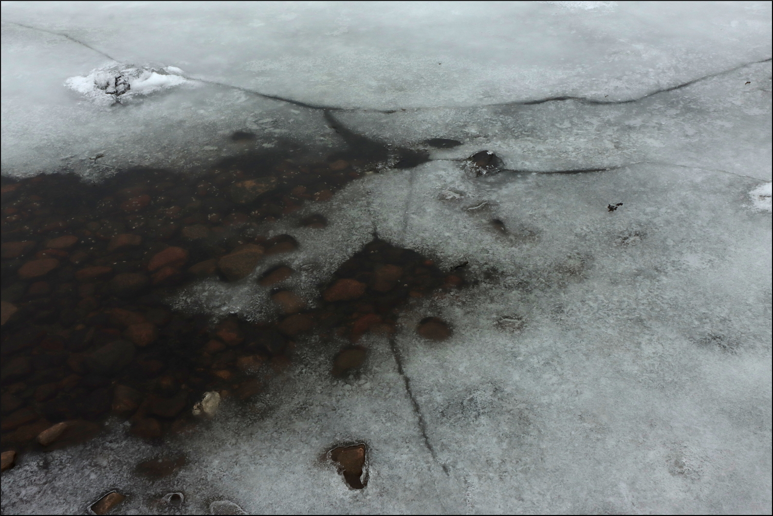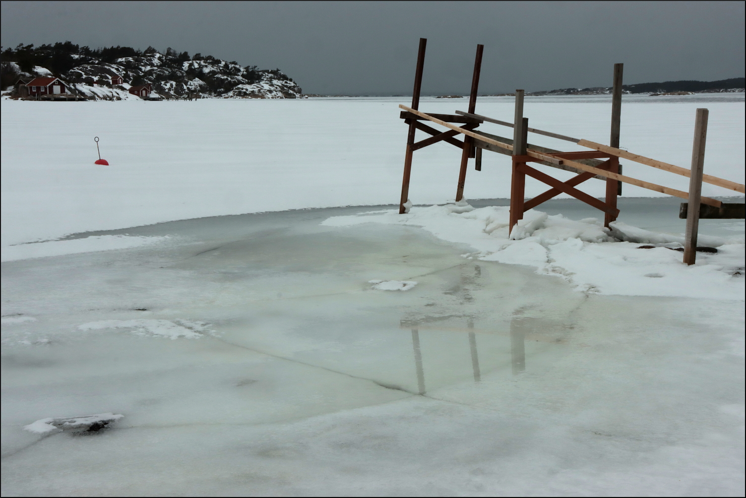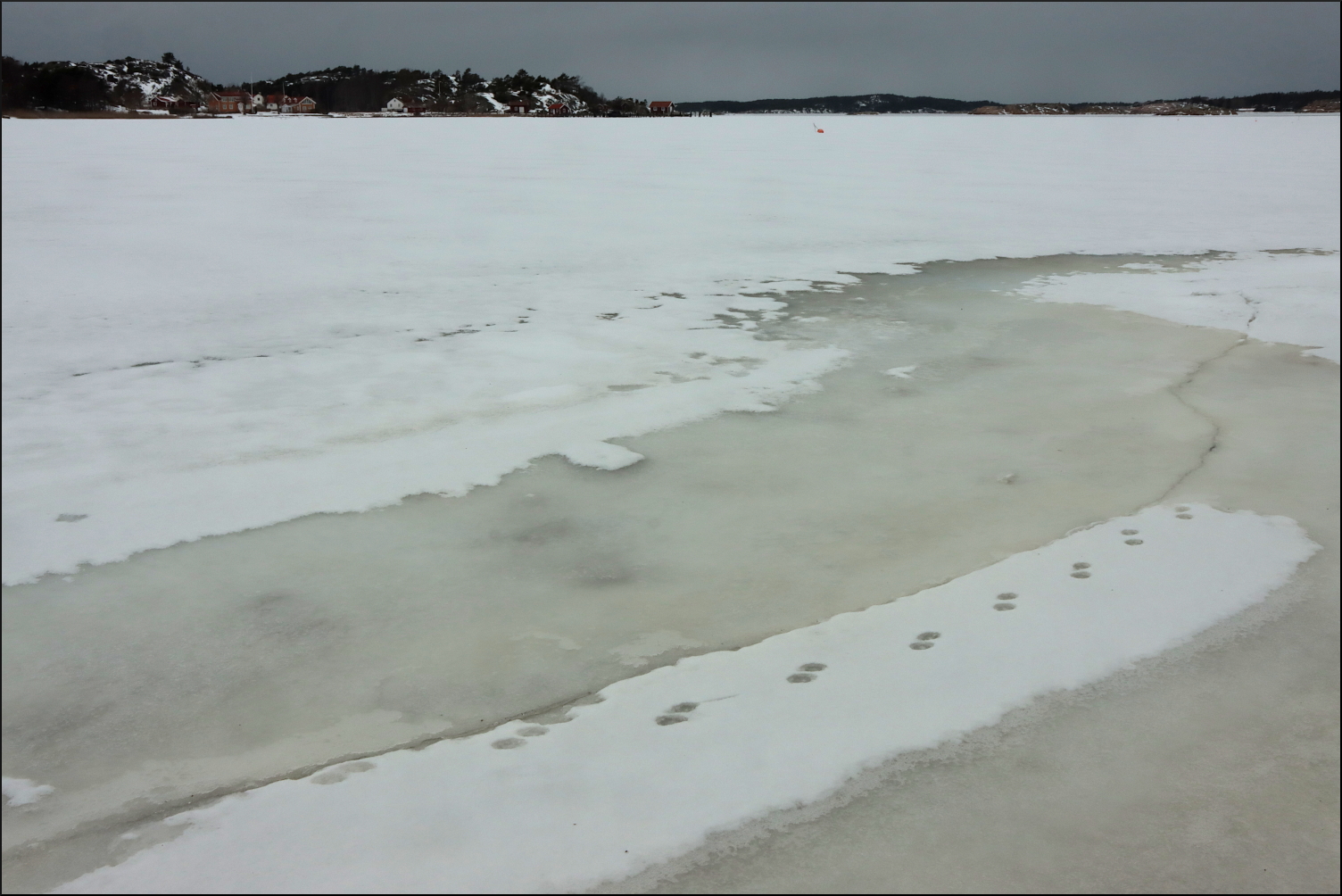 Följde den istäckta strandkanten på skör saltis. En räv hade varit modigare och gått lite längre ut. Regnet bildade små smältvattengölar där isen släppt taget från land ibland. En första antydan till bottenkontakt kunde skönjas när havet trängde sig upp ur små hål och isvakar. En vårkänning infann sig under några korta minuter innan det vid horisonten avlägsna lågtrycket från väster förvarnade mig med en snabb vindökning.