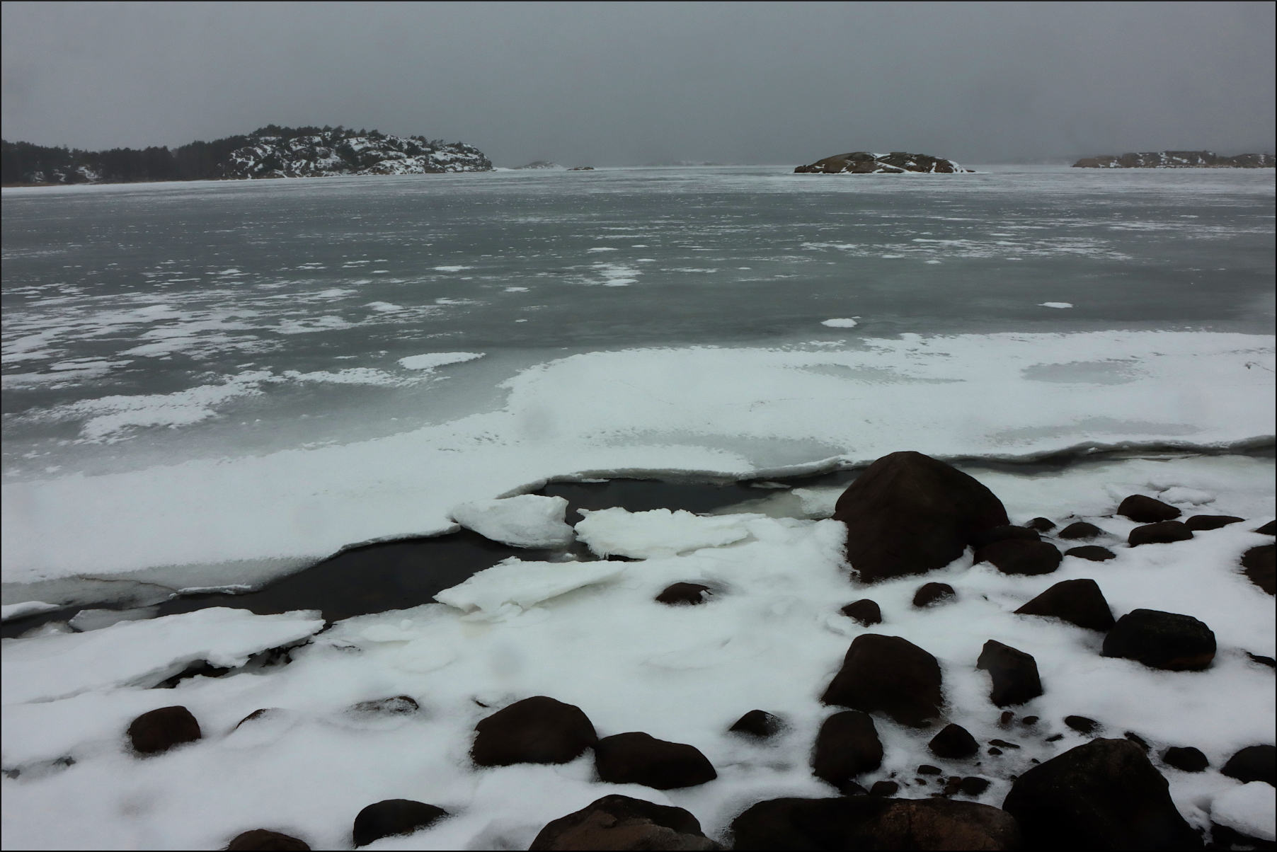 Helmulet och en plus-grad ute, med risk för snö mitt på dagen enligt prognosen. Tog bilen söderut men möttes ganska snart av ett tätt duggregn. Såg inte mycket bakom vindrutetorkarens svepande rytmiska rörelser. Snön låg tung på ängar och åkrar, lite gulsnaggat fjolårsgräs stack upp och där jorden var höstplöjd reste sig små mörka böljande kullar. Fortsatte ut mot Galtö, där isen låg på havet så långt som man kunde se. Några storskrakar höll till i en öppen råk under vägbron över. Lite längre bort kurade en ljus ormvråk på en stängselstolpe alldeles vid vägdiket.