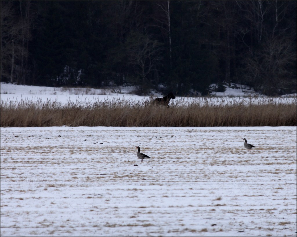 Drog in huvudet under kapuschongen och vände åter genom tallskogen. Hälsade på en gammal fiskare på Resö istället och såg en halv fotbollsmatch över en kopp kaffe med bulle. Norska Bodö slog italienska Inter med 2-1 på bortaplan, helt tyst på den italienska läktaren. Skrällen var ett faktum! Blev sittande vid köksbordet efteråt för att hämta igen allt som hänt sedan vi sist sågs, tog ett tag. Var inte så uppmärksam på hemvägen i det skumma ljuset men bromsade in snabbt tack vare en galopperande häst i fjärran. Två prickar på ängen hitom gick att urskilja. Värmen spred sig i kroppen när jag uppdagade de två ensamma grågässen som tittade sig omkring och säkert undrade; är vi först på plan?