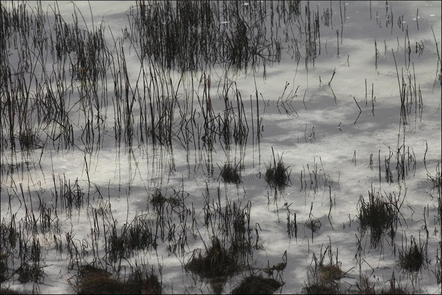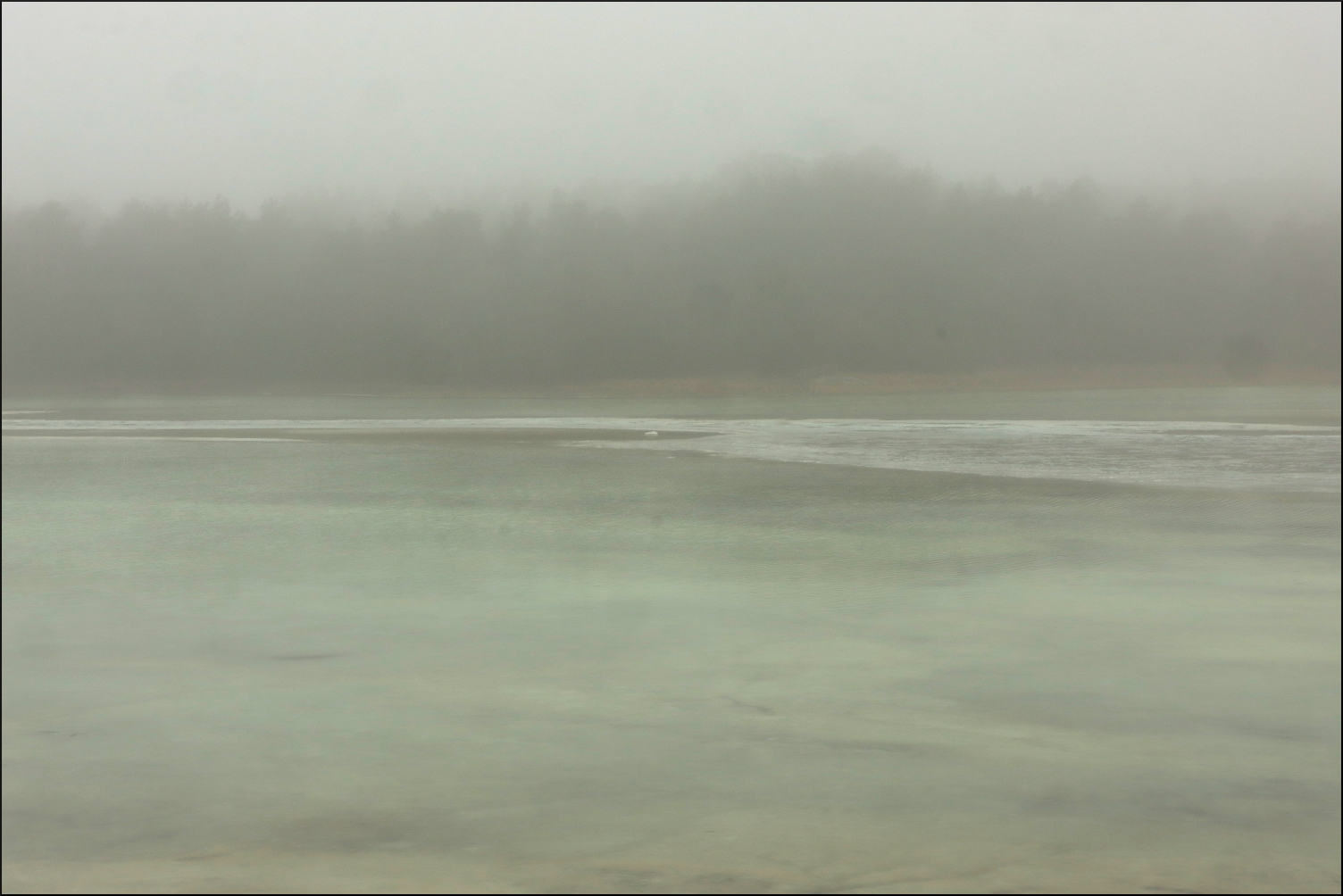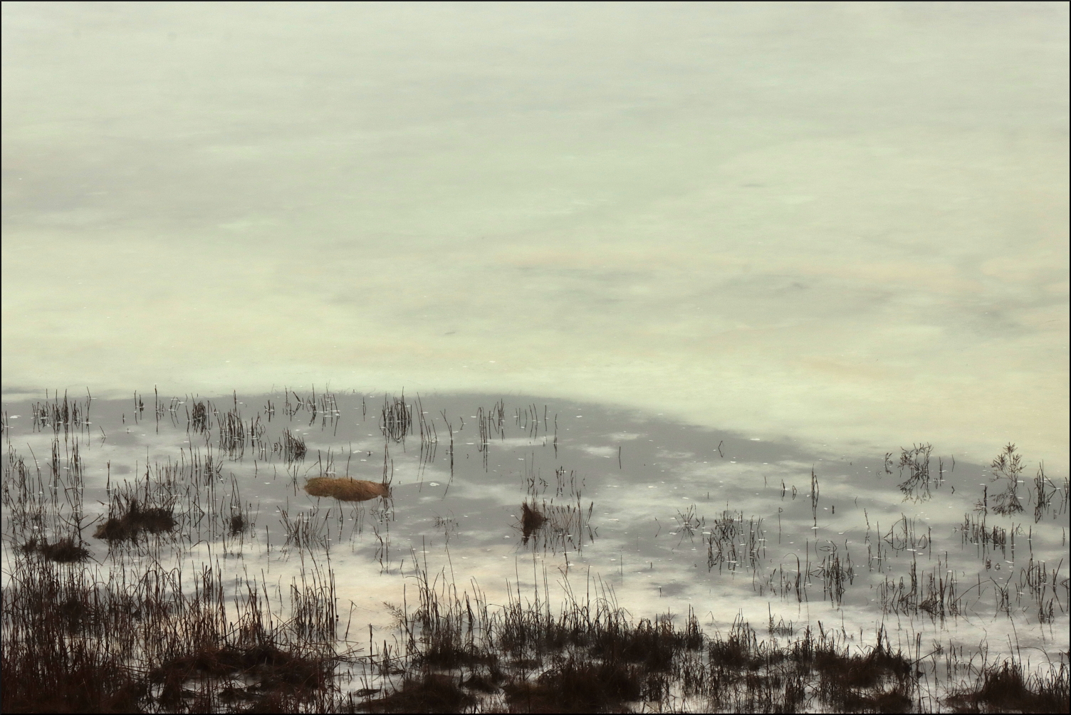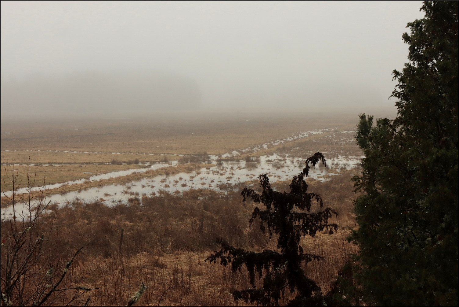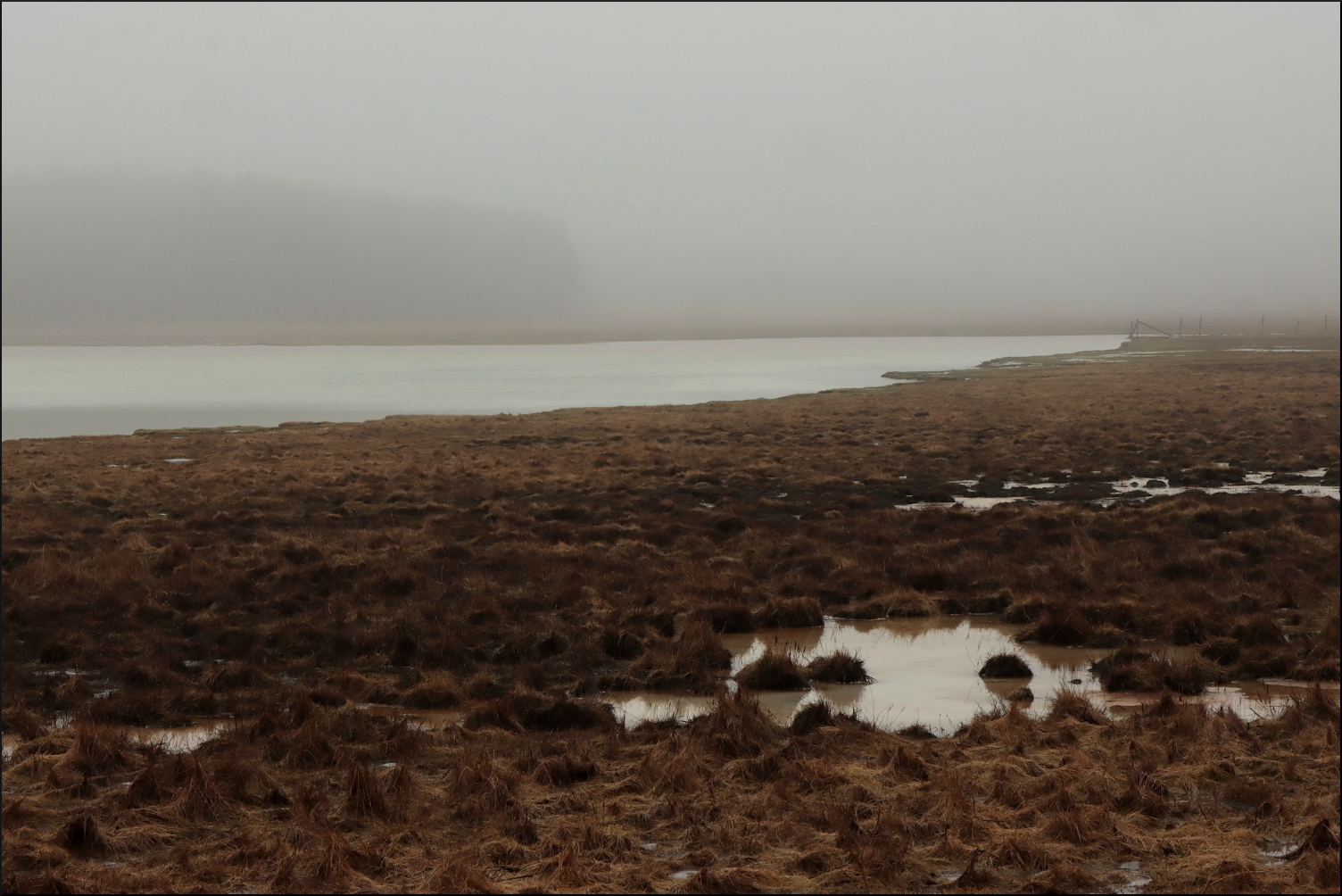Gårdagen regnade bort och all snön med. Resultatet blev översvämmade marker då tjälen inte hunnit släppa. All fukt fastnade dessutom ovan markytan och dimman har legat tät hela dagen efter. Havet försöker ta emot det plötsliga överflödet av sötvatten, men mäktar inte med då havsvikarna fortfarande är istäckta. Indirekt ljus tack vare dimman och is under vatten ger overkligt skiftande färgtoner.