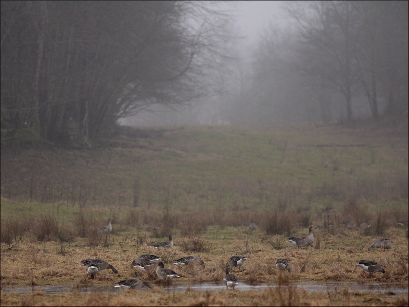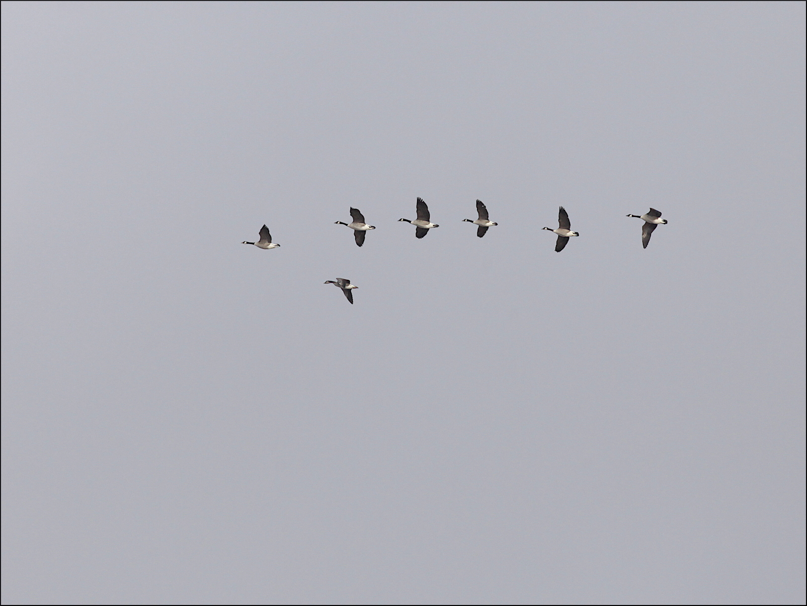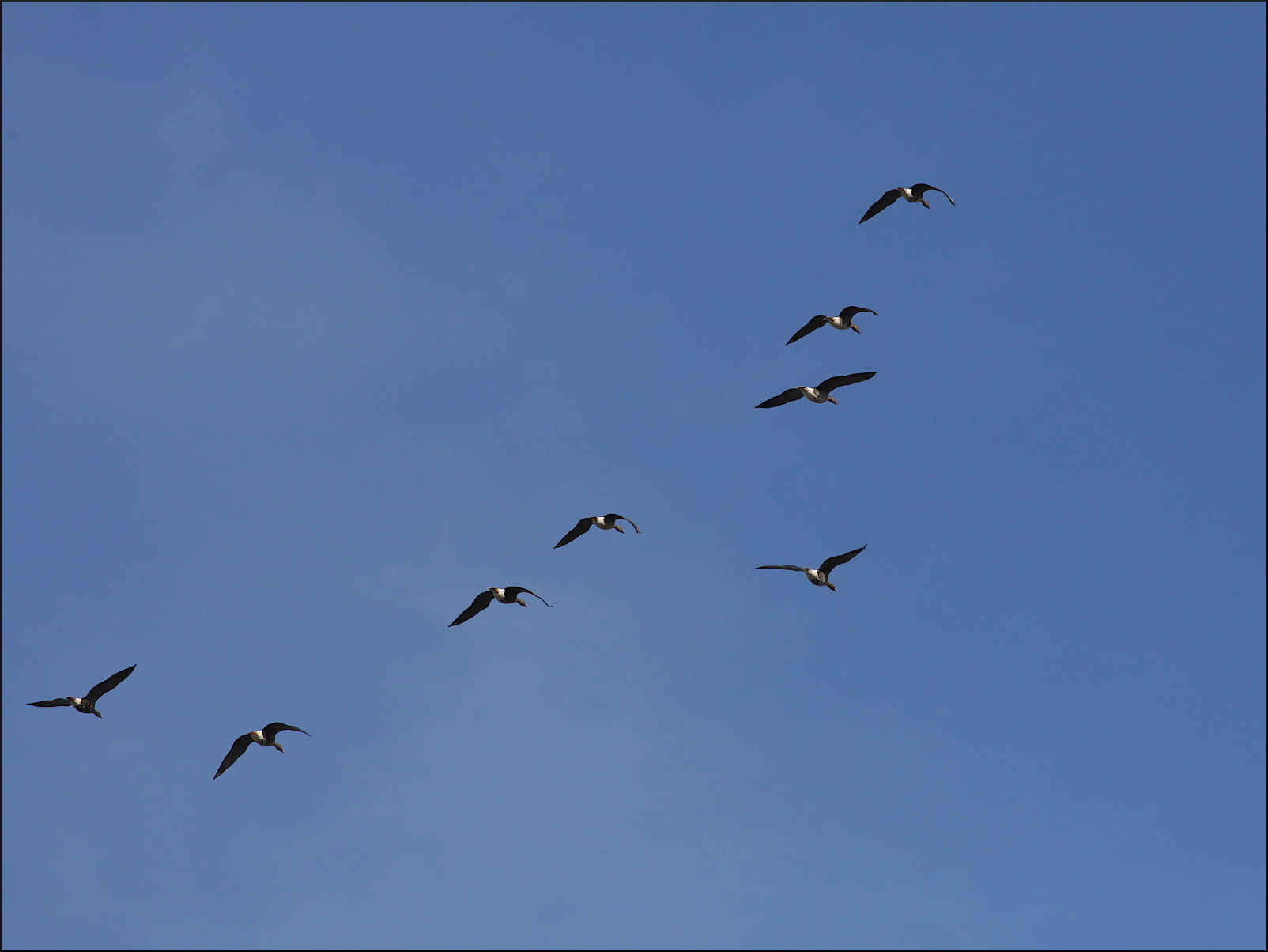 De första flockarna med kanadagäss talar högt och tydligt om vilka de är, långt innan man ser dem. Ett par splittrade flockar enbart bestående av bläsgäss avslöjar sig också tidigt med sitt avvikande flyktläte. Nya ljudbilder blandas upp i lufthavet.