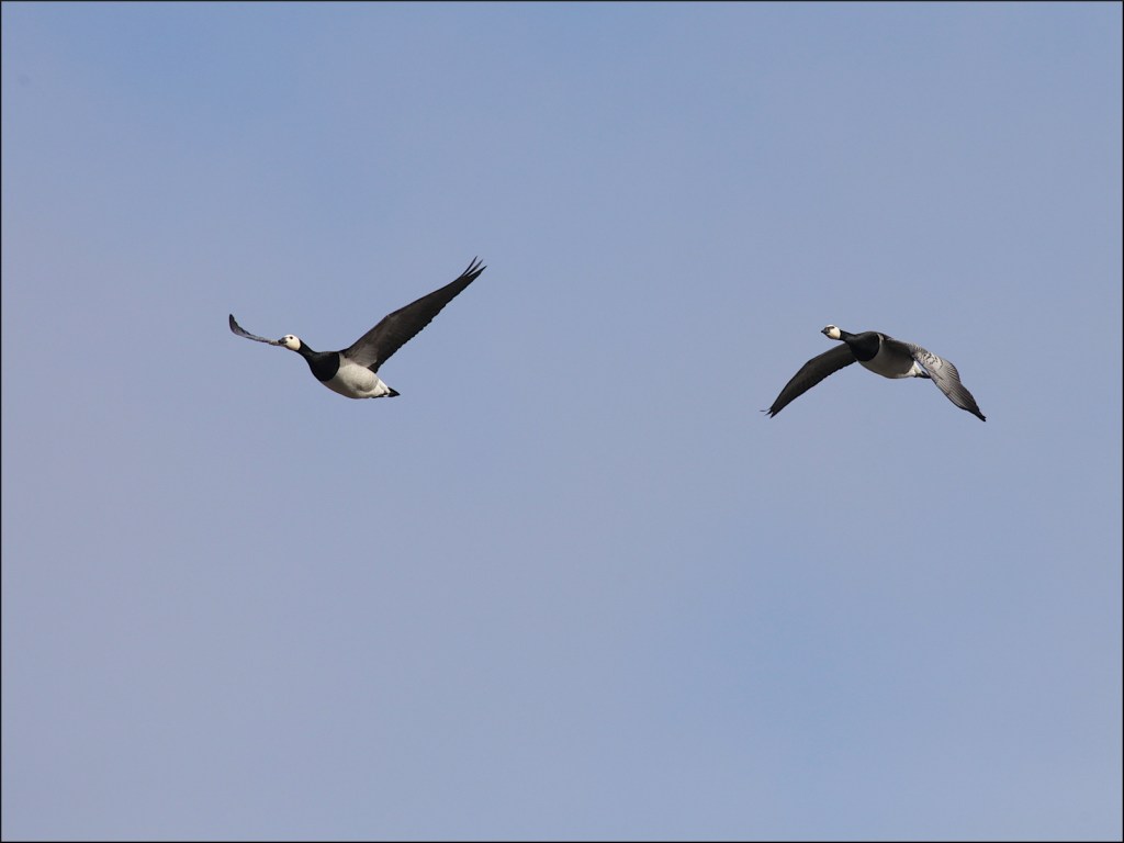 Men, det vitkindade gåsparet lurade mig. Kom tystlåtna från norr mot min plats, olikt kanadagås tänkte jag och lyfte inte kameran förrän de nästan flög över taket på min observationsplattform. Då tittade de förvånat och kanske lite förnärmade på mig. Ser du inte hur smäckra vi är med svart polotröja och vitpudrade kinder.