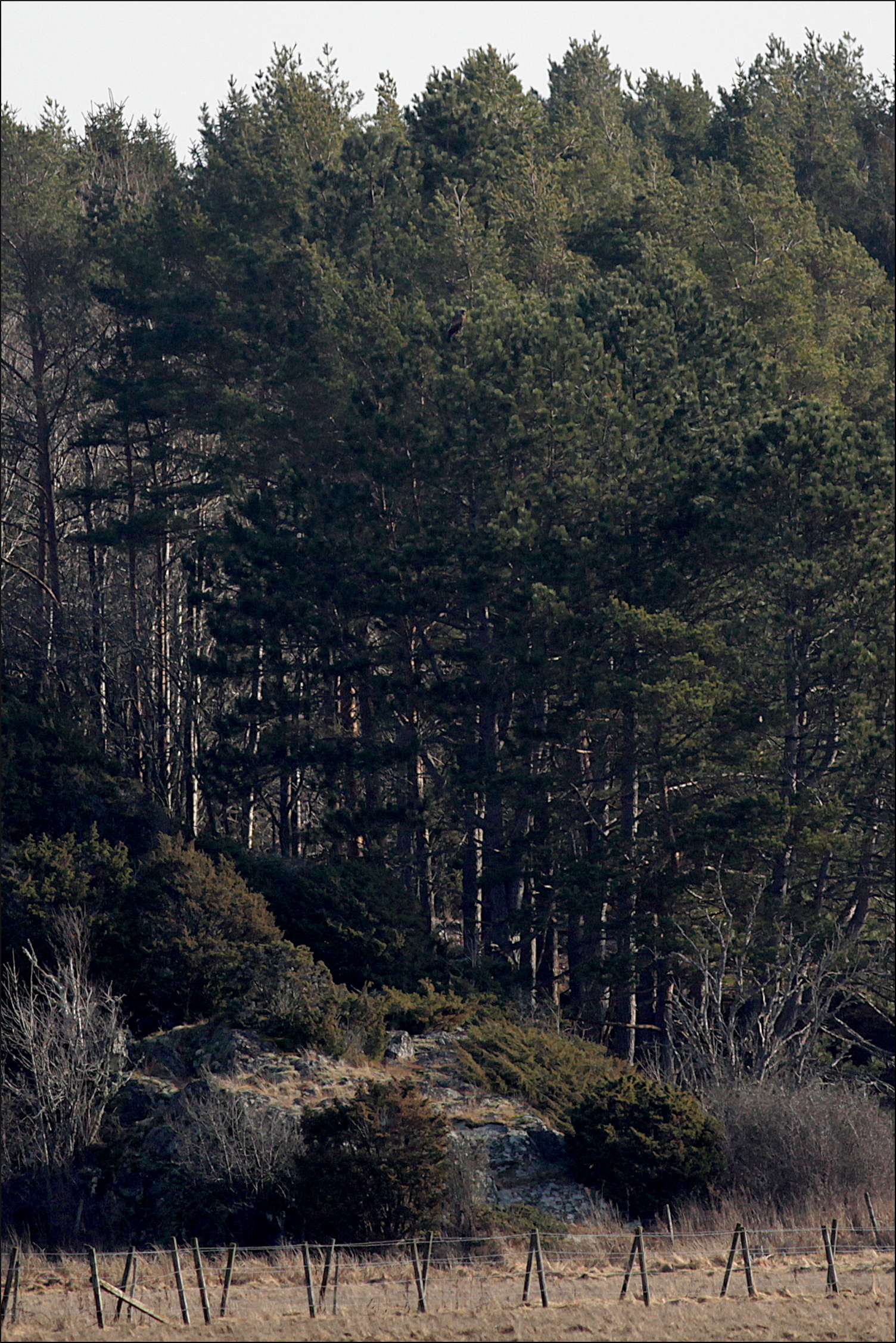 Två dagar sen jag var ute sist och morgondimman låg tät idag med. Prognosen sa att den skulle lätta så en chansning var på sin plats. Lite sent ute men när jag hade fått upp tubkikaren gick det att se andra sidan viken hjälpligt. Två ormvråkar som skrikande dök ner mot en talldunge väckte min nyfikenhet. Mycket riktigt, en örn lyfte och flög snabbt iväg över ängen mot ett berg längre bort. Örnen blev genast uppvaktad av en kråka och flyttade sig till några låga tallar vid sidan om.