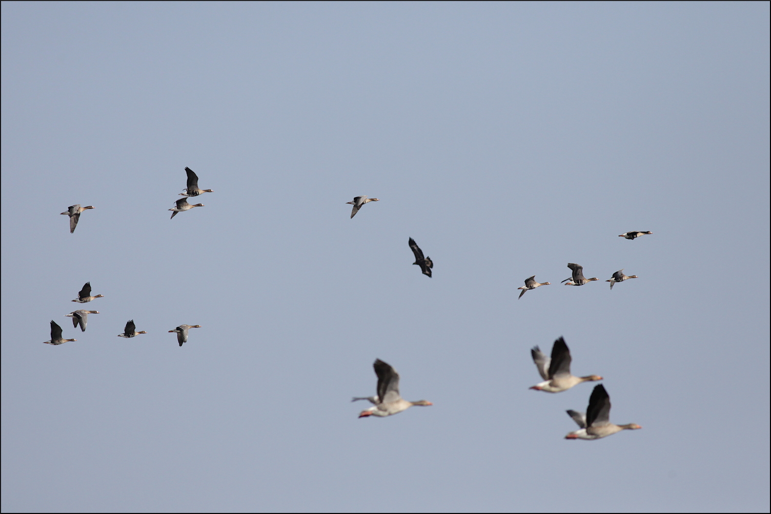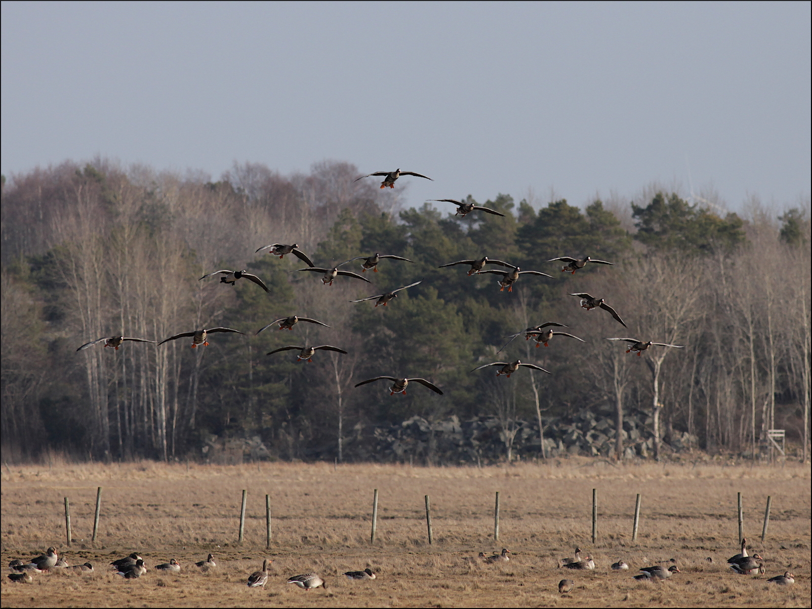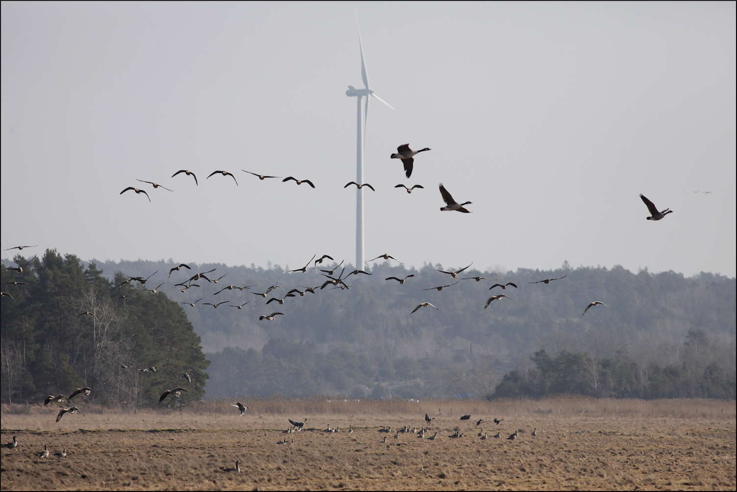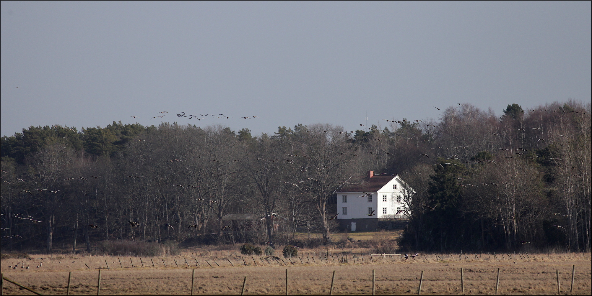 Ingen kungsörn syntes, men hela tiden anlände det fler gäss. De kom norrifrån, tätt över skog och hus, men även österifrån. Helt klart var förmiddagens betande på de höstsådda åkrarna över, åtminstone för tillfället. Enstaka kanagäss och en ensam vitkindad gås kunde urskiljas i kaoset över ängarna. Mest anmärkningsvärt var nog ändå den stora mängden bläsgäss, som hela tiden kom i flera grupper om 15-20 gäss. De höll sig hela tiden väl med grågässen som var i tydlig majoritet, någonstans mellan 1000-1500 exemplar rörde sig i området. Ett formidabelt middagsbord för en hungrig kungsörn.