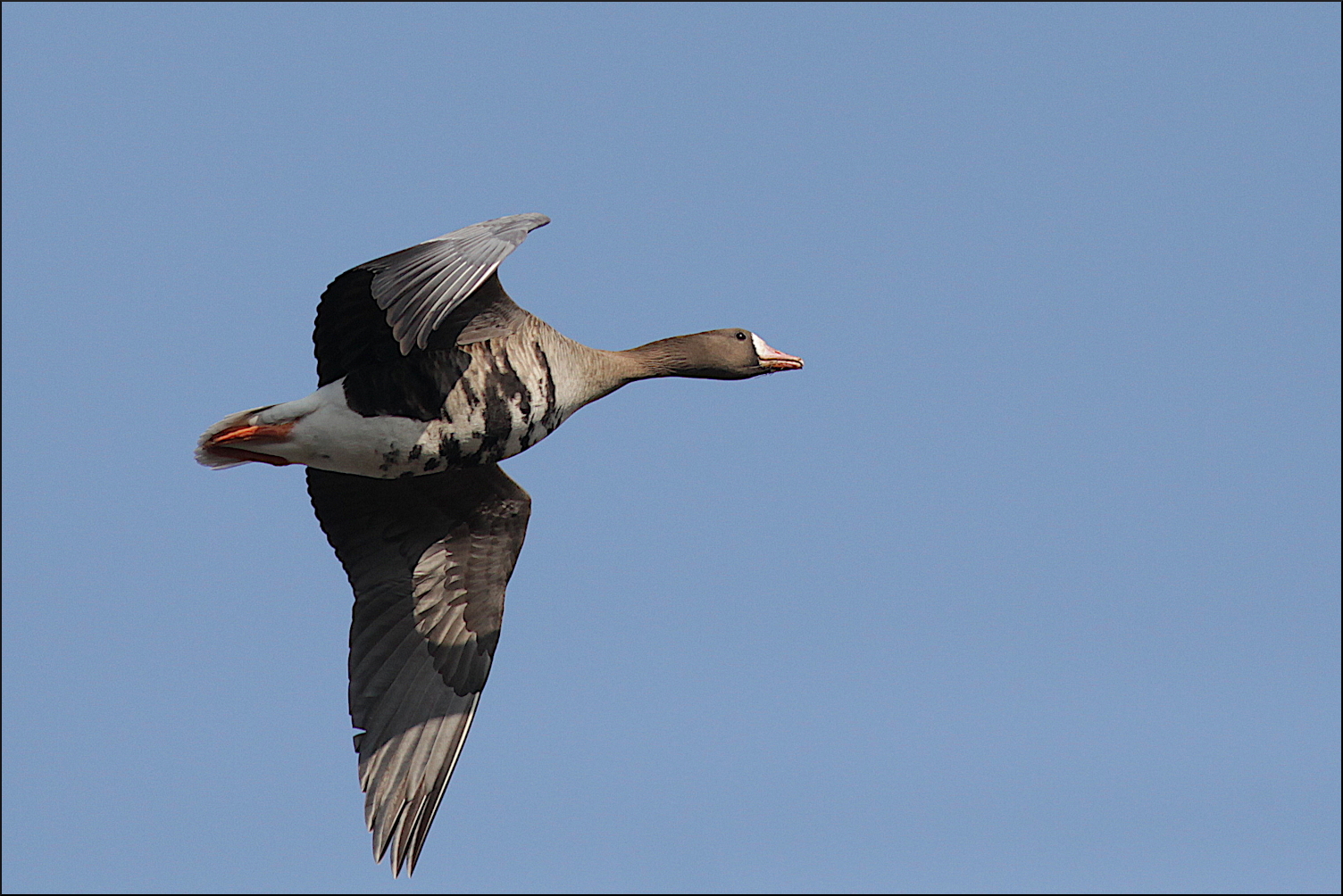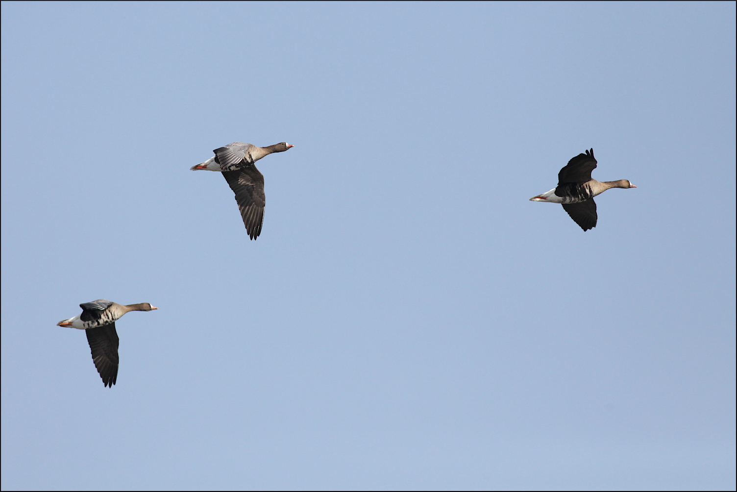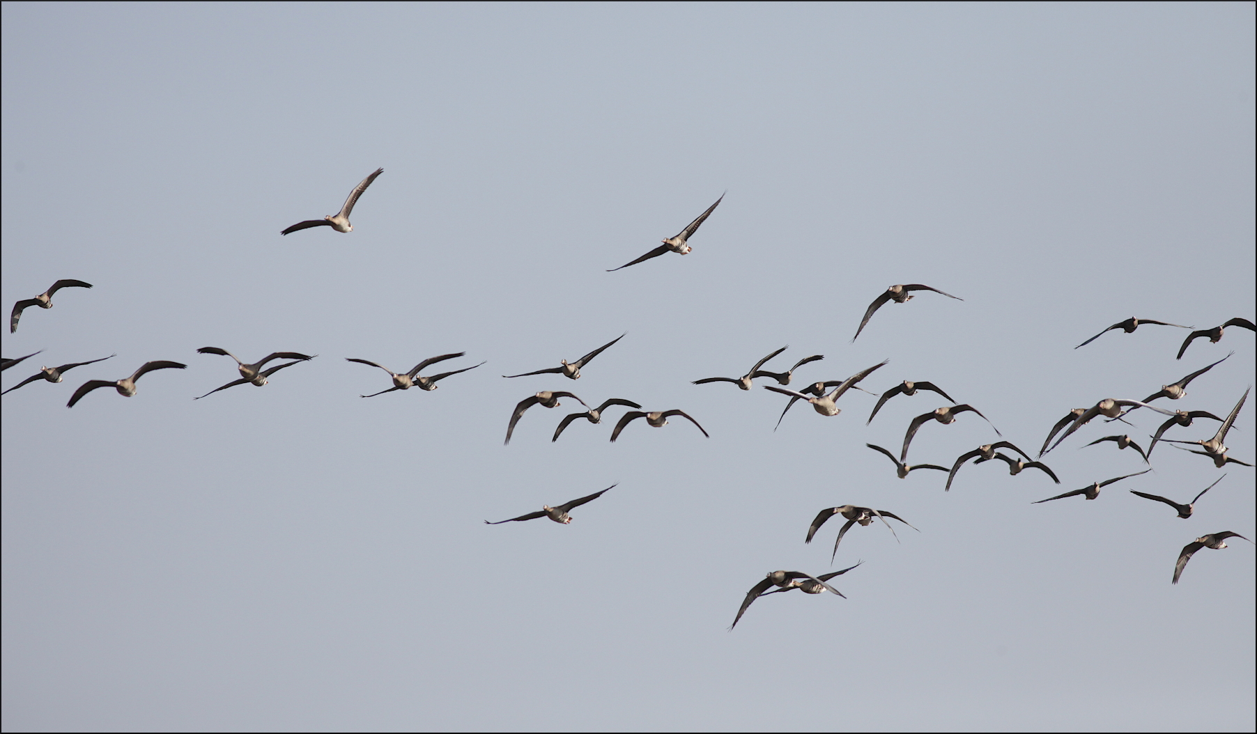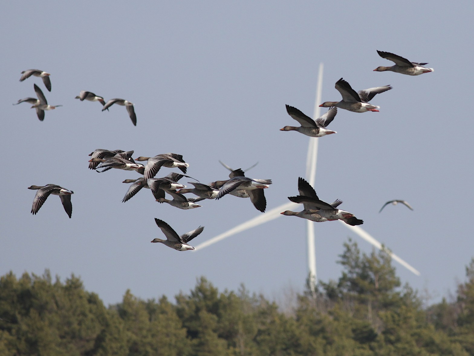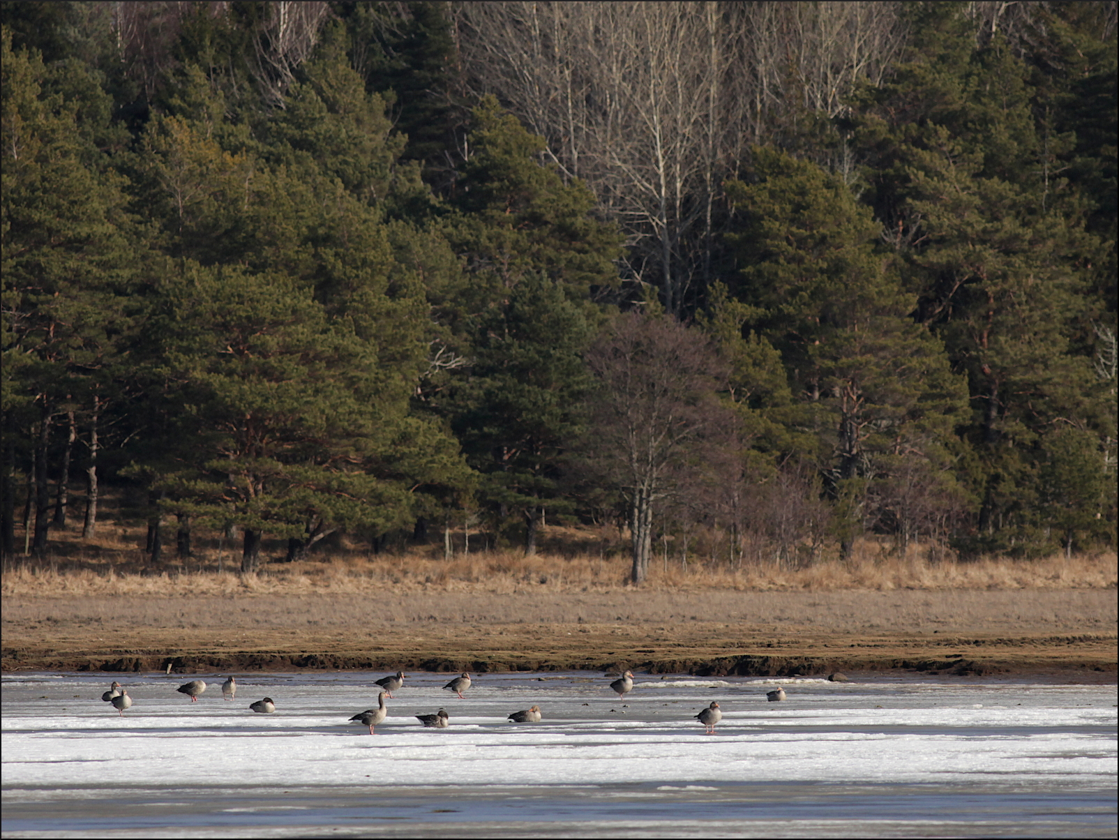 Ingen kungsörn syntes, men hela tiden anlände det fler gäss. De kom norrifrån, tätt över skog och hus, men även österifrån. Helt klart var förmiddagens betande på de höstsådda åkrarna över, åtminstone för tillfället. Enstaka kanagäss och en ensam vitkindad gås kunde urskiljas i kaoset över ängarna. Mest anmärkningsvärt var nog ändå den stora mängden bläsgäss, som hela tiden kom i flera grupper om 15-20 gäss. De höll sig hela tiden väl med grågässen som var i tydlig majoritet, någonstans mellan 1000-1500 exemplar rörde sig i området. Ett formidabelt middagsbord för en hungrig kungsörn.