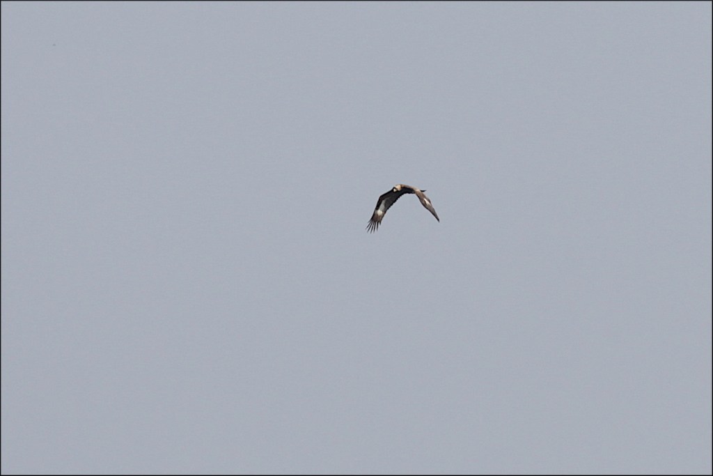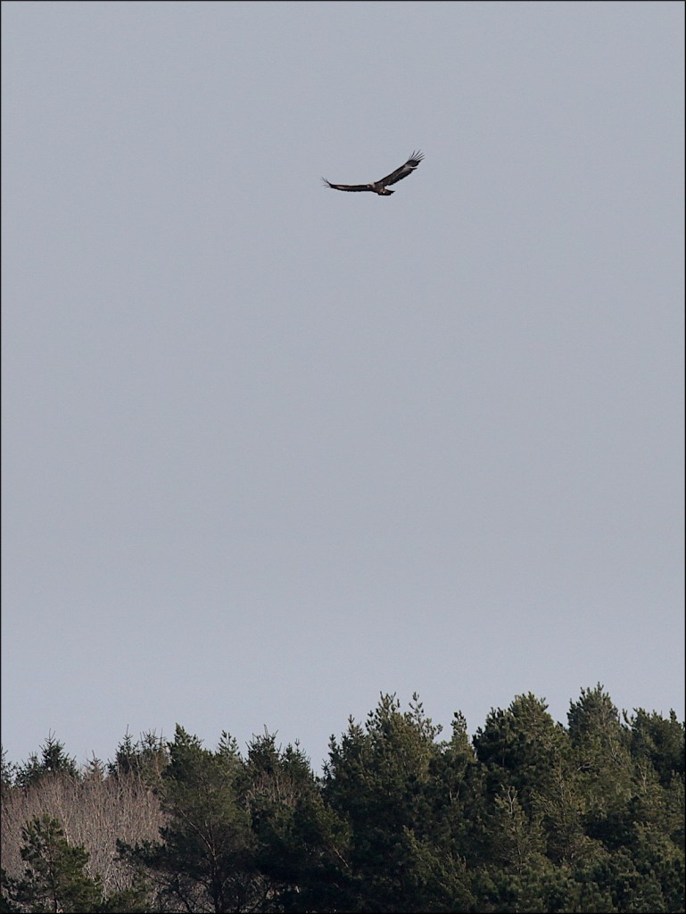 Kunde knappt se nåt första halvtimmen. Gjorde en liten förflyttning samtidigt som molnen lättade något. En brun större prick, men helt klart en örn. Kunde till slut urskilja ett ljusare huvud med mörkt ansikte, mörk näbb, chokladbrun rygg med mörkbruna vingar och ett ljusare band samt en antydan till vitt på stjärten. Tänkte hela tiden kungsörn, men har inte sett någon här vid kusten de senaste 10-15 åren.