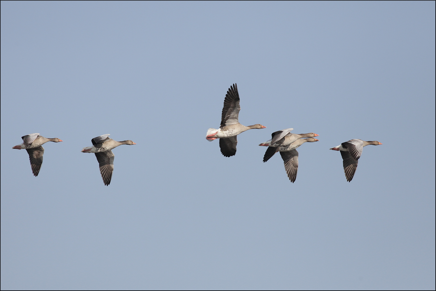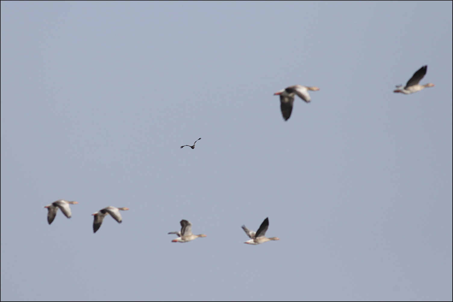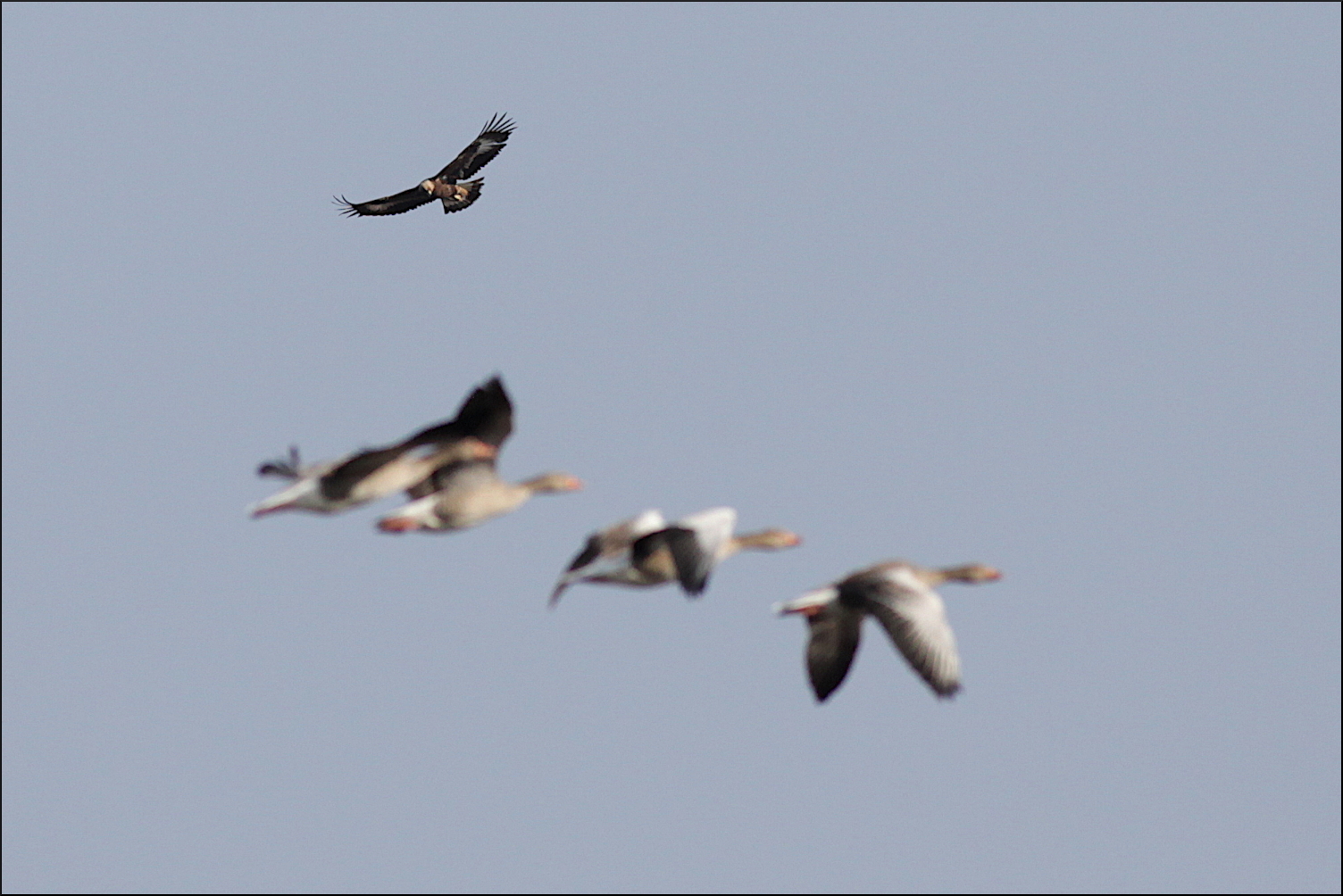 Genast hade den siktet inställt på en grågås som precis hann lyfta så örnen fick gira skarpt och fullfölja störtdykningen horisontellt. Med snabba vingslag tog örnen upp förföljelsen, sicksackade snabbt som en duvhök men kom aldrig närmare än ett par meter. Överraskningsmomentet var över och örnen steg högre upp i ett gytter av gäss som flög åt alla håll. Hoppet om att någon var skadad i kaoset fanns där när den spanade en sista gång innan den seglade vidare utom sikte igen.