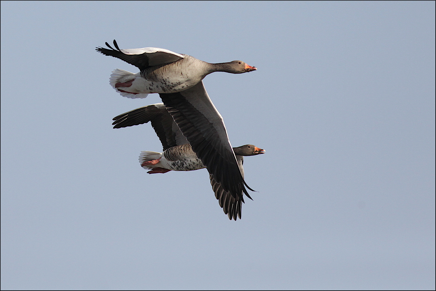 Det tog en lång stund innan lugnet kunde återställas i viken. Hela tiden var det rörelser bland gässen. Ibland lyfte till synes utan anledning, mitt i lunchen som det syntes på en del grågåsnäbbar. Oron låg påtagligt kvar och de var mer uppmärksamma på silhuetter över sig än en gubbe som satt i skuggan, lutad mot en stenmur. Fanns tid att studera skillnaderna på grågås och bläsgås. Inte bara den vita pannan, bläsen, utan också de betydligt större mörka oljefläckslika banden över bläsgåsens bröst, till skillnad mot grågåsens mer utsprida små fläckar, där det överhuvudtaget förekom. Variationerna är stora, men märkbara skillnader att lägga till demensblockaden.