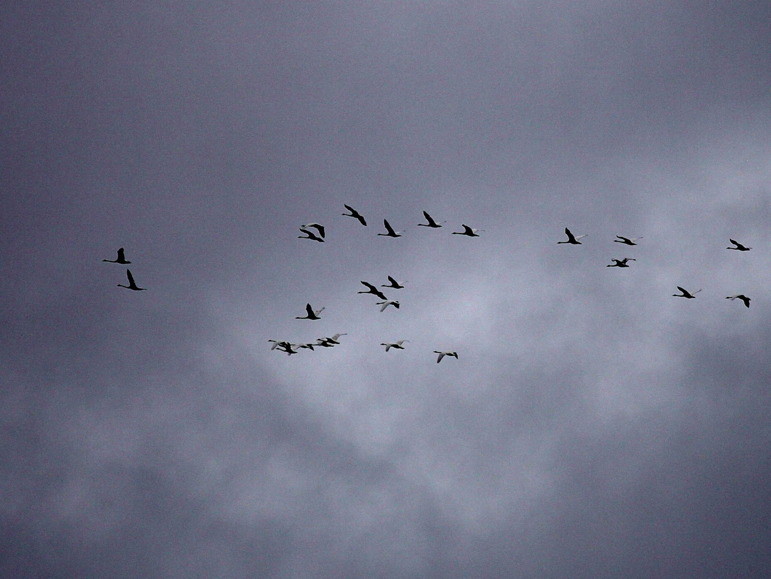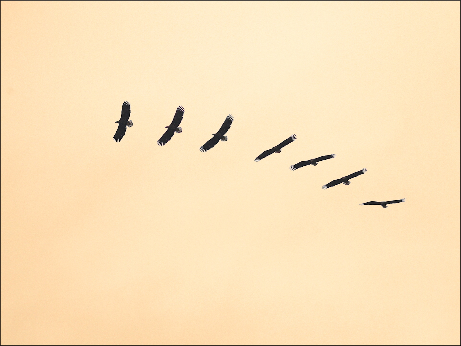 Det tutade i luften ovanför mig. Sekunderna efter passerar snabbt 25 sångsvanar, i medvind rakt norrut. Hinner i stort sett bara se baken på dem alla i kikaren, men upptäcker samtidigt ett smalt avlångt streck i fjärran, bortom flocken som avlägsnar sig. Kan med möda konstatera en havsörn på väg åt mitt håll. Den har inte bekymmer med motvinden, utan tycks snarare göra sig nytta av den i långa glidflygningar. Får fram kameran utan att släppa den ur sikte, men inser snart att mina snabba rörelser genast har uppfattats av örnblicken. Hinner med ett par sekunders bilder under den minut den visade upp sig på behörigt avstånd.