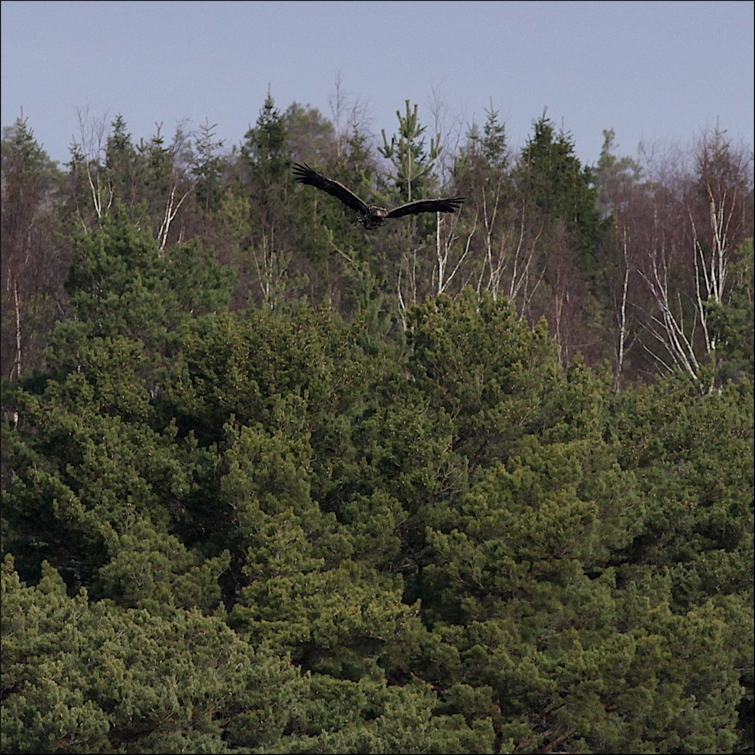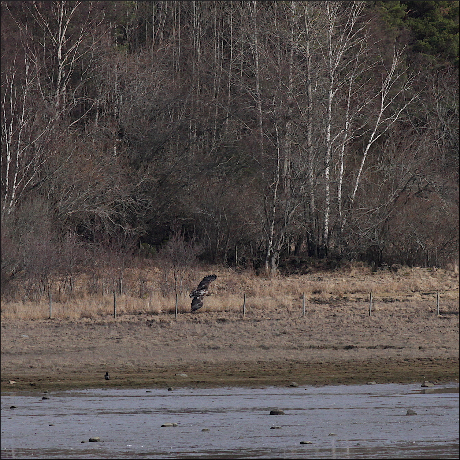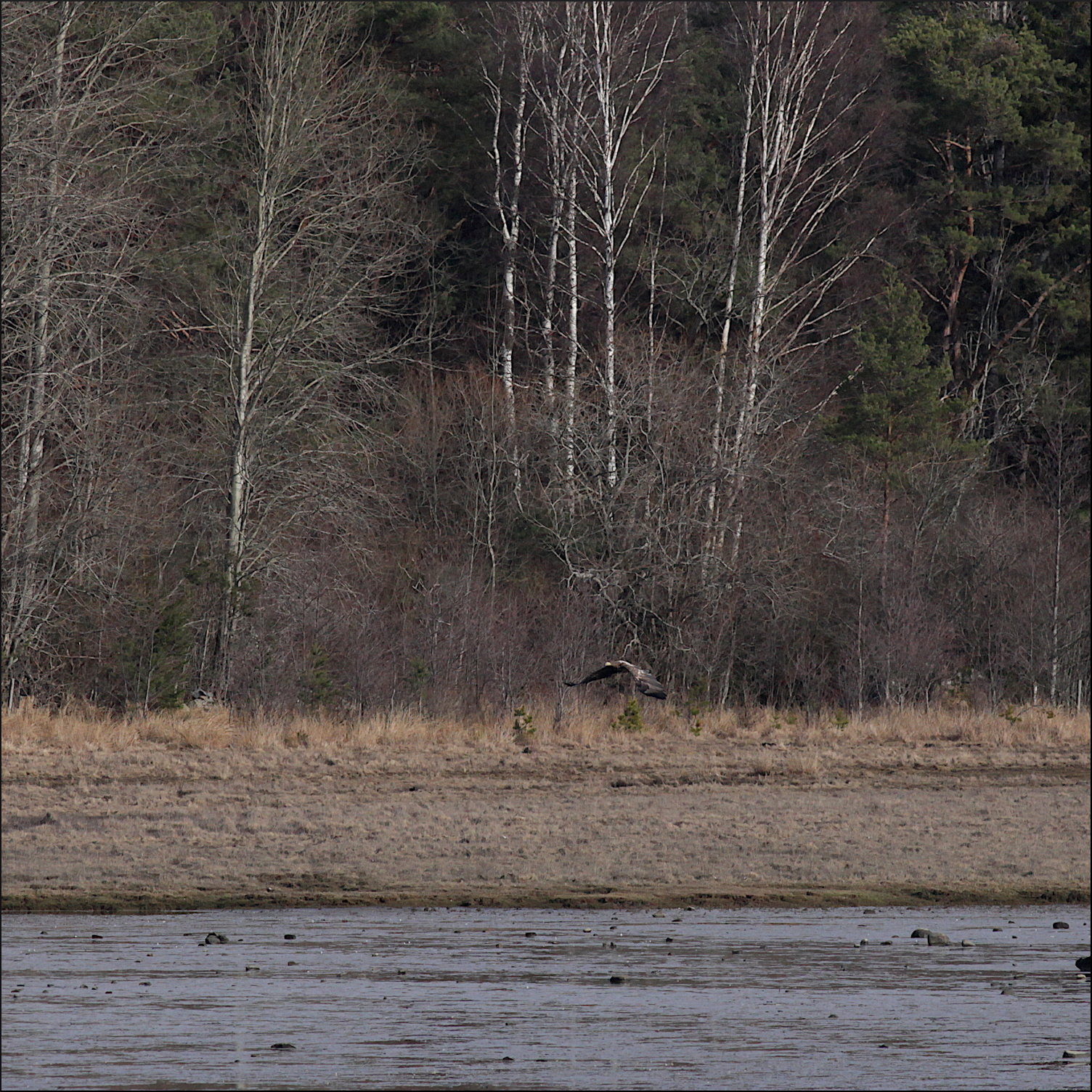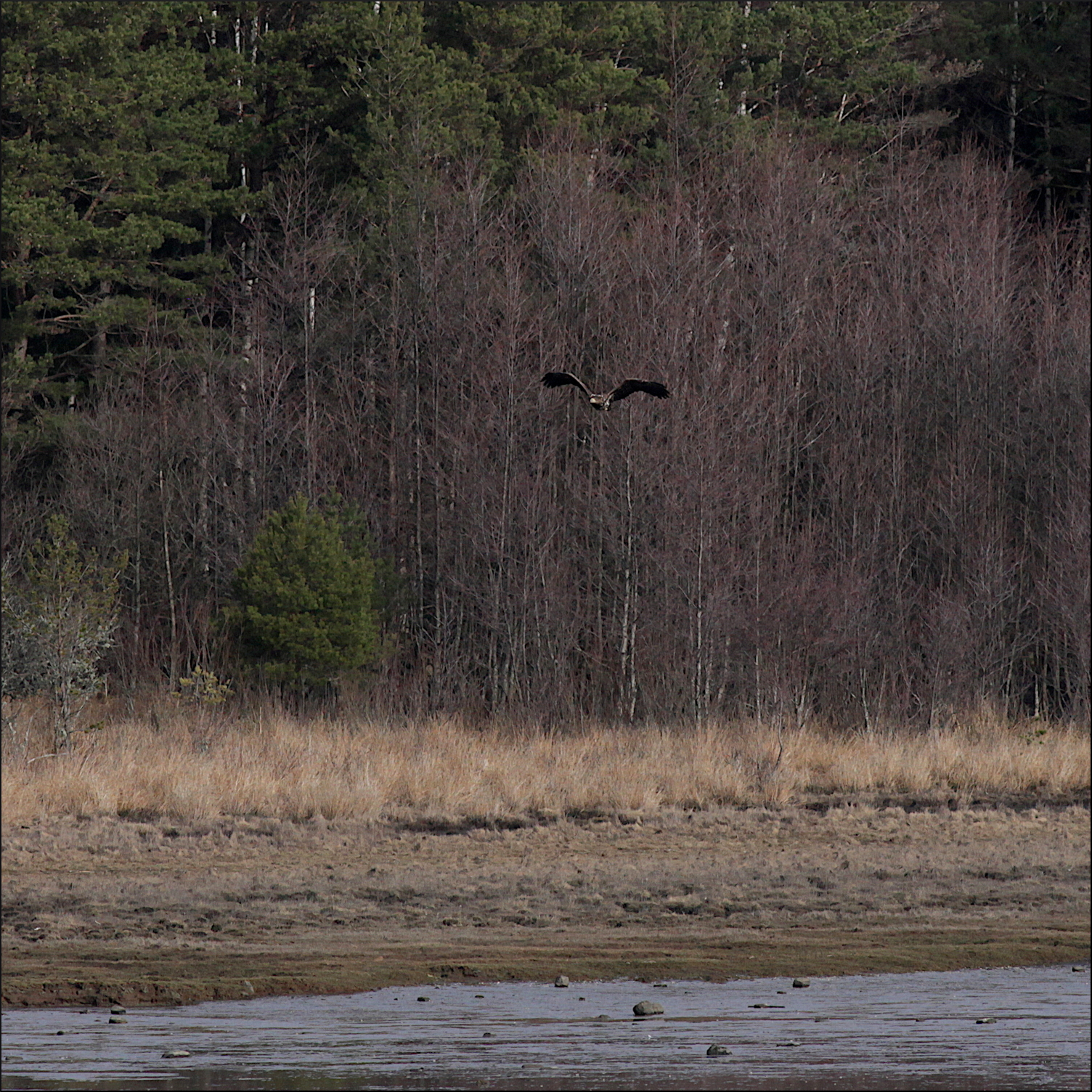 Fortfarande på behörigt avstånd gledflög havsörnen söderut, mycket fokuserad på mig med sin skarpa syn. Spanade ner mot min sida av vikens strand några gånger men hade sen fullt fokus på att smyga sig över skogskanten och kanske överraska någon and på andra sidan eller hitta en tidig havsöring i det grunda vattnet.