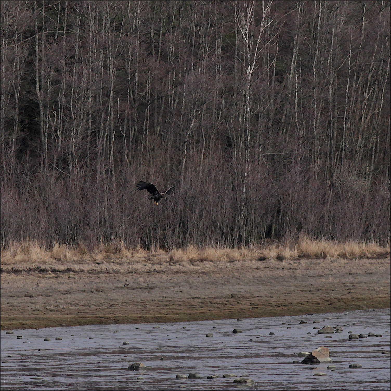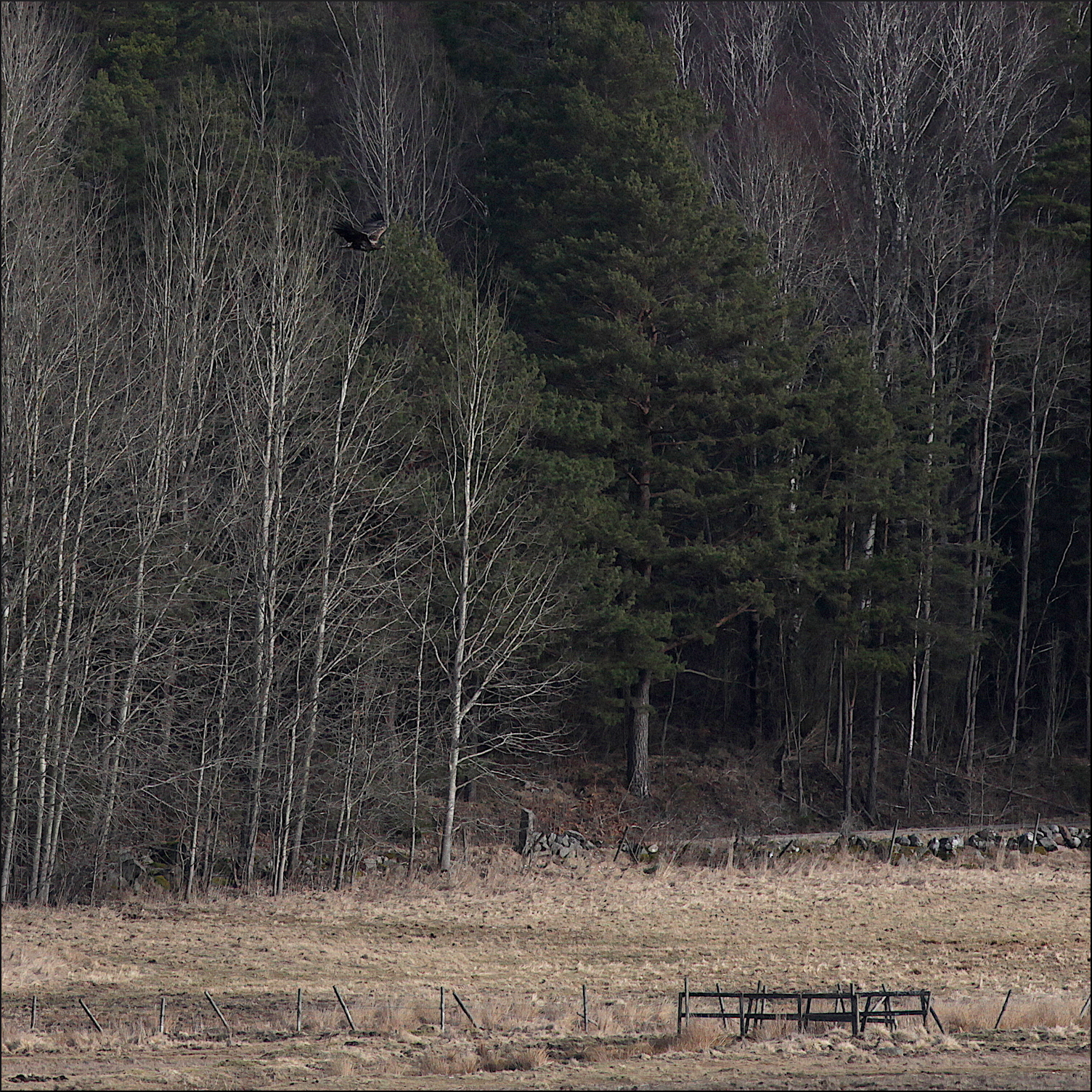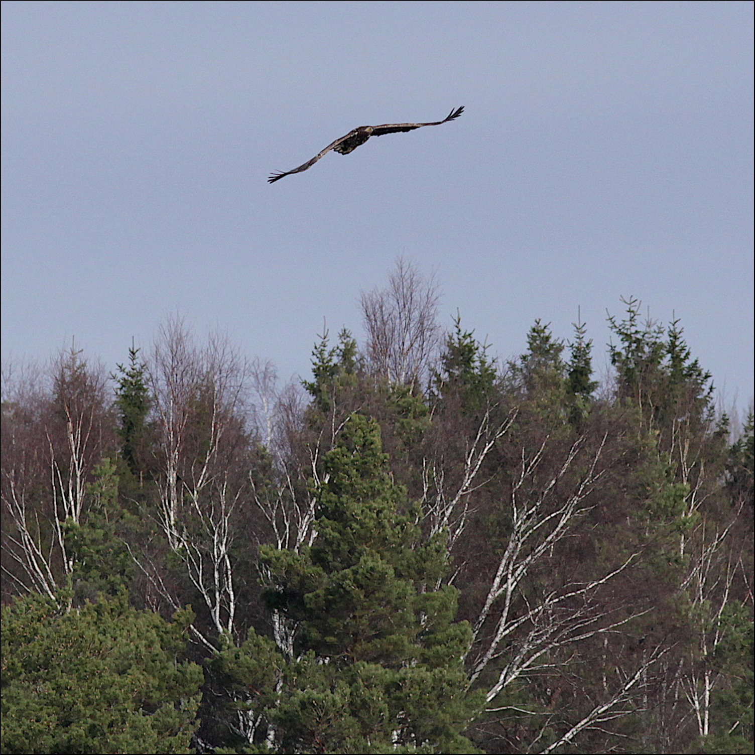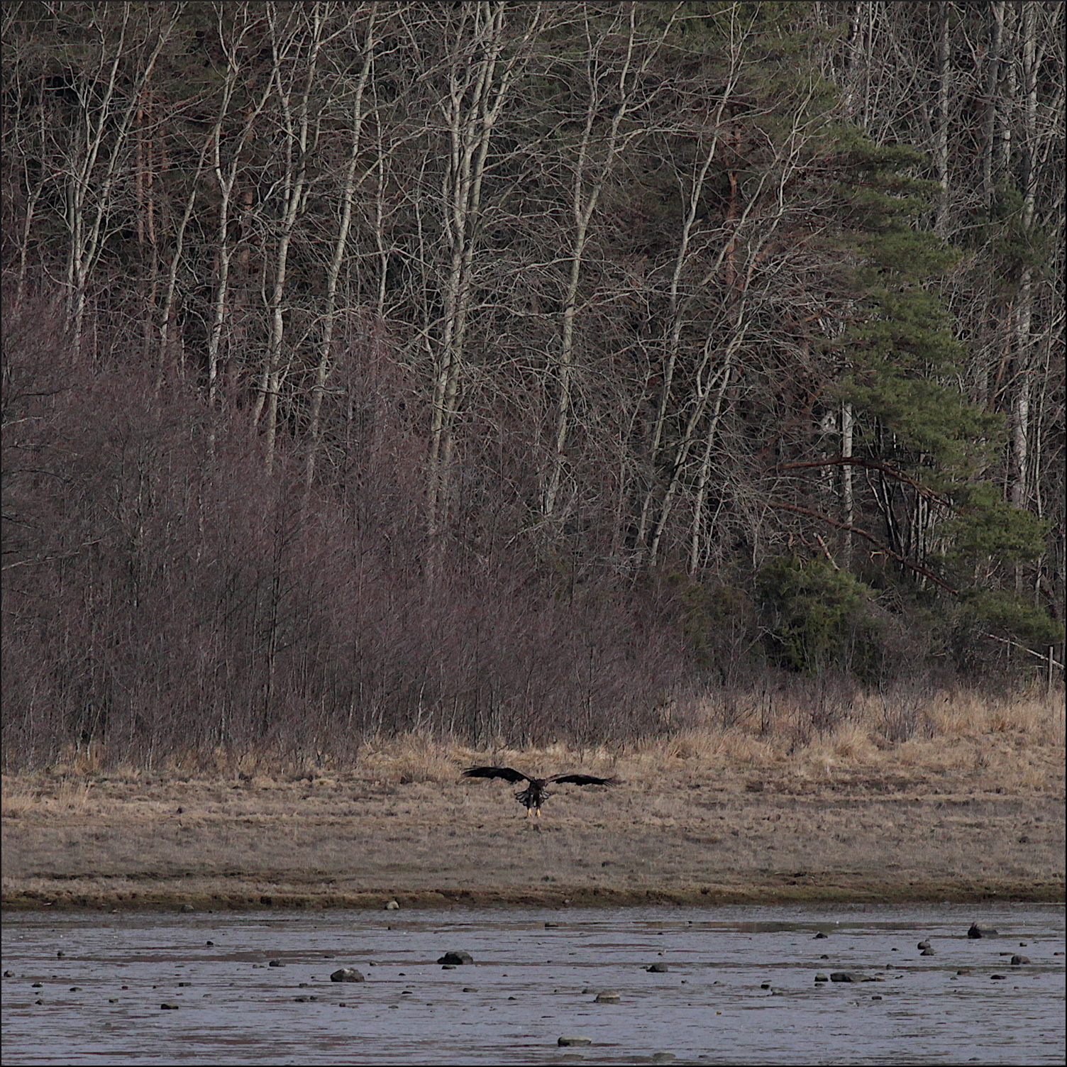 Fortfarande på behörigt avstånd gledflög havsörnen söderut, mycket fokuserad på mig med sin skarpa syn. Spanade ner mot min sida av vikens strand några gånger men hade sen fullt fokus på att smyga sig över skogskanten och kanske överraska någon and på andra sidan eller hitta en tidig havsöring i det grunda vattnet.