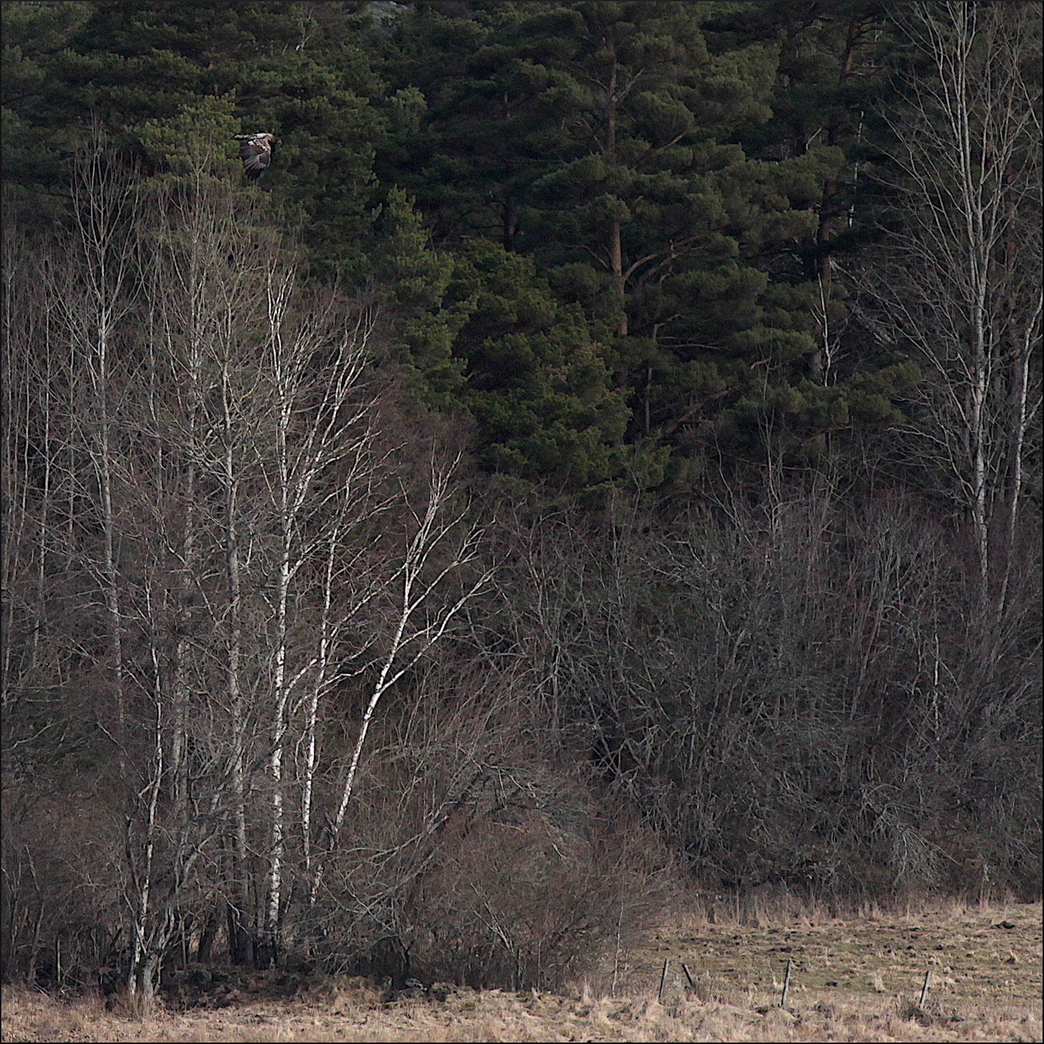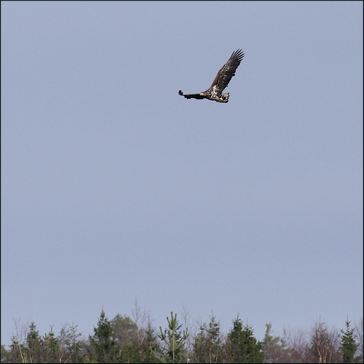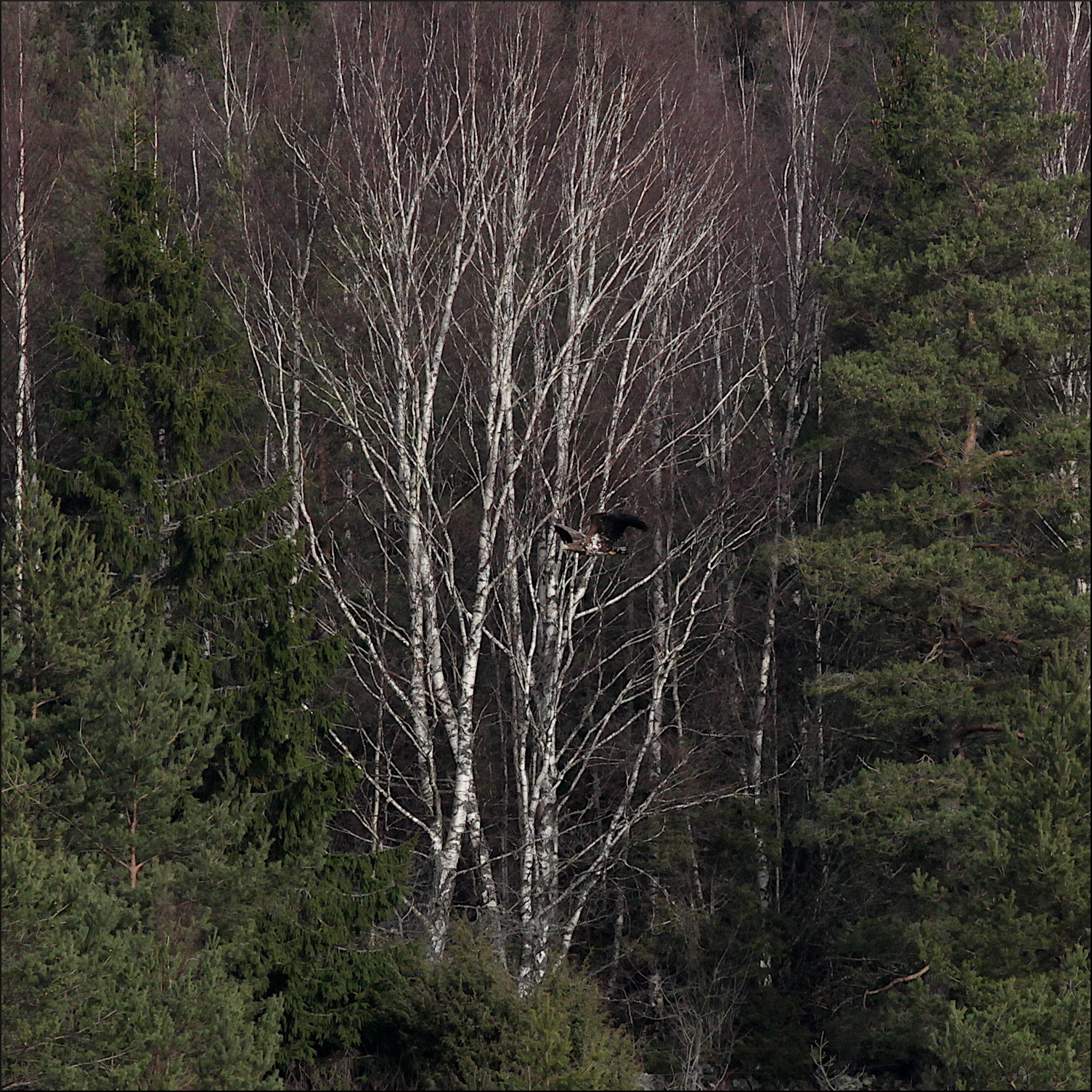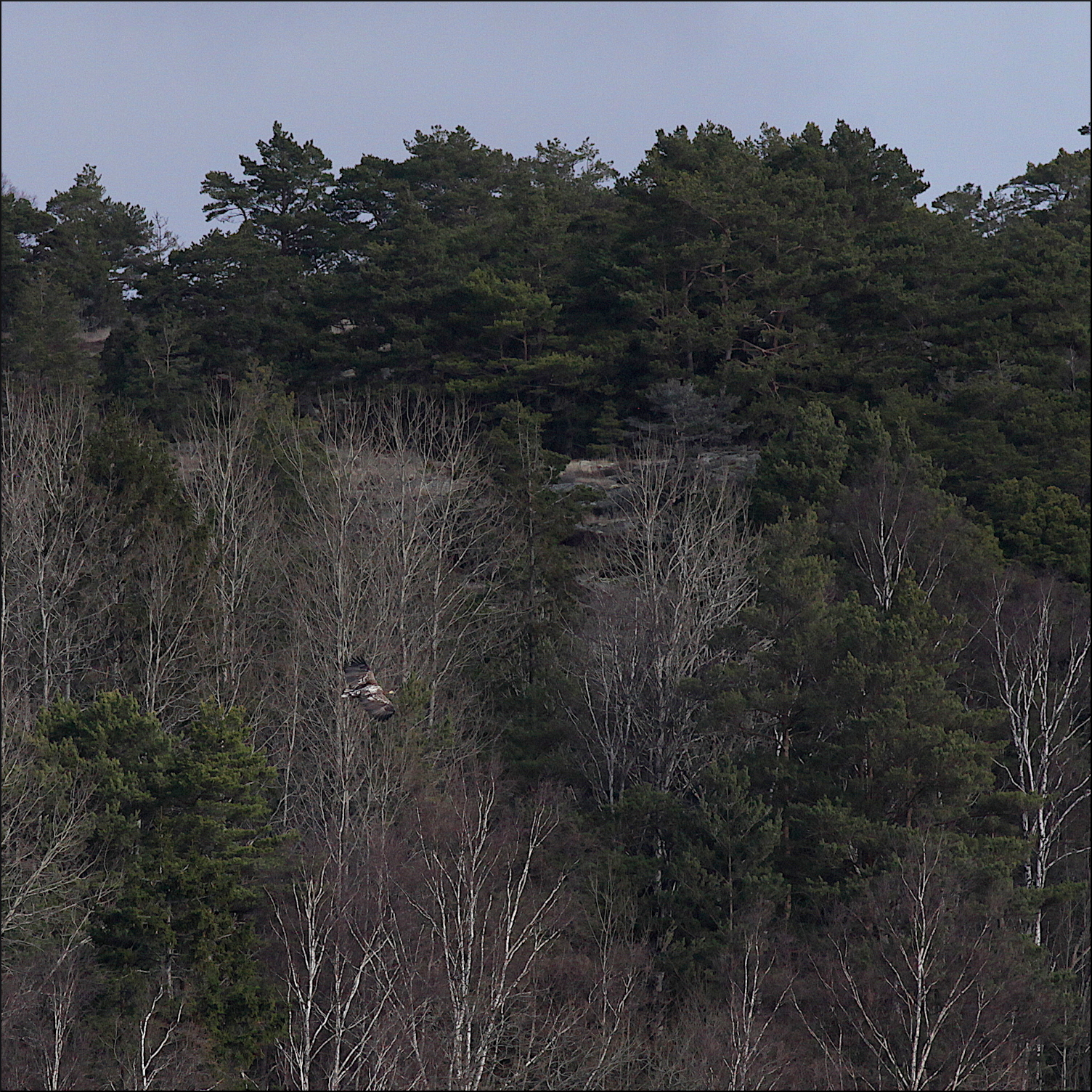 Fortfarande på behörigt avstånd gledflög havsörnen söderut, mycket fokuserad på mig med sin skarpa syn. Spanade ner mot min sida av vikens strand några gånger men hade sen fullt fokus på att smyga sig över skogskanten och kanske överraska någon and på andra sidan eller hitta en tidig havsöring i det grunda vattnet.