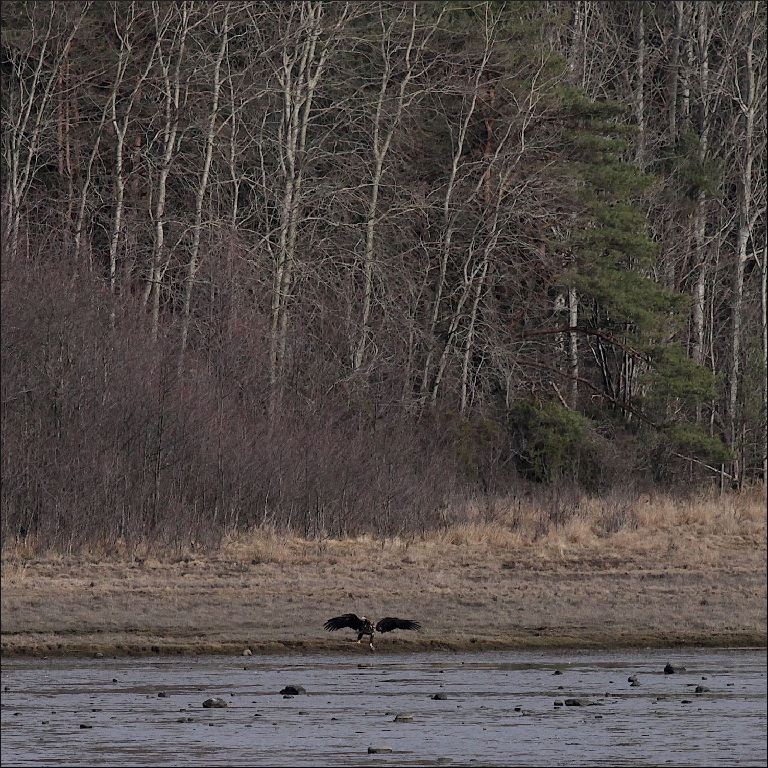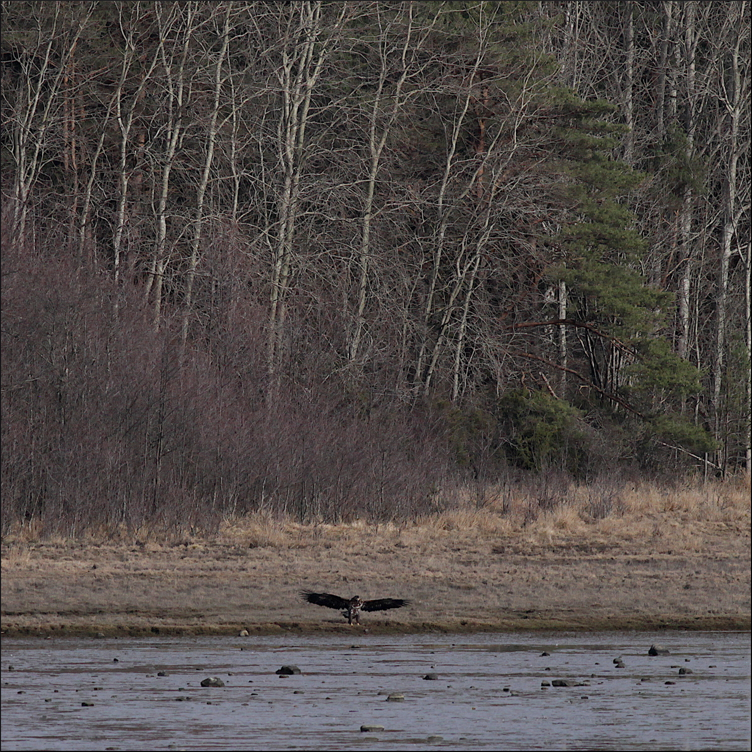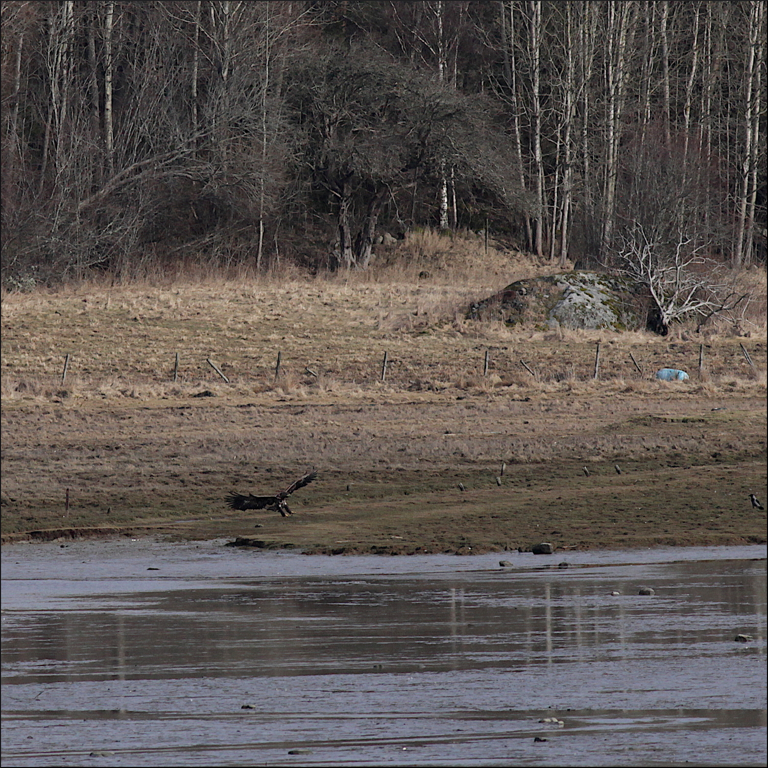 Han eller hon drog sig ner mot skogskanten och följde stranden ett ögonblick. Plötsligt fick den syn på något i kanten på leran och bestämde sig snabbt att gå ner. Knappast någon fisk i lågvattnet som var, men kanske något ätbart kadaver. Jag försökte se vad det kunde vara när örnen greppade något med ena fotens klor och försökte lyfta det.