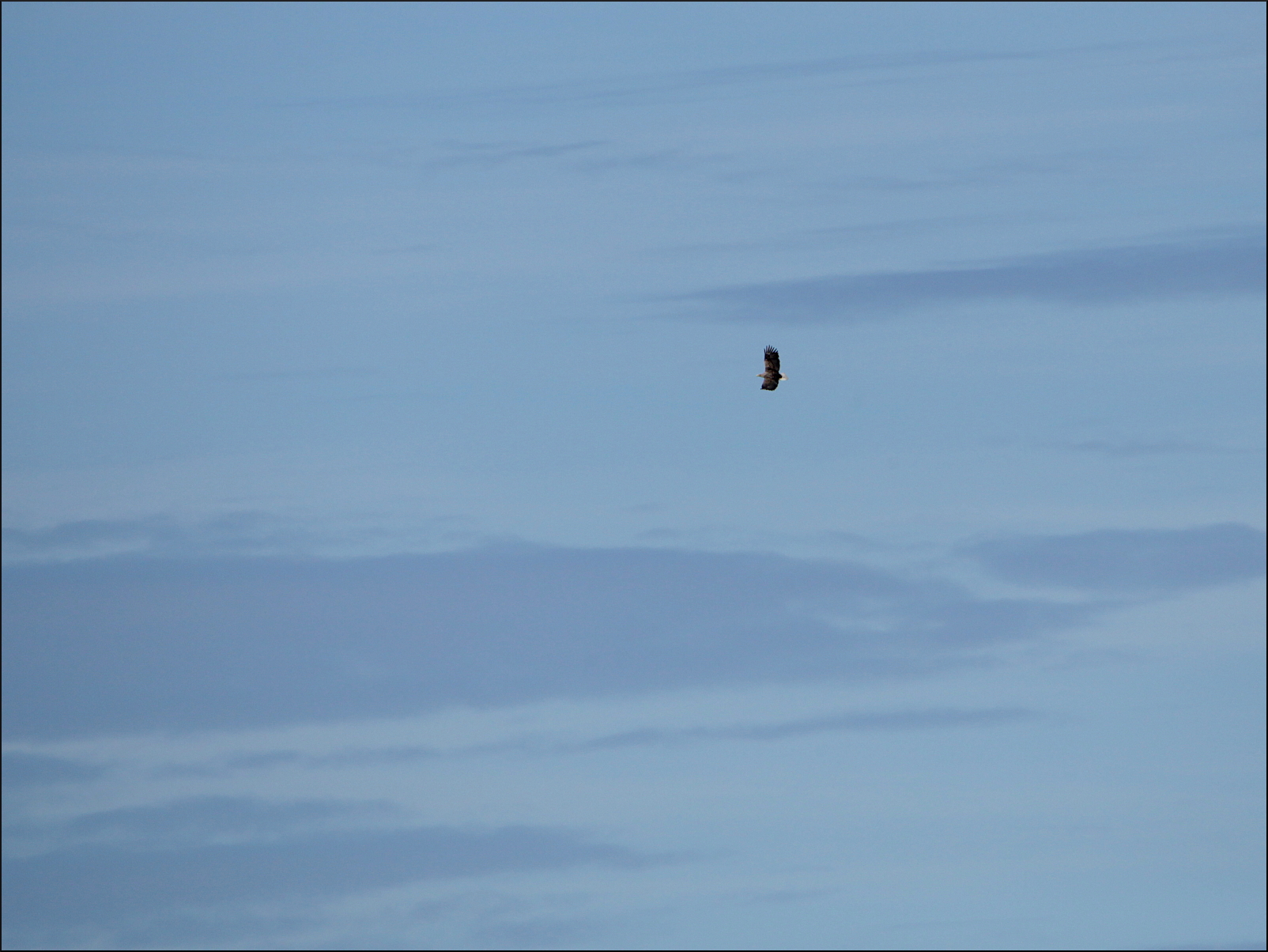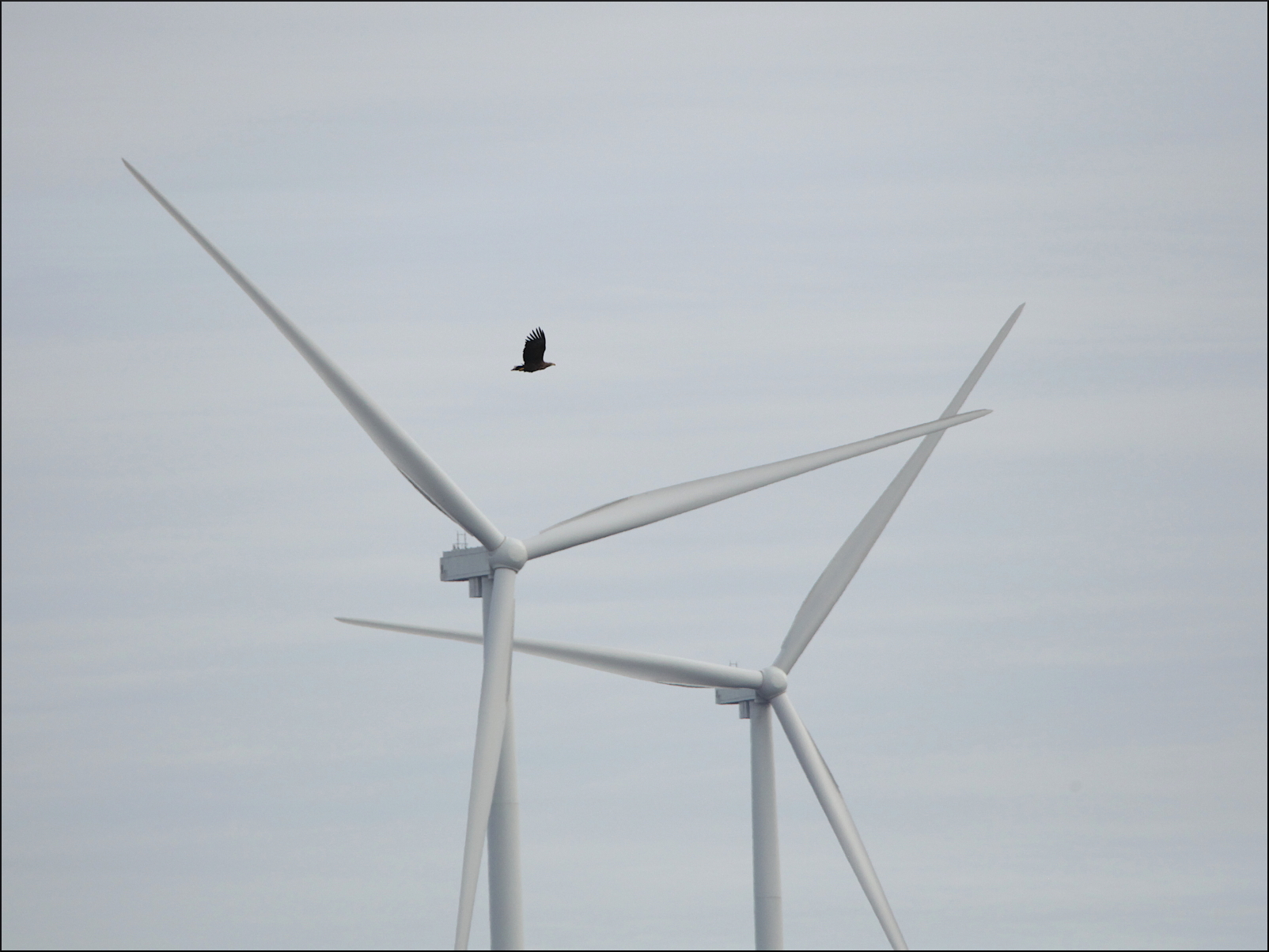 Den gamle havsörnen med kritvit stjärt tog in platsen på majestätisk manér. Först smygande över horisonten utan att bry sig om kacklet runt omkring. Manövrerade sig bort mot vindkraftverken i fjärran, men på behörigt avstånd (där bilden luras). För att sedan bara stiga upp i det blå och till synes njuta av en perfekt dag, en syn man aldrig kan tröttna på.