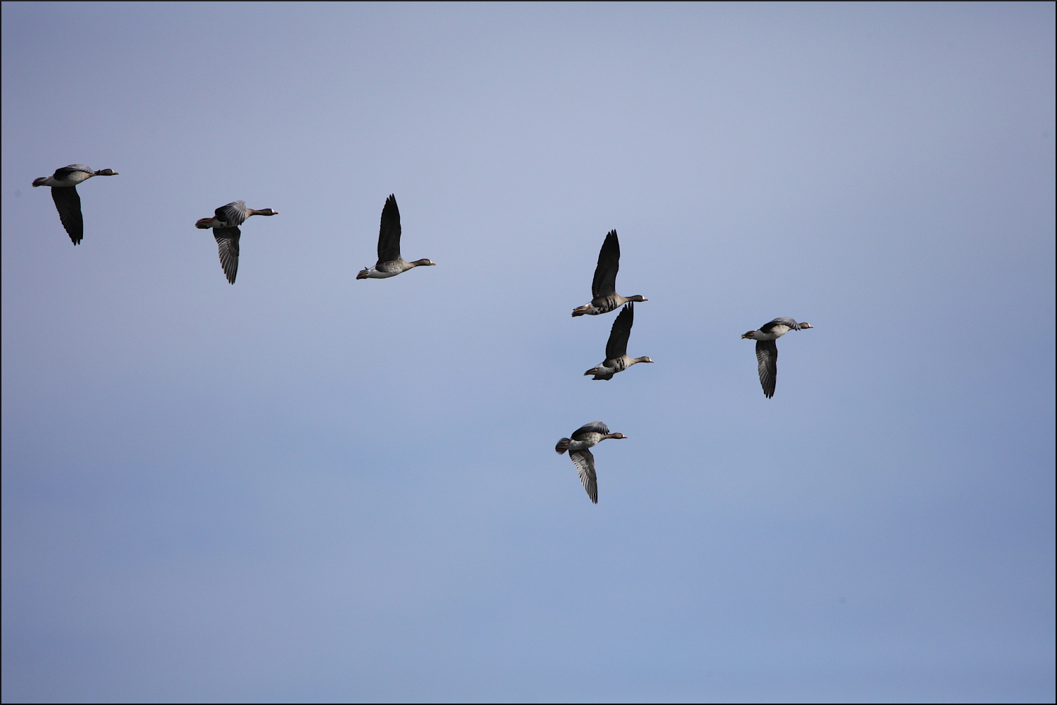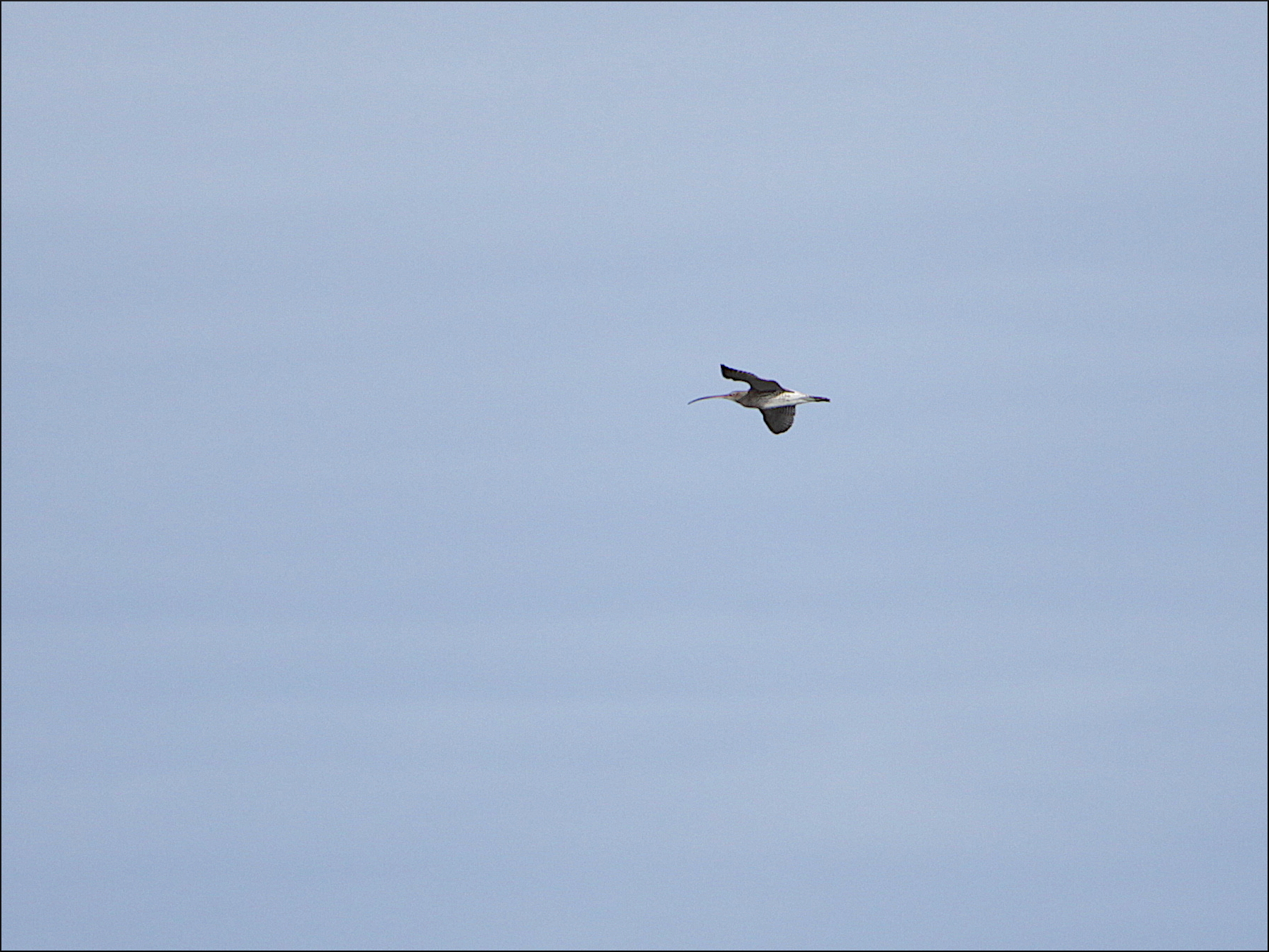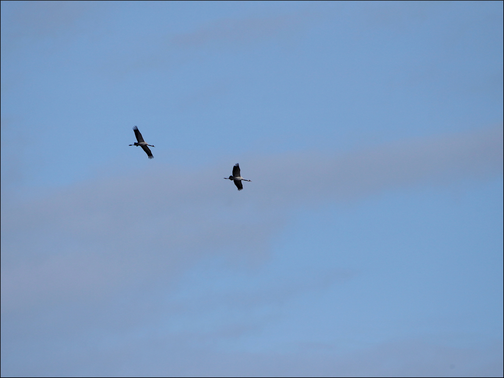 Ett par andra bredbrättade vindsurfare dök upp senare i det blå med sin karakteristiska profil, som gör det svårt att se vad som är bak och fram på håll. Tranans långa hals och dess smala långben som sticker ut väl bakom stjärten går inte att ta miste på, även om en stork skulle kunna flyga fel nån gång. En annan typisk profil är storspoven som nästan alltid avslöjar sin position med en lång utdragen vissling på hög höjd. Trots långt avstånd ser man också den riktigt långa näbben med dess typiska böj.