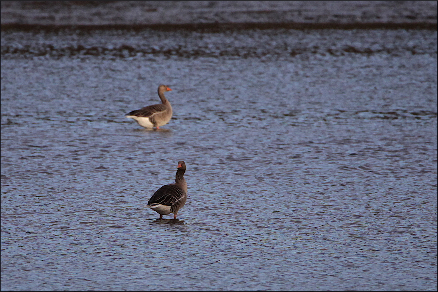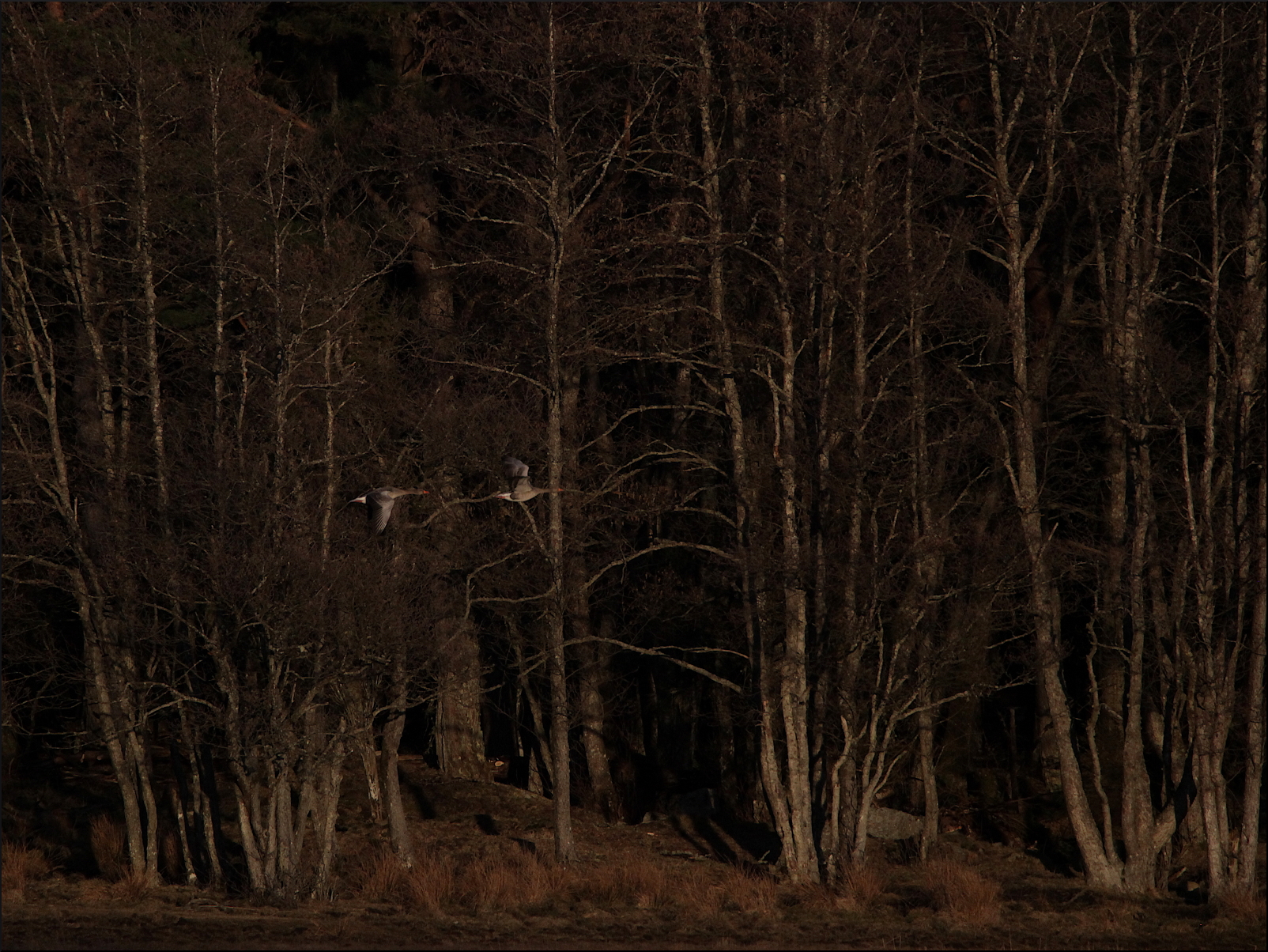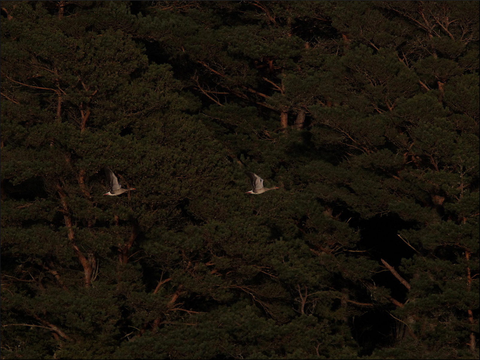 Paret grågås som funnit sin trygga plats i lågvattnets grunda del, tittar oroligt åt mitt håll, trots att jag är på behörigt avstånd. Antagligen är de osäkra på vad som rör sig i tornet framför trädens mörka scen. De börjar prata lite mer högljutt med varandra vilket är tecken på oro. Lyfter kameran reflexmässigt samtidigt som de bestämmer sig för att platsen inte längre känns säker inför natten.