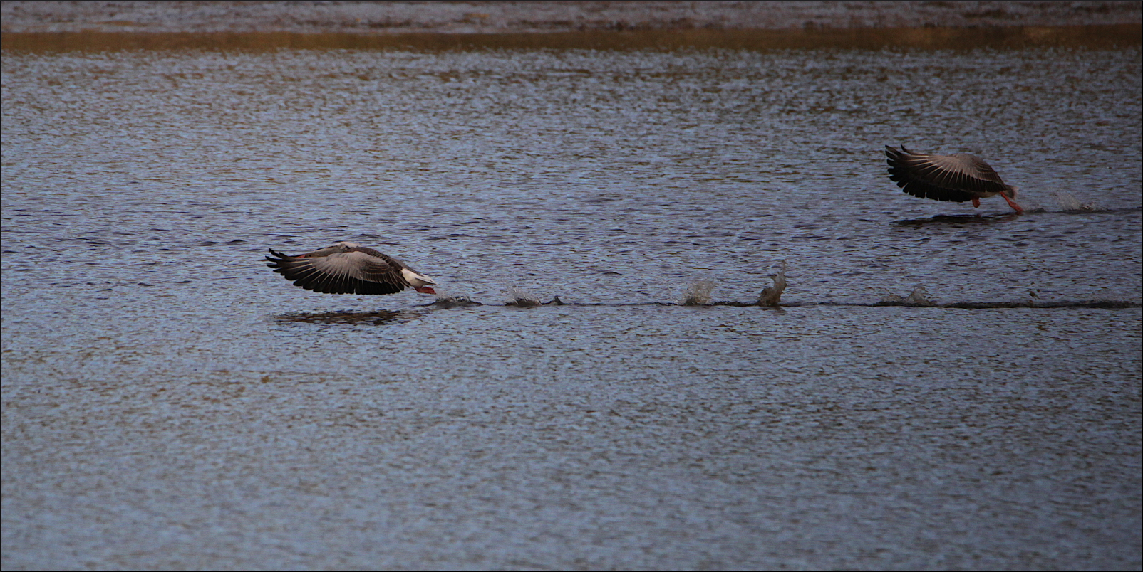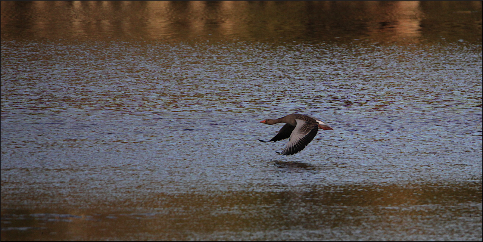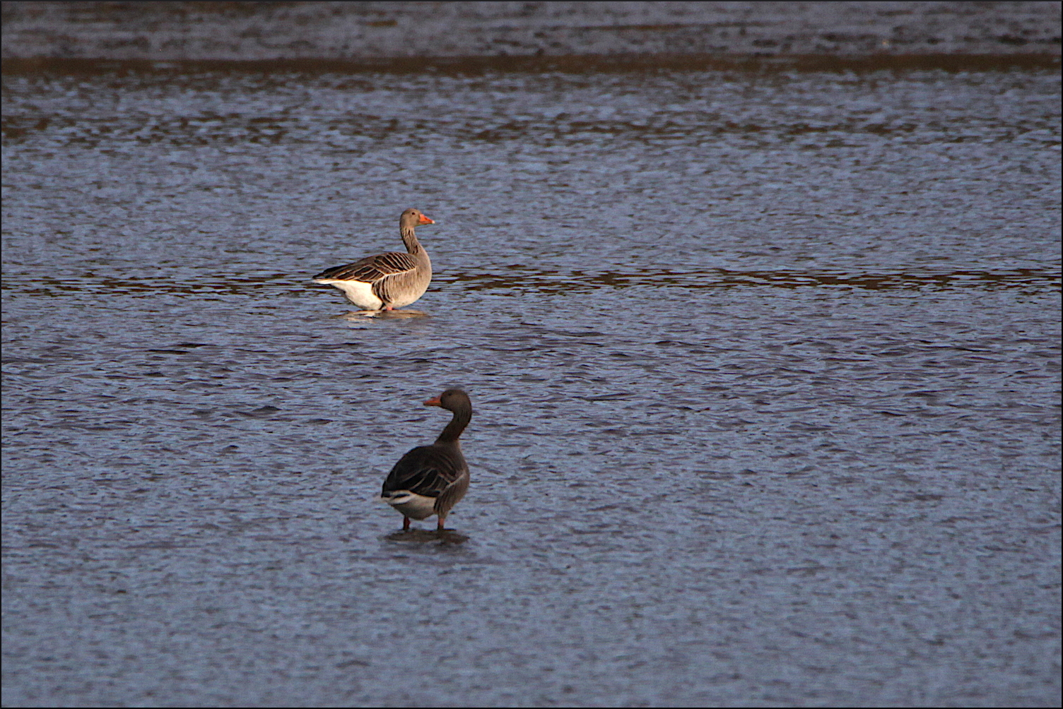 Paret grågås som funnit sin trygga plats i lågvattnets grunda del, tittar oroligt åt mitt håll, trots att jag är på behörigt avstånd. Antagligen är de osäkra på vad som rör sig i tornet framför trädens mörka scen. De börjar prata lite mer högljutt med varandra vilket är tecken på oro. Lyfter kameran reflexmässigt samtidigt som de bestämmer sig för att platsen inte längre känns säker inför natten.