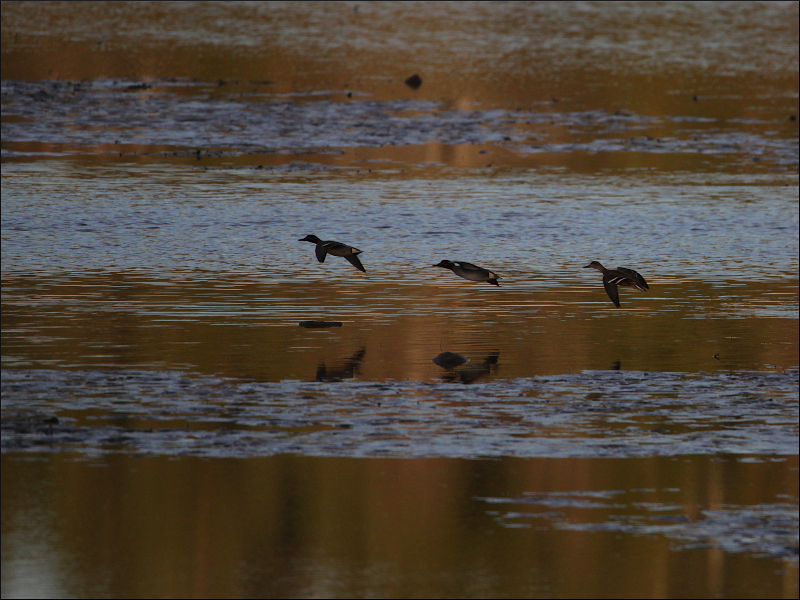 Krick-krick hörs det när tre krickor plötsligt lösgör sig i skuggan mot skogens speglingar. De smiter snabbt in bakom vassen med sikte på bäcken. Kanske släcka törsten eller ta ett kvällsbad utan salt. De första två hannarnas gula fläck på ändalyktan avslöjar deras identitet trots det svaga ljuset. Snart skall mörkret komma. Lugnt sånär som på taltrastarna som håller på att sjunga upp sig.