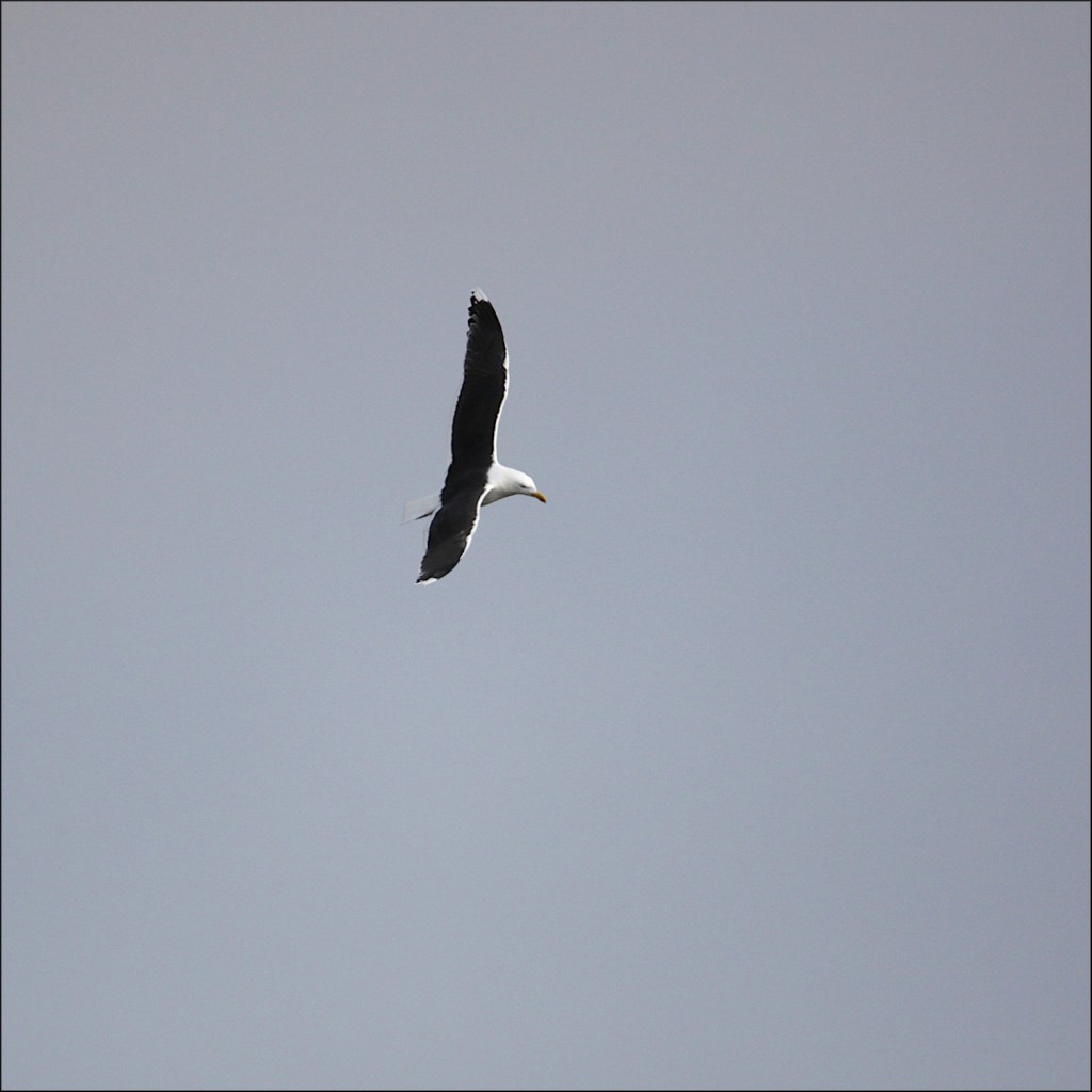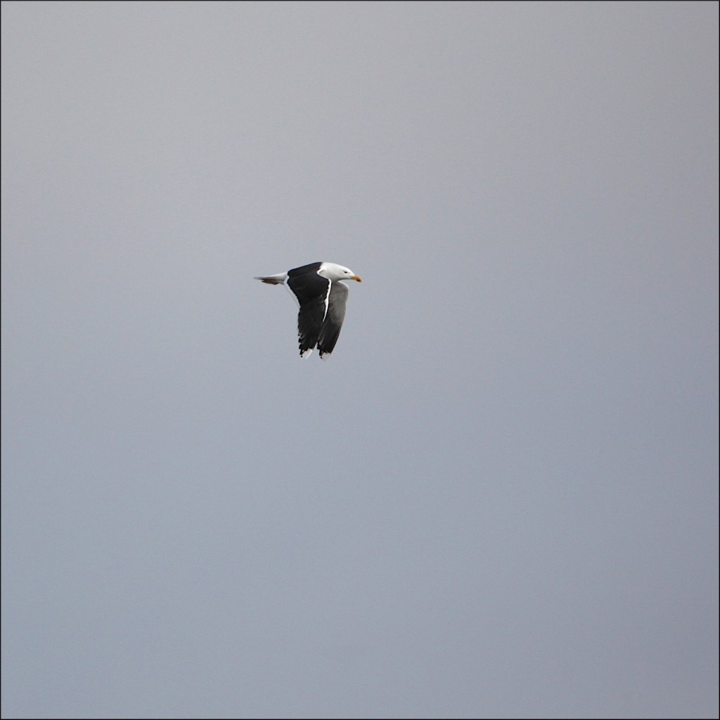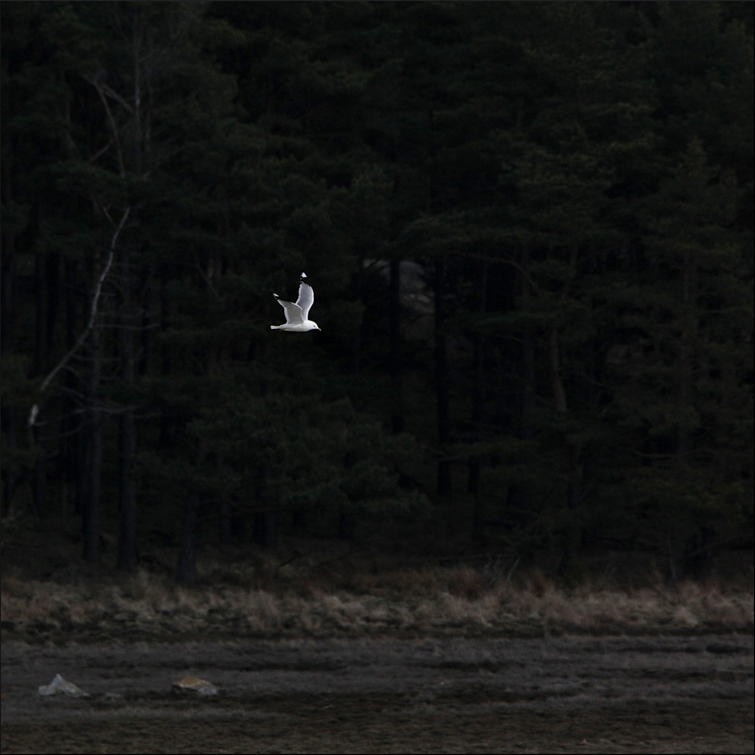 En kall sydlig vind förde mig till favoritviken för att söka lä. Solen försökte bryta igenom ibland men låga moln drev in från havet med sämre sikt och urblekta färger. Ett par nötskrikor förföljde mig verbalt till utkiken, medan trast och sparv höll på att överrösta ängarnas sånglärkor. Ett fåtal skrattmåsar och fiskmåsar rastade i viken korta stunder innan de drog vidare. En ensam sädesärla passerade snabbt i medvinden över mig, innan den smälte samman med molnen.