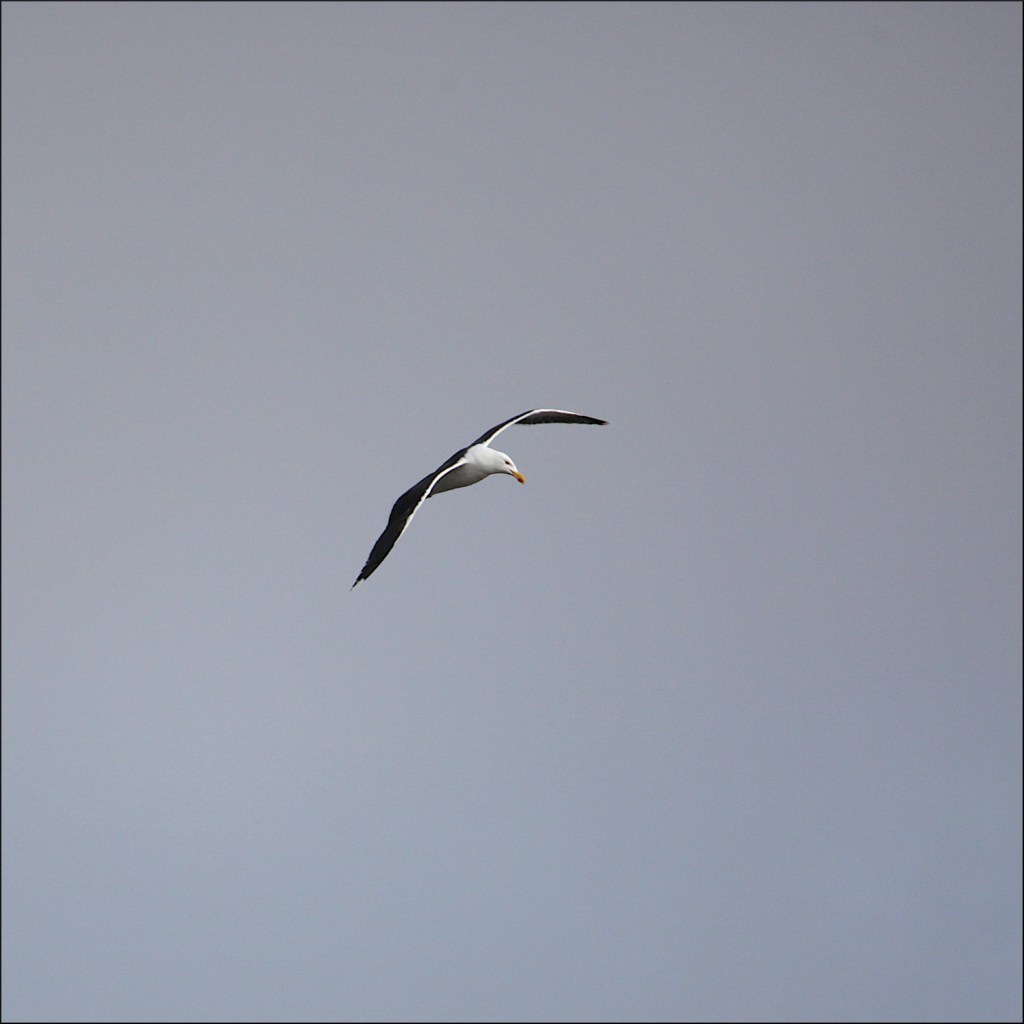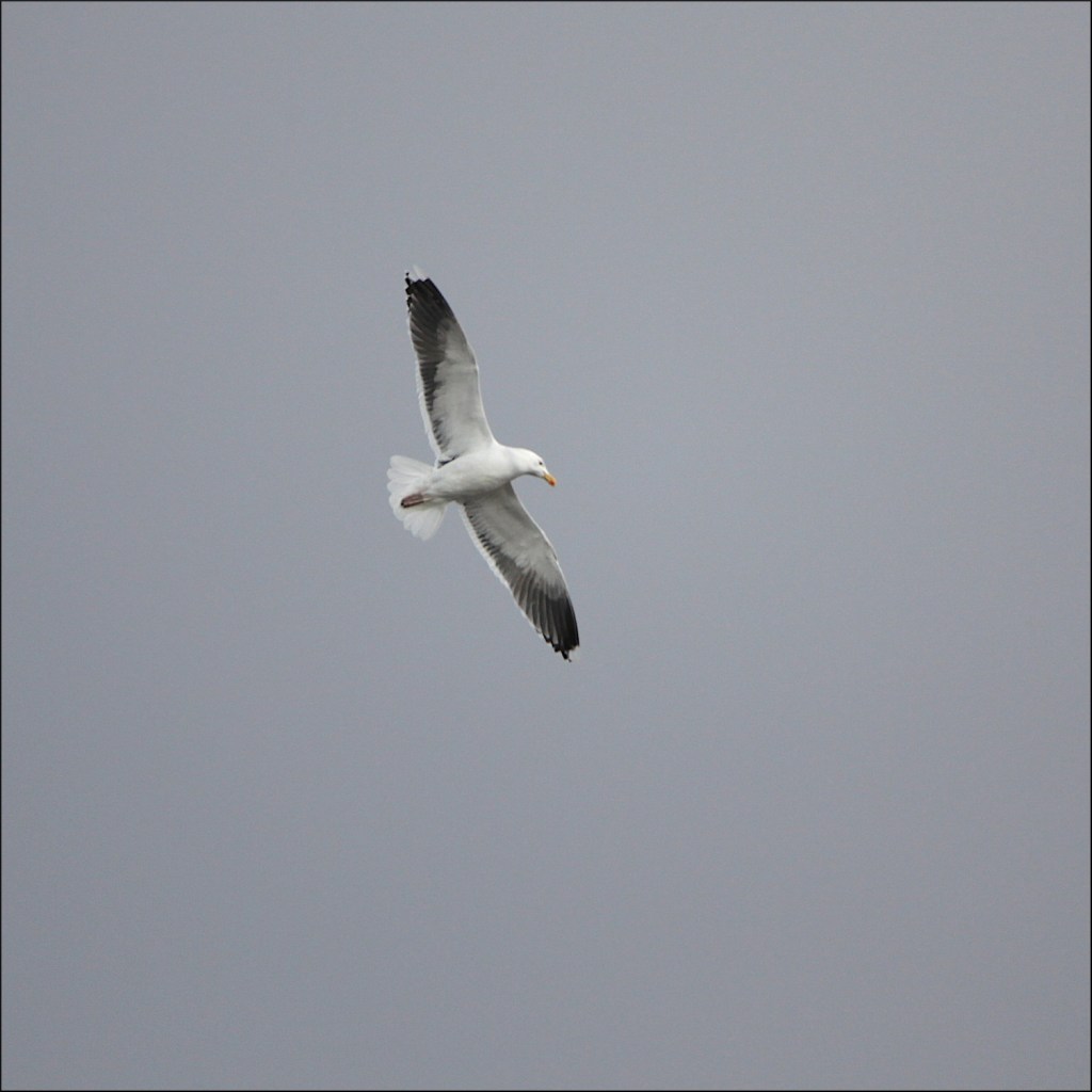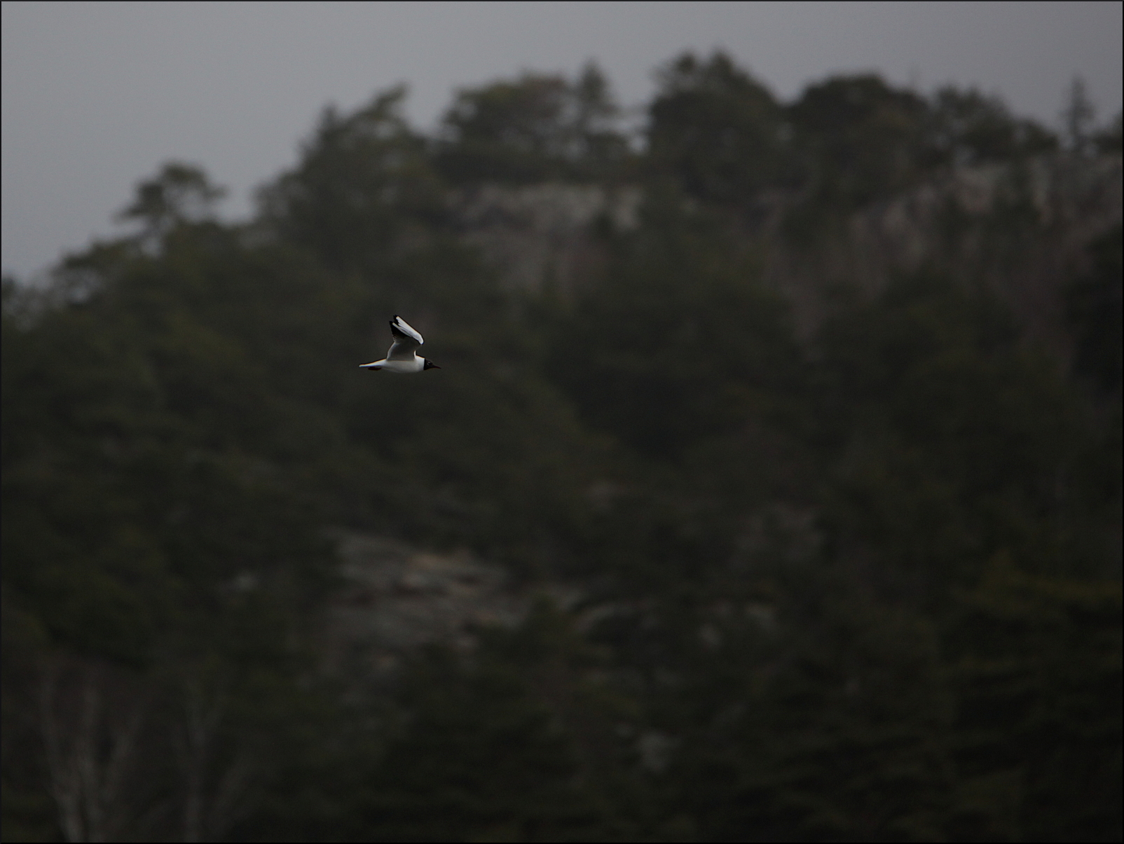 En kall sydlig vind förde mig till favoritviken för att söka lä. Solen försökte bryta igenom ibland men låga moln drev in från havet med sämre sikt och urblekta färger. Ett par nötskrikor förföljde mig verbalt till utkiken, medan trast och sparv höll på att överrösta ängarnas sånglärkor. Ett fåtal skrattmåsar och fiskmåsar rastade i viken korta stunder innan de drog vidare. En ensam sädesärla passerade snabbt i medvinden över mig, innan den smälte samman med molnen.