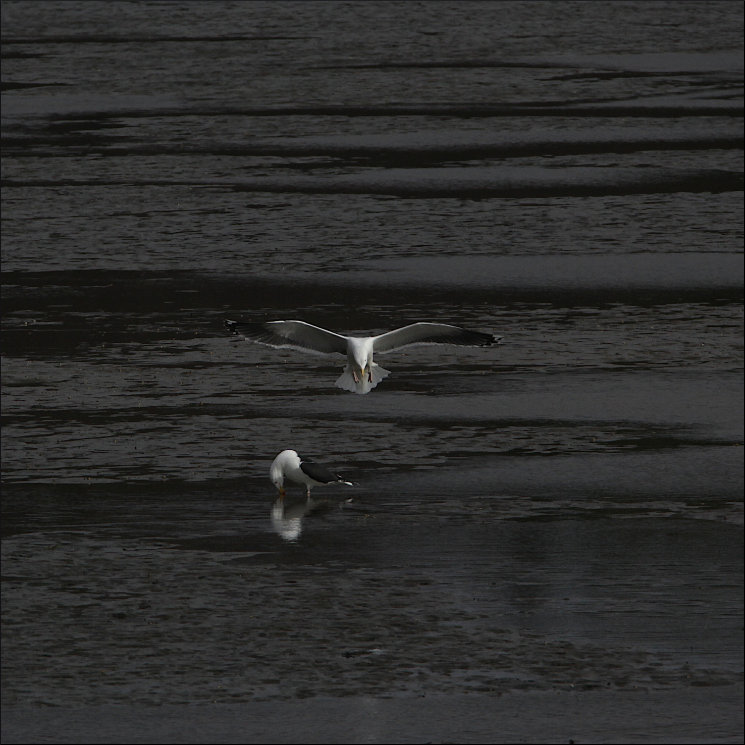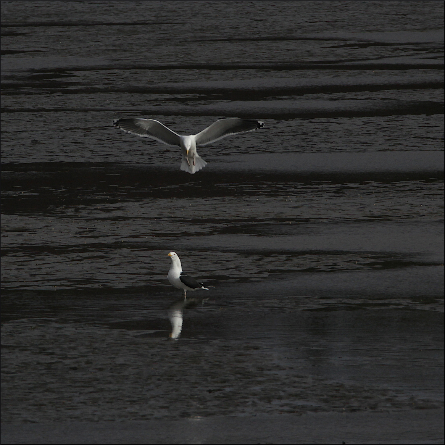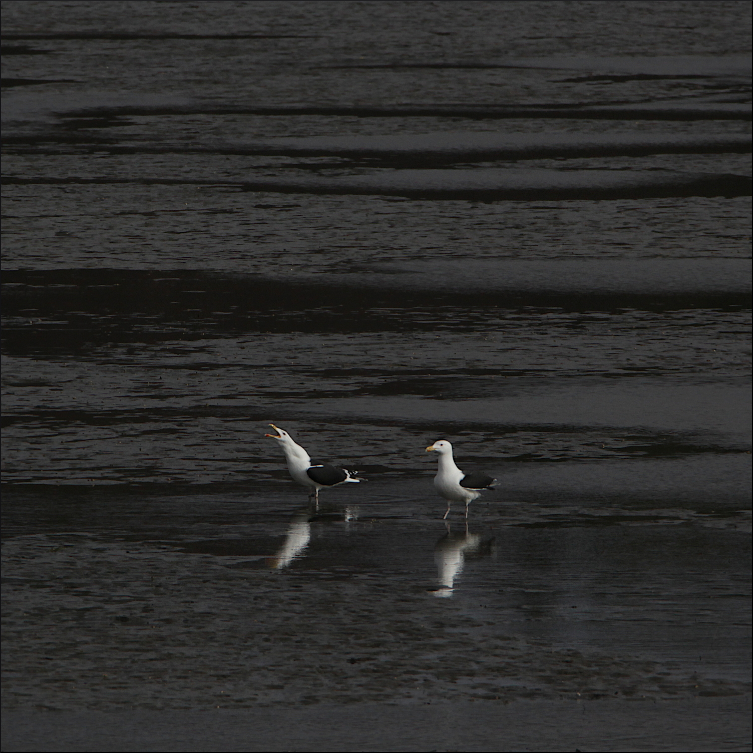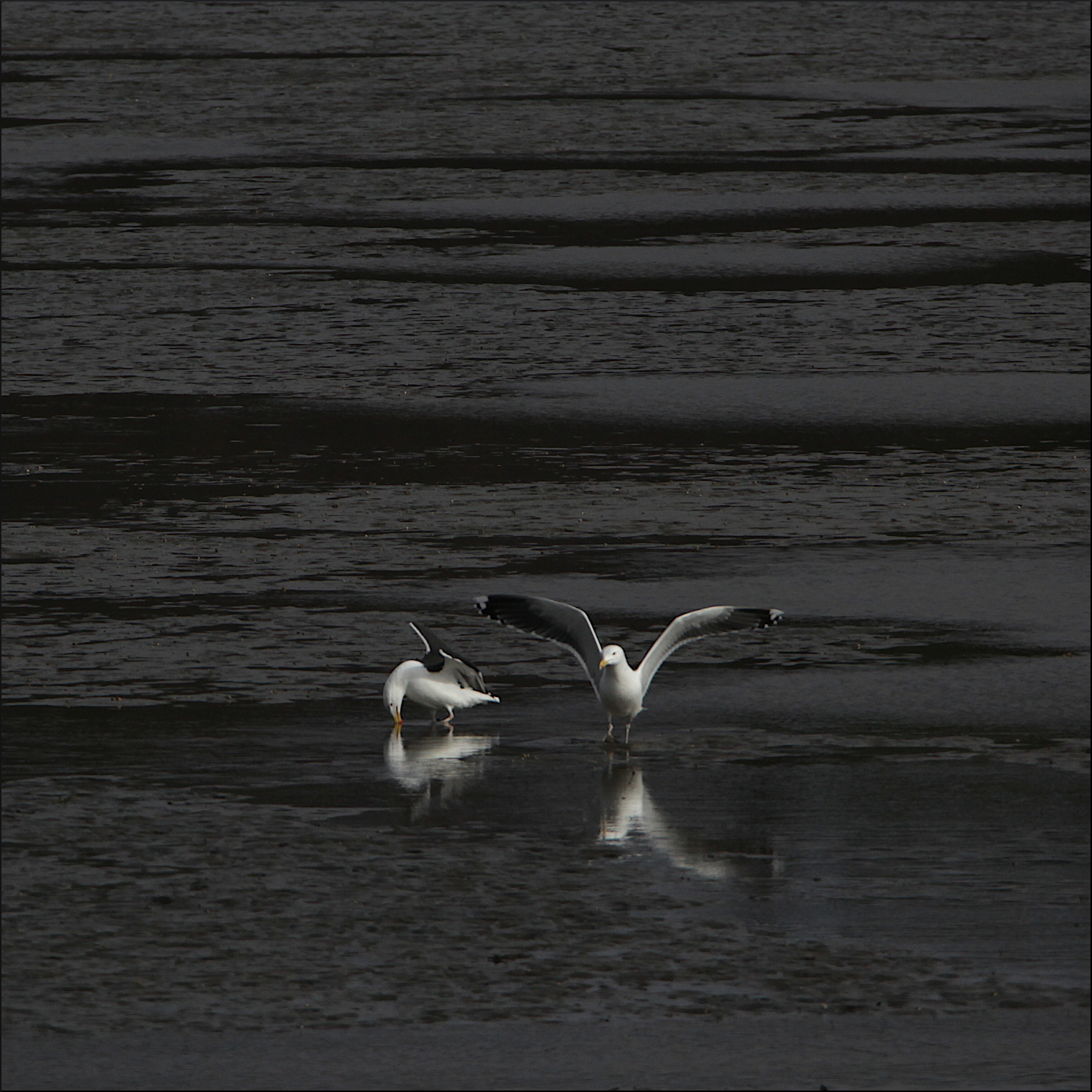 Den här dagen var det riktigt lågt vattenstånd, vilket inte passade fritidsfiskarna på premiärdagen för havsöringen på Västkusten. Havstruten har däremot inget emot den synliga leran. En i paret såg jag jobba hårt med att försöka dra upp en sandmask ur gyttjan. De är rätt långa, bort mot 20 cm och spjärnar emot i sitt U-formade hål, på typiskt havsborstmanér. Den andra parten upptäckte detta, gick ner jämte och förväntade sig kanske en bröllopsgåva detta år. Möttes istället av ett frustrerat djupt strupljud som ljöd över hela viken.