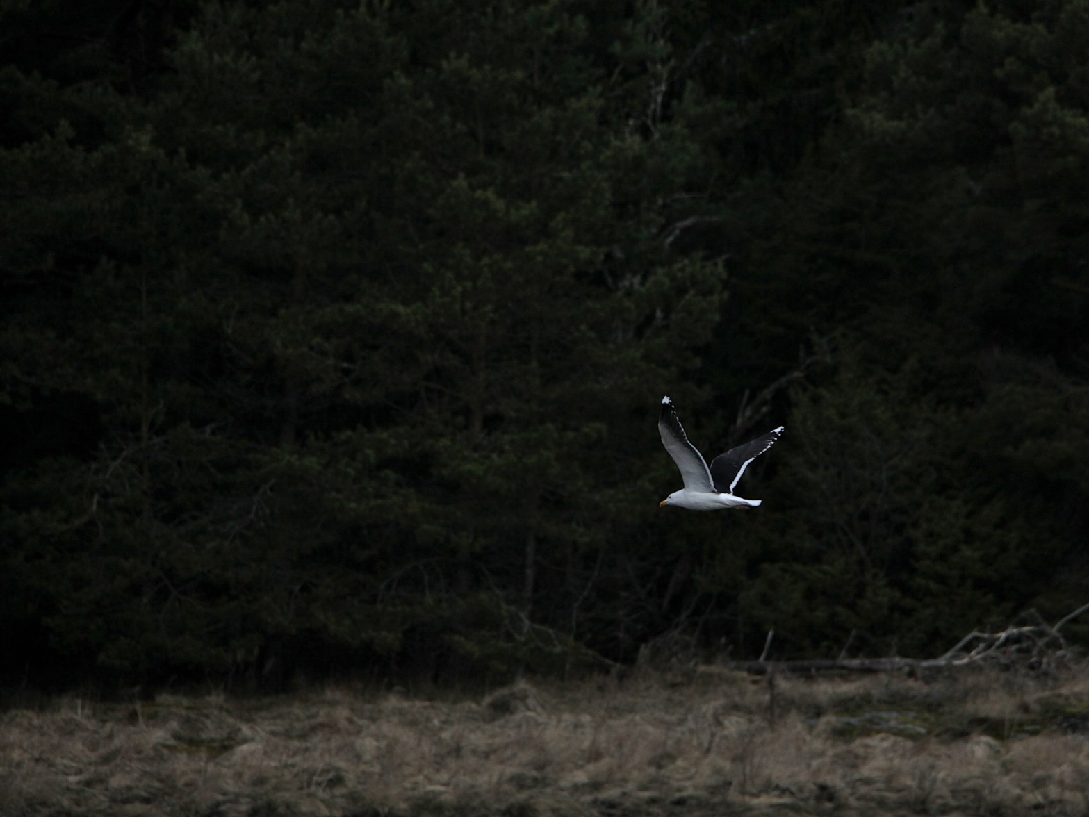 En kall sydlig vind förde mig till favoritviken för att söka lä. Solen försökte bryta igenom ibland men låga moln drev in från havet med sämre sikt och urblekta färger. Ett par nötskrikor förföljde mig verbalt till utkiken, medan trast och sparv höll på att överrösta ängarnas sånglärkor. Ett fåtal skrattmåsar och fiskmåsar rastade i viken korta stunder innan de drog vidare. En ensam sädesärla passerade snabbt i medvinden över mig, innan den smälte samman med molnen.