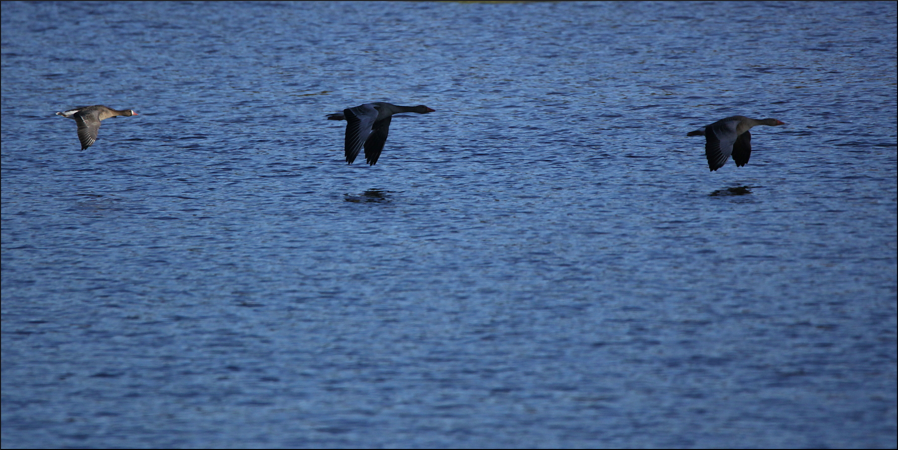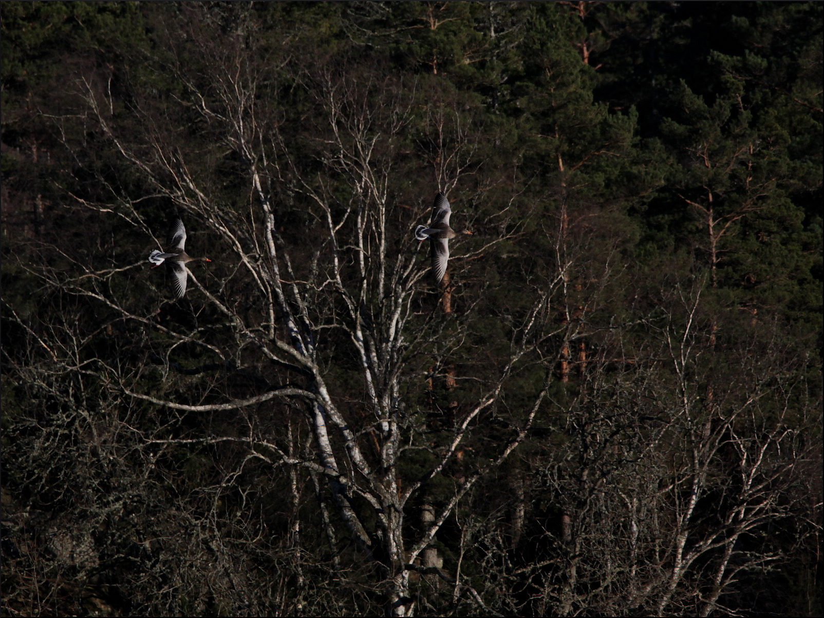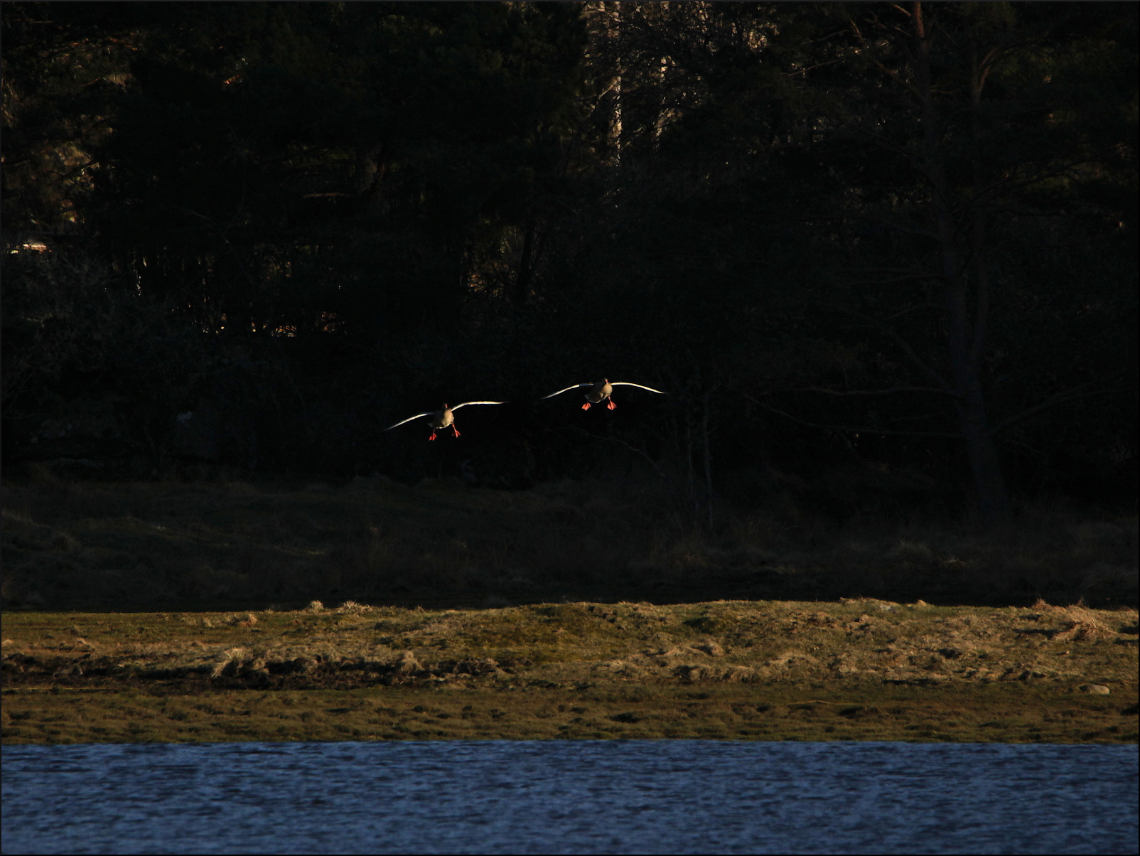 Vattnet faller mer och mer i skugga. Ett grågåspar bestämmer sig för att utnyttja de sista solstrålarna på andra sidans strandkant. En rävfri plats kanske med tanke på att det ligger ett fritidshus precis bakom dem. En bläsgås verkar inte chansa utan tar rygg på ett annat grågåspar som drar ut ur viken
