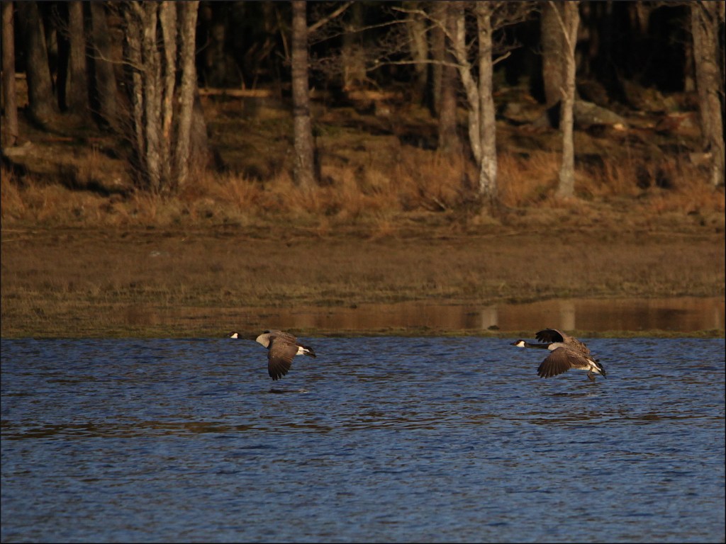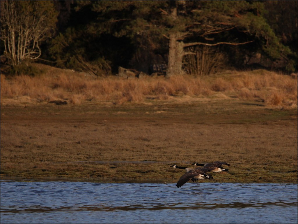 Grågåsparet på andra sidan får sällskap av ett par, ovanligt tystlåtna kanadagäss. Betar lite i den sista kvällsolen på behörigt avstånd från varandra, men fyra par ögon ser bättre än två par.