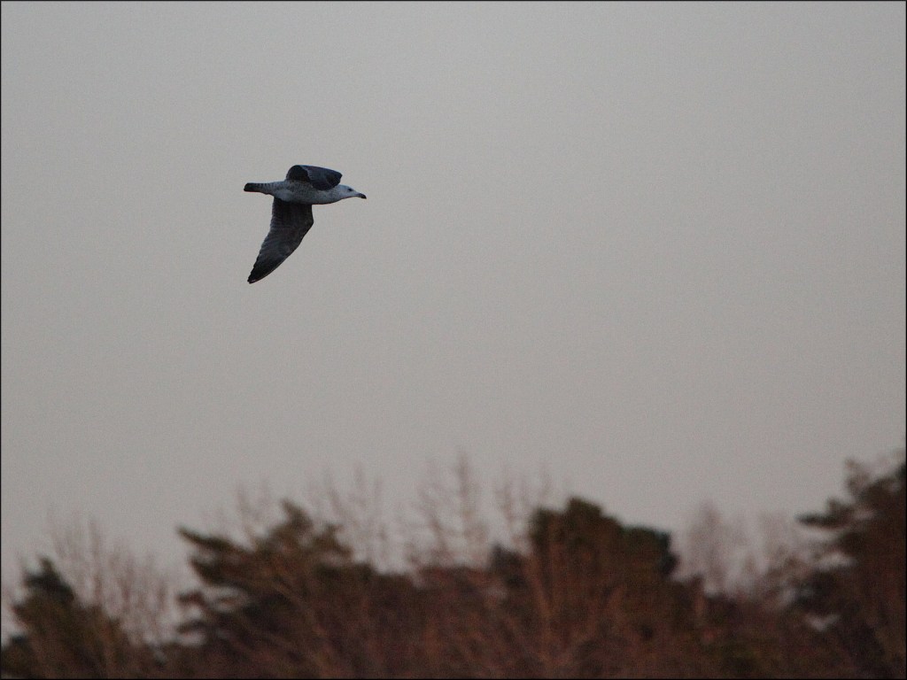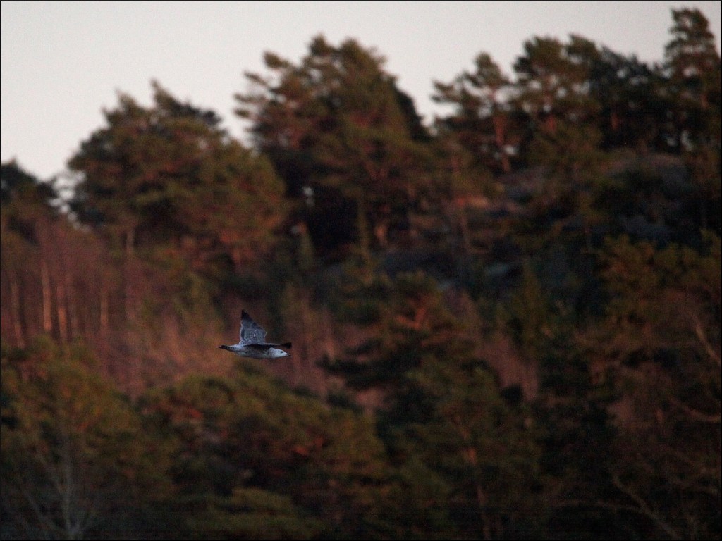 Innan skogen faller in i skugga totalt glider en ung havstrut förbi. Antagligen sista chansen att hitta något att stilla hungern med inför natten, för en som fortfarande har mycket att lära, nu på sin hemmaplan igen.