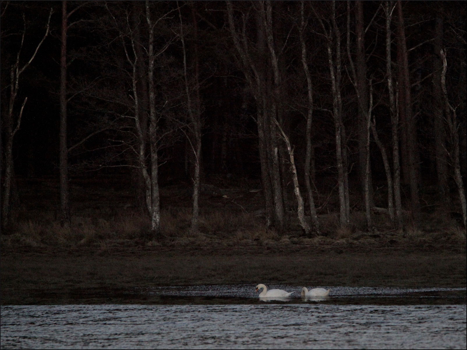 Knölsvansparet hade nästan obemärkt kommit simmande in i viken, i skydd av mörkret på andra sidan. De tycktes hitta några vegetabilier till kvällsmålet och brydde sig föga om att de vanligtvis kacklande kusinerna som huserade på samma strand. Och mörkret skulle falla igen…..