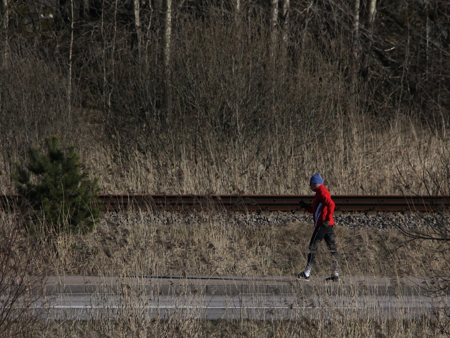 Den tredje dagen var kylig, bara ett par plusgrader på morgonen och solen värmde knappt i den kalla vinden från sydost. Även skogen var tystare, till att börja med. Kunde därför urskilja ett par bergfinkar som stannat till, troligtvis på väg mot norr. Jag fortsätter dock envist i mitt projekt, på samma vis som min kompis i rött ovan, gör på sitt sätt. Han tränar gång flera gånger i veckan, snart fyllda 75 år, och håller en fart som jag aldrig hade matchat när jag själv joggade för några år sedan.