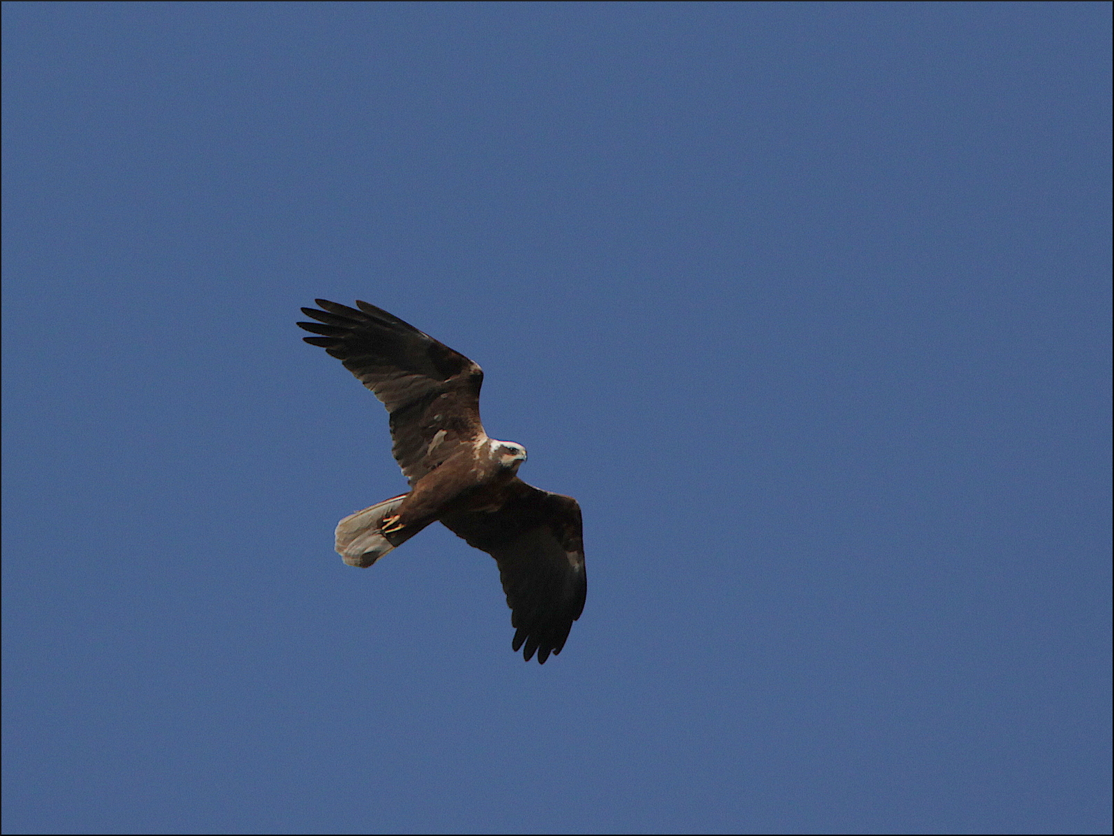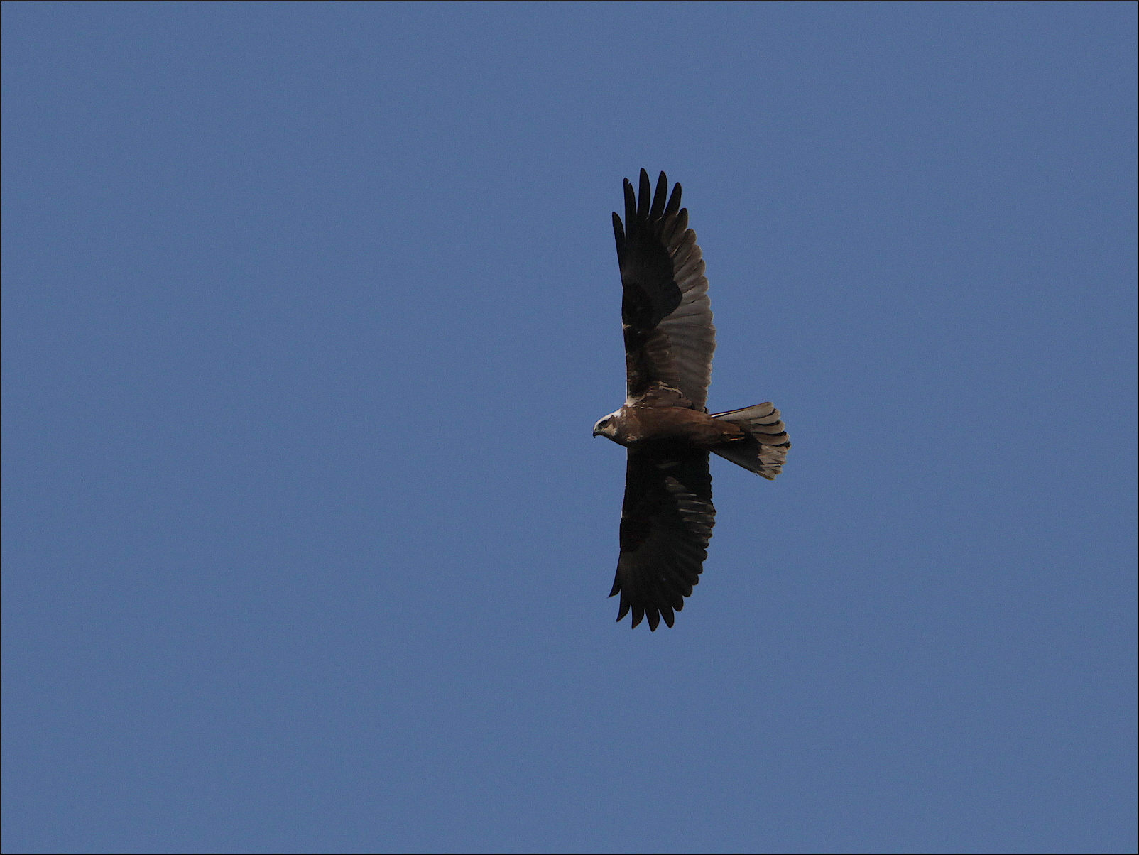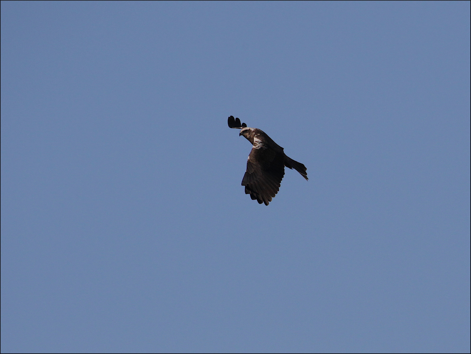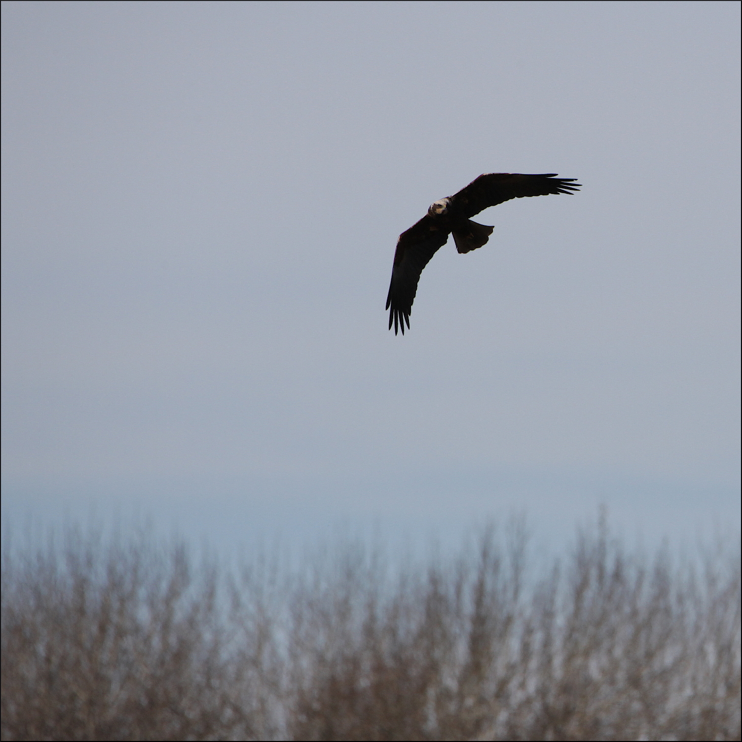 En av de högljudda kråkorna uppmärksammade mig på en bekant profil som dök upp bakom berget på andra sidan. Skarpt vinklade vingar och ett gräddfärgat huvud var det enda jag såg först. Den kom åt mitt håll på lite höjd över ängen, misstog kärrhöken nästan för ormvråk ett tag medan kameran gick varm. Det var en gammal hona av brun kärrhök visade det sig, när den var tillräckligt nära för att avslöja teckning på huvud och de vita fälten på vingarnas framkant.