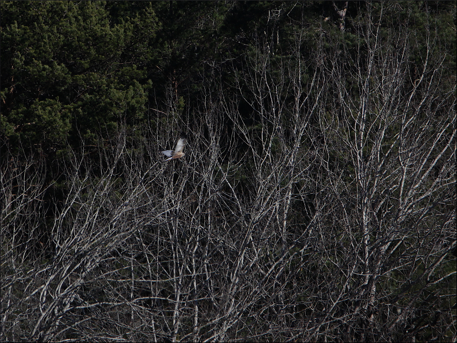 Planen var ju att den skulle jaga lågt över vassen och helst vara en vackert trefärgad hane i svart, grått och brunt. Men medan jag tog igen mig, något varmare med ett brett leende inombords, höll jag blicken mot öster där den försvann. Hoppet levde om att den kanske kom tillbaka, på planerat vis. Istället dök hanen hastigt upp ovanför infartsvägen och järnvägsspåren, snodde om kvickt och följde järnvägen utom synhåll innan jag knappt hann med. Väntade ytterligare en timme, med ack!