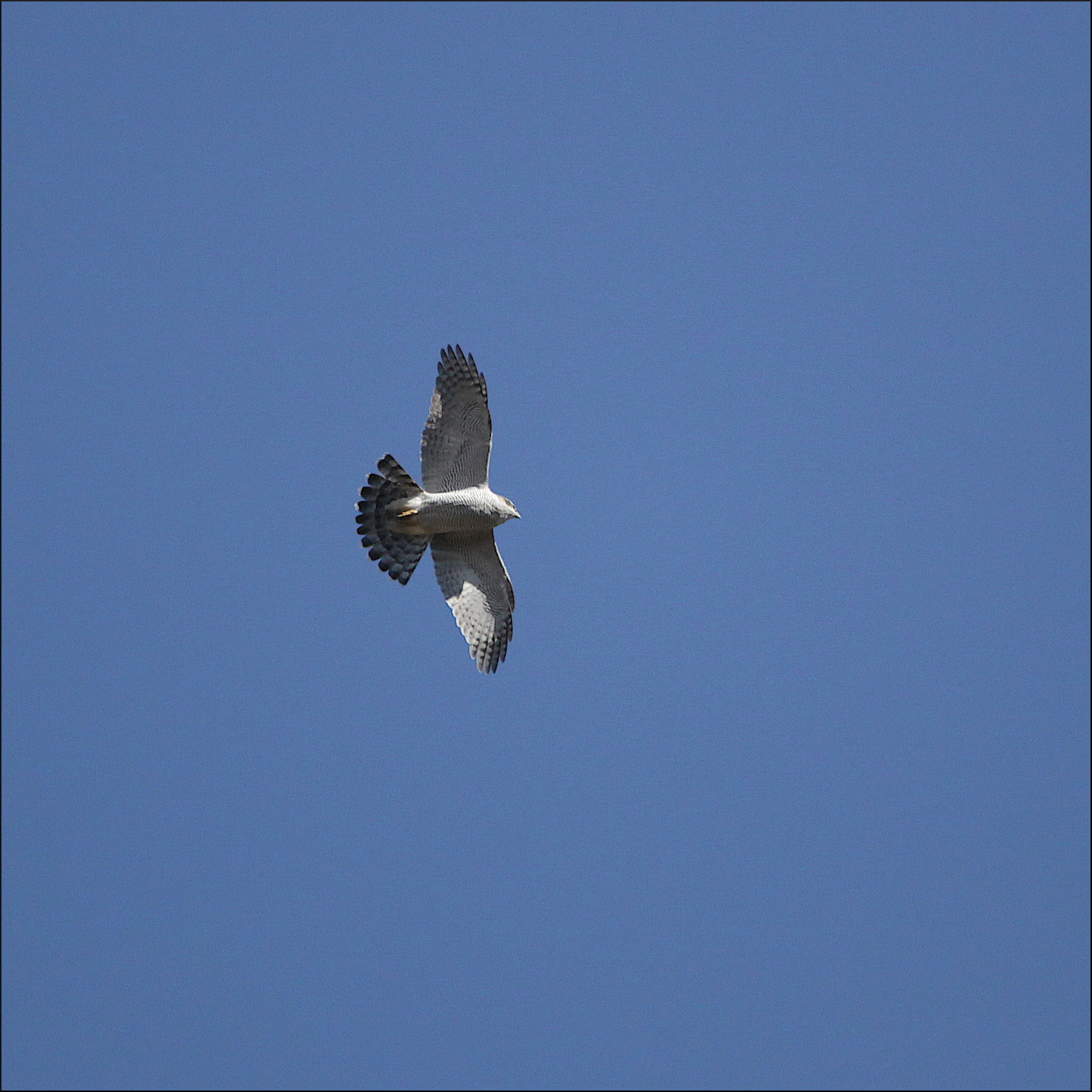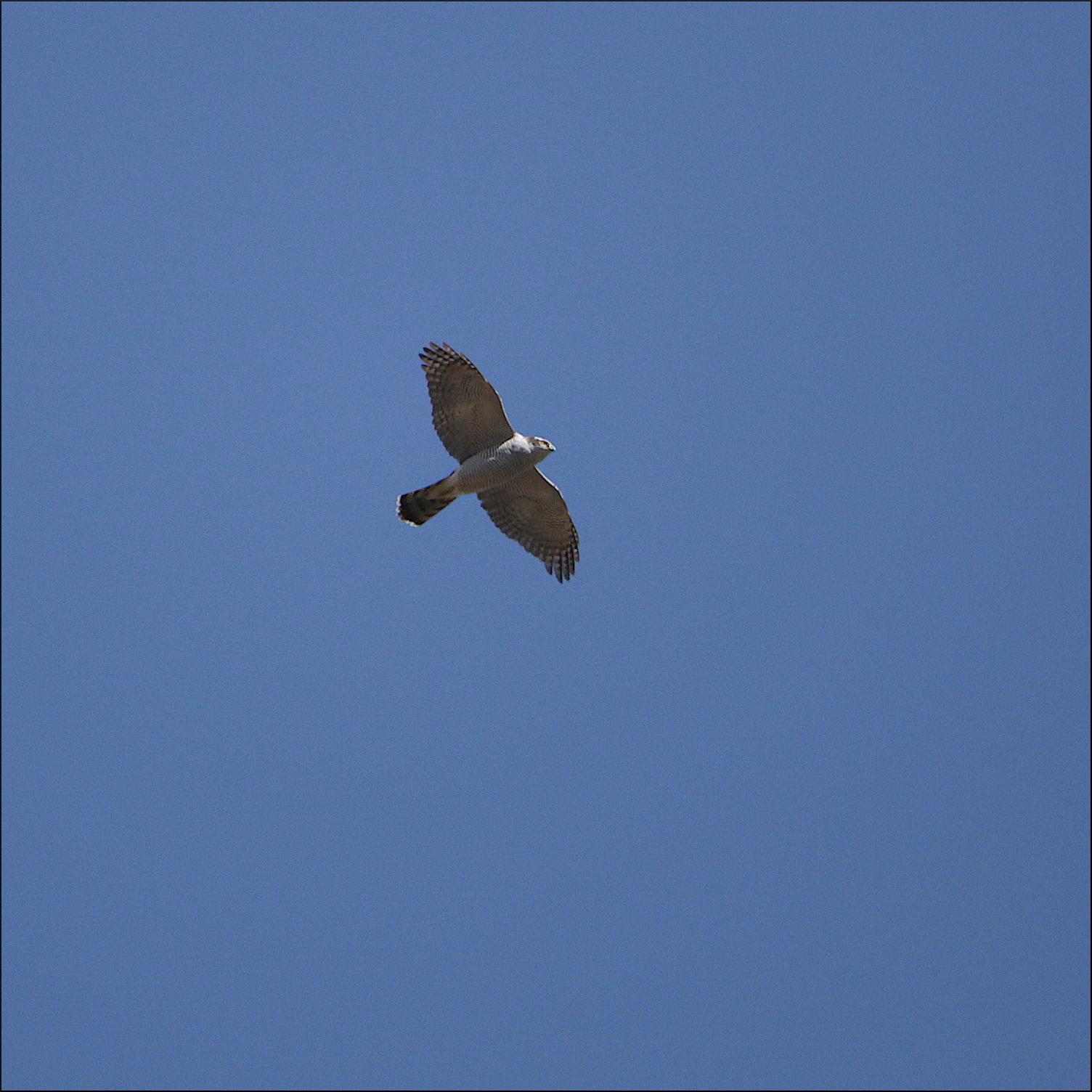 Var nästan på väg att ge upp då en liten smäcker profil kom från andra sidan rakt mot mig, ett smalt streck med ett kort huvud på håll. Flykten var bekant, när den närmade sig mig. På behörig höjd iakttog den mig samtidigt som den försökte upptäcka nåt i skogskanten eller slå någon oaktsam småfågel. Den vuxna sparvhökshonan cirklade över mig ett par gånger innan hon försvann över trädtopparna. Envisheten vann idag och det kommer att komma fler dagar, sju per vecka sägs det.