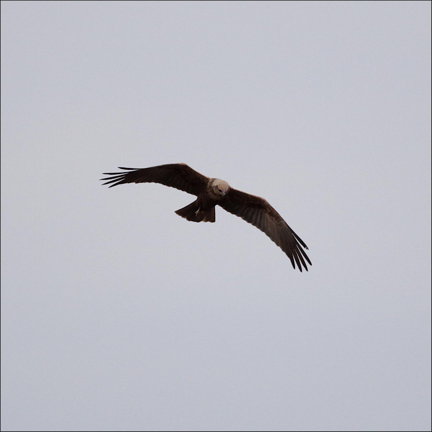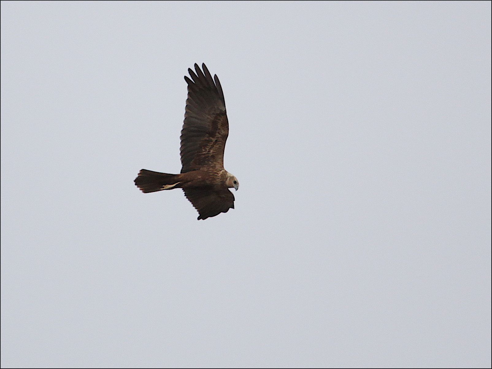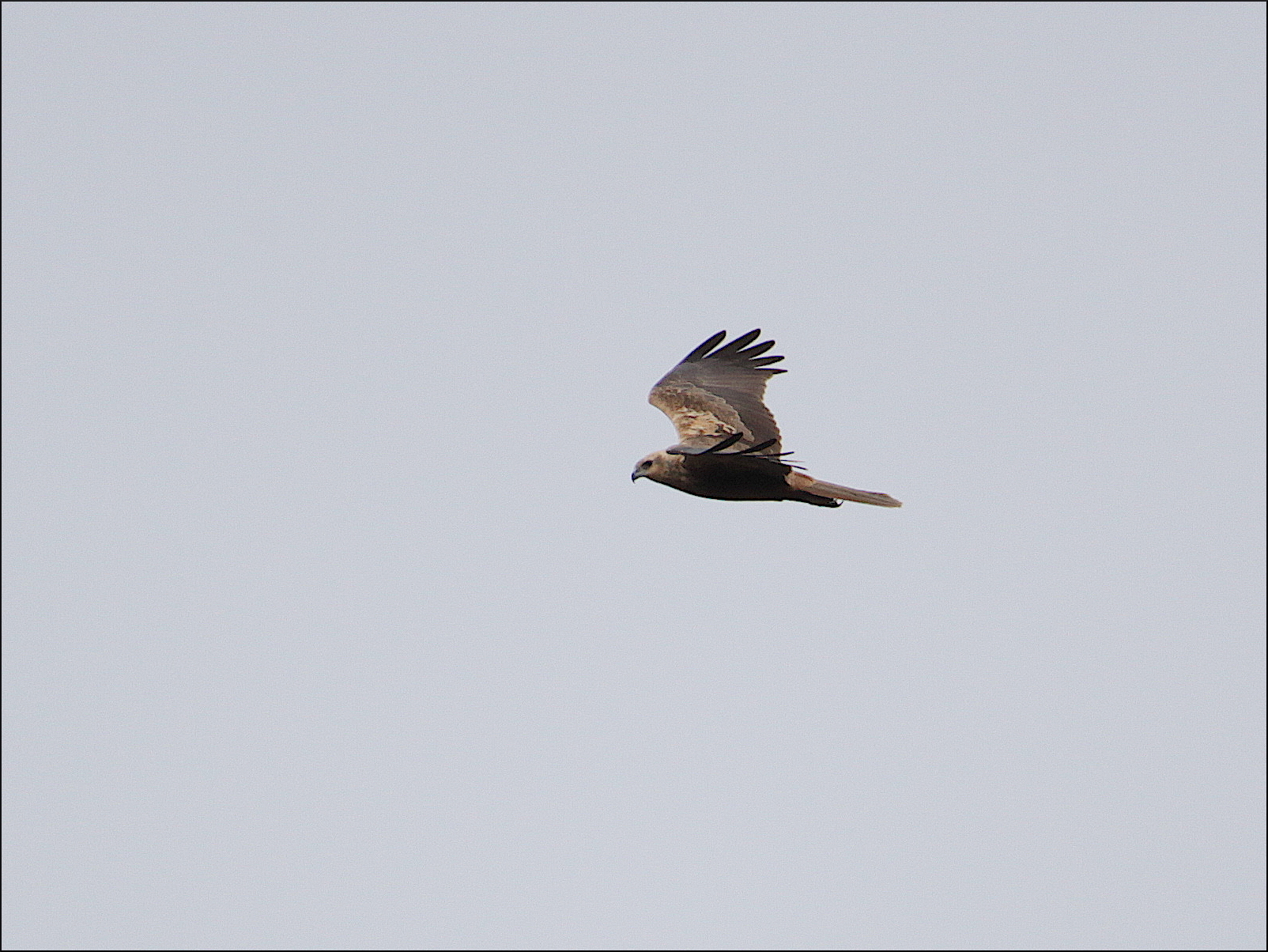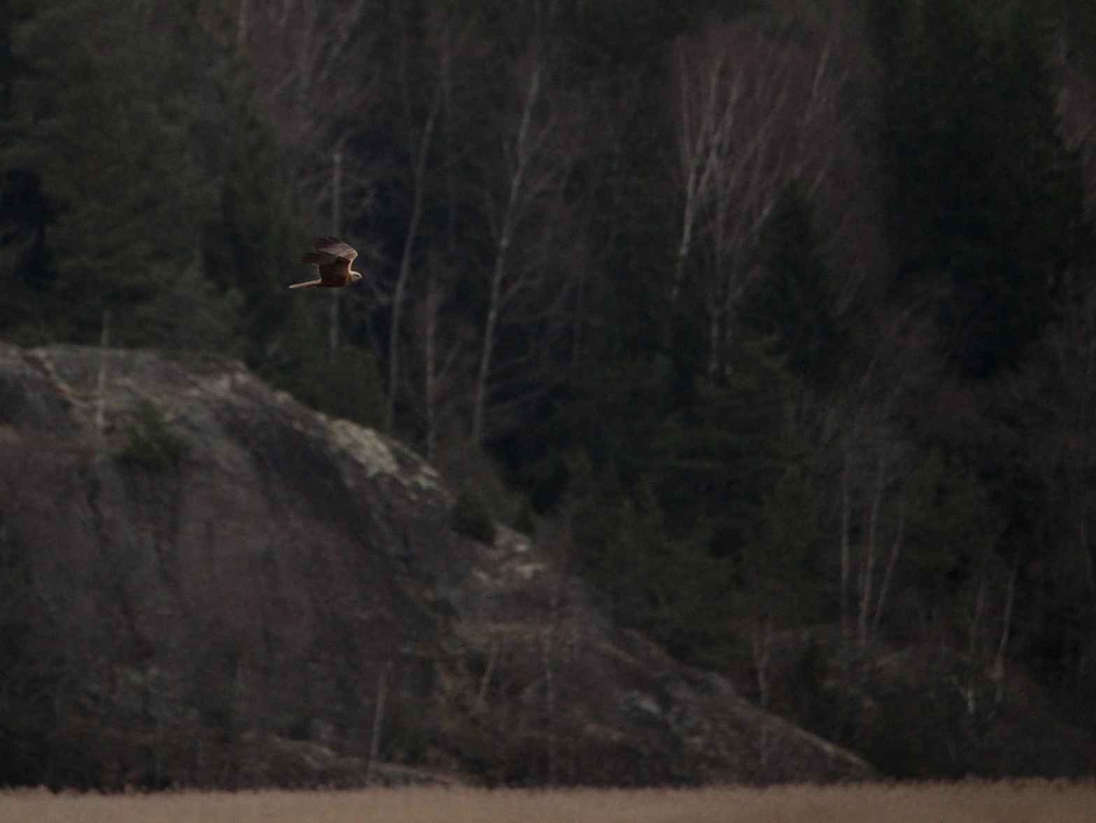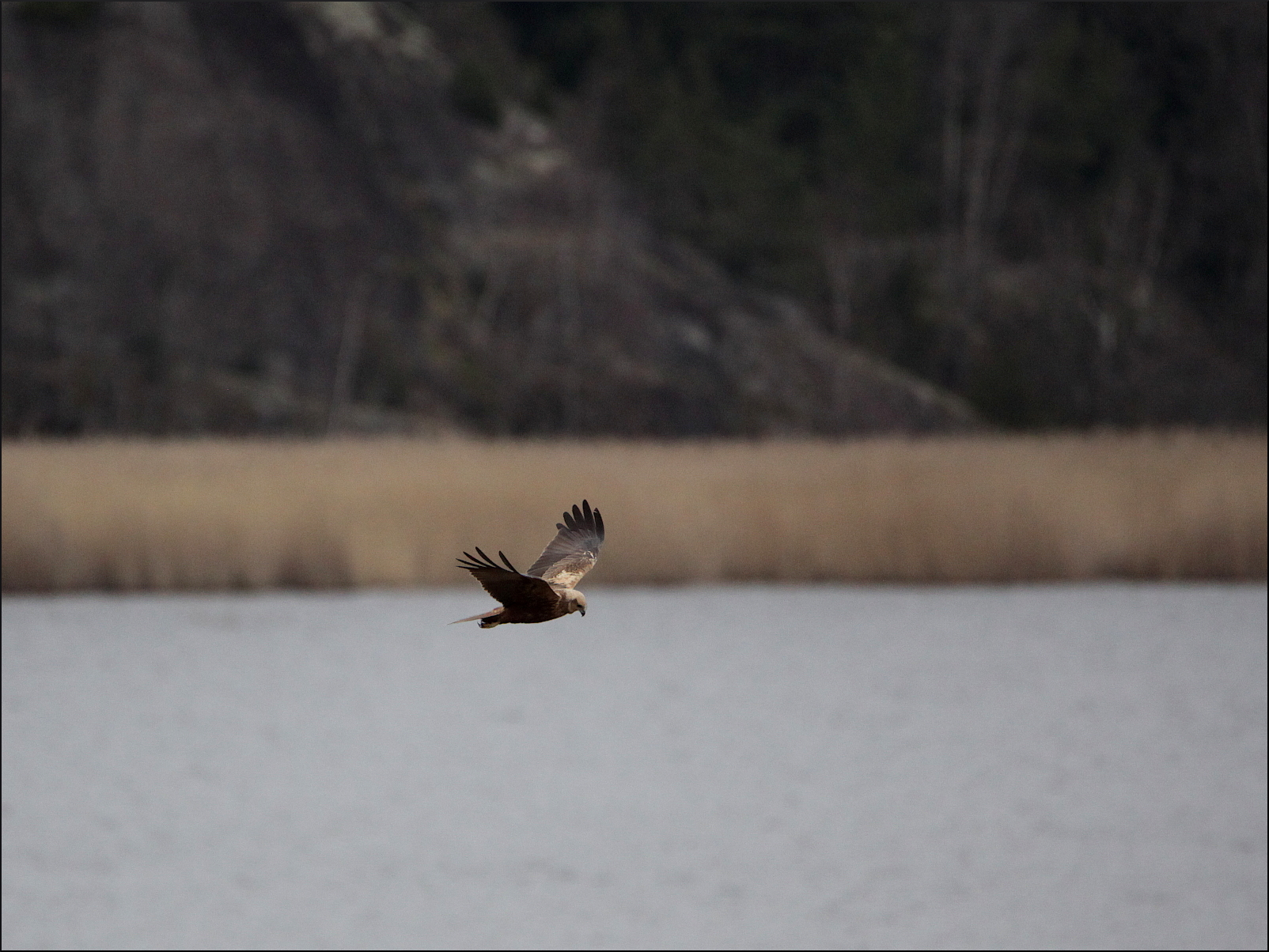 Vi spanade mycket rätt över sjön mot en liten bergholme i vassen, där brun kärrhök hade setts tidigare. Mycket riktigt, det tog inte lång stund förrän den bruna honan och även hanen syntes jaga över vasskanterna och bland buskarna i vassen. Honan kändes bekant men osäker pga avståndet. De verkade i alla fall ha full uppmärksamhet på att ordna frukost till sig själva med blicken rakt ner hela tiden. Inte ens en förbipasserande gråhäger störde honan.