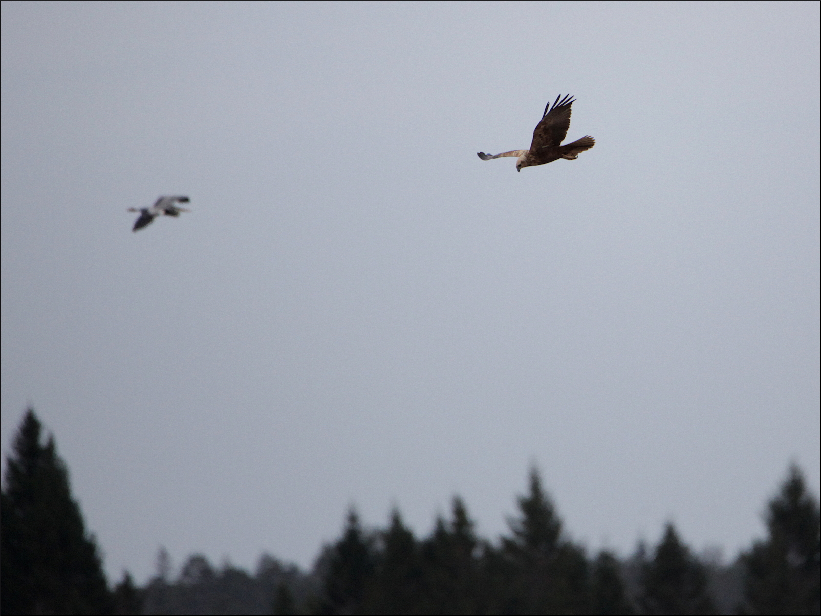 Längre ut högt över sjön härskade trutarna, men ibland ersattes de vita vingspannen av mörkare. Knappt skönjbar i handkikaren seglade en gammal havsörn omkring, uppvaktad av vråkar. Vi kunde också gissa oss till en fiskgjuse som förföljdes av en sparvhök när de lyste vitt mot skogskanten.