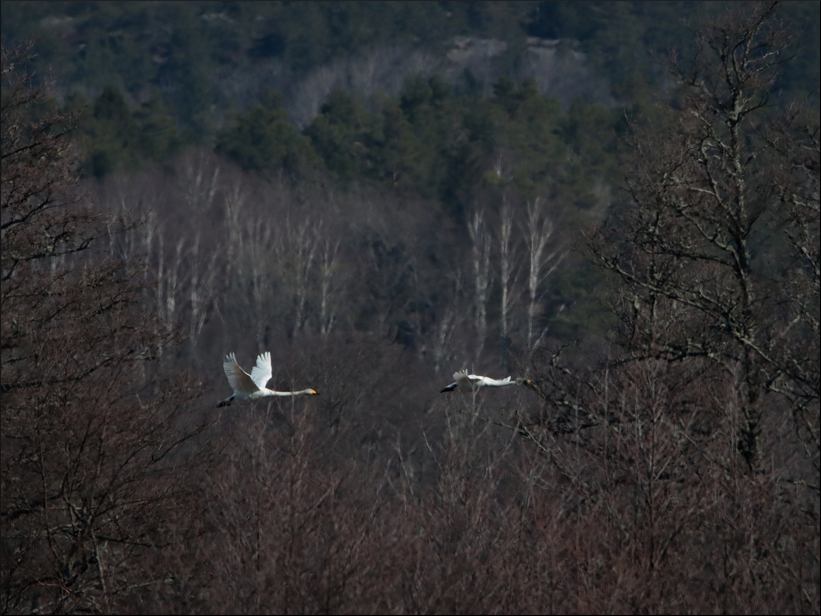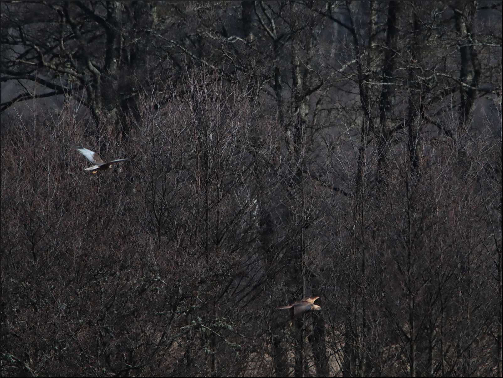 De hörs kommunicera ganska mycket för tillfället, de ropar på varandra och meddelar också om det dyker upp andra brunhökar eller när fiskgjusen och havsörnen syns över sjön. Själv tror jag tranorna utgör det största hotet mot eventuella ägg och nykläckta ungar. Hursomhelst, i fredags fick jag äntligen se hur Gräddvinge gick ner och inspekterade boet som Zorro höll på med att finjustera det sista antar jag. Hon verkade så ivrig att de nästan krockade när han försökte lyfta samtidigt. Vi får hoppas att inredningen blev godkänd.