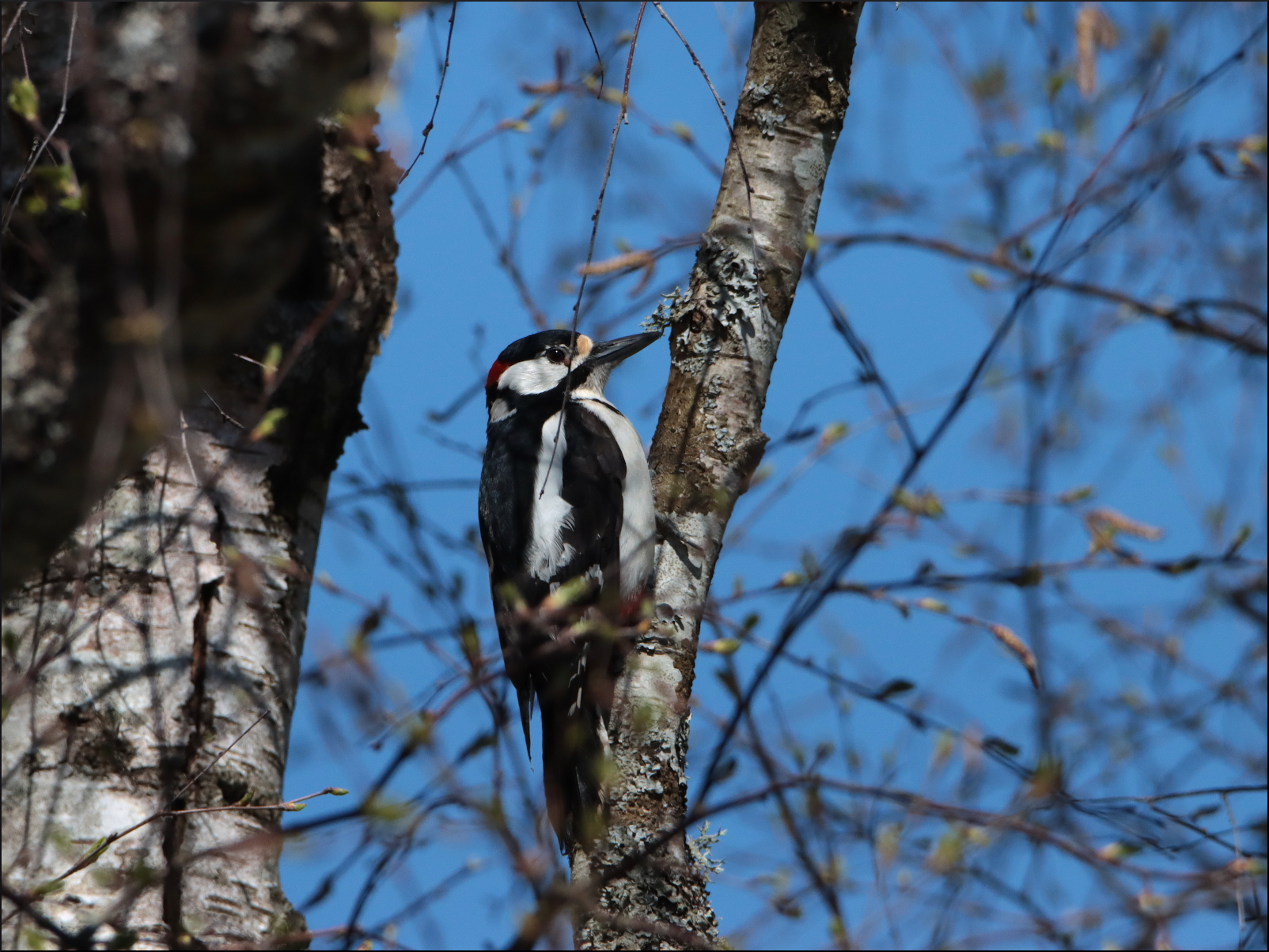Vilar ryggen i trädgården efter en stundtals hektisk fågelvår, men när man får besök måste man ändå ta tillfället i akt. En större hackspett tog grannens björk i besittning och satt kvar ett tag. En chans att föreviga bekantskapen togs tillvara innan de ljusgröna musöronen snart bäddar in björken helt.