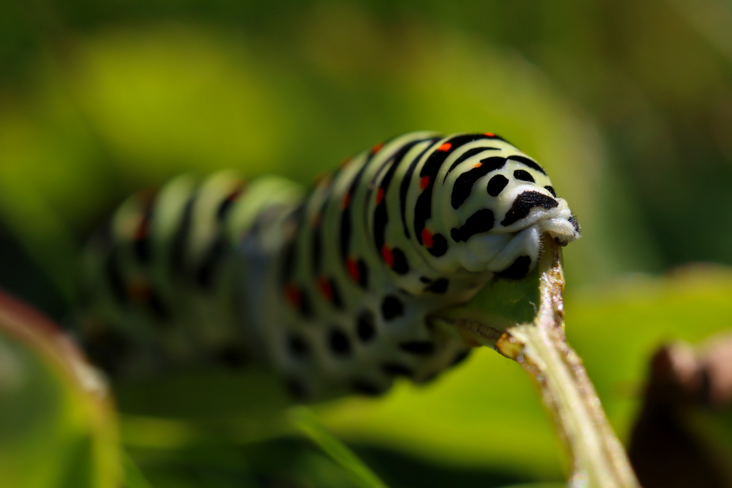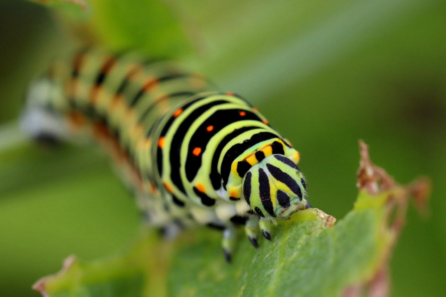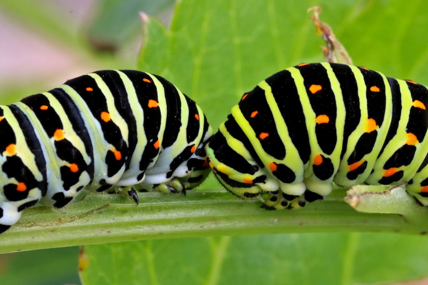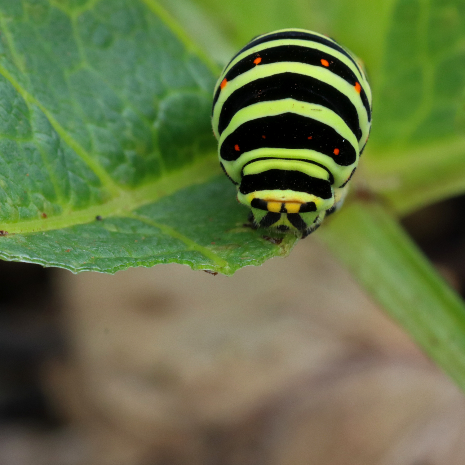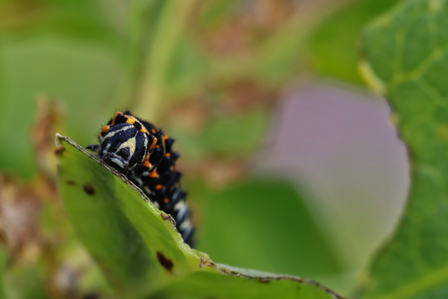 När larven växer och blir större, vilket tar 3-5 veckor, ger dess skinn ett visst skydd eftersom det smakar illa. I nacken sitter också ett illaluktande orange organ som framförallt stöter bort andra för larven farliga insekter. Notera gärna att bakdelen har en kontrastrik teckning i svart och vitt som också kan förvilla en angripare som ser ögon i baken så att säga.