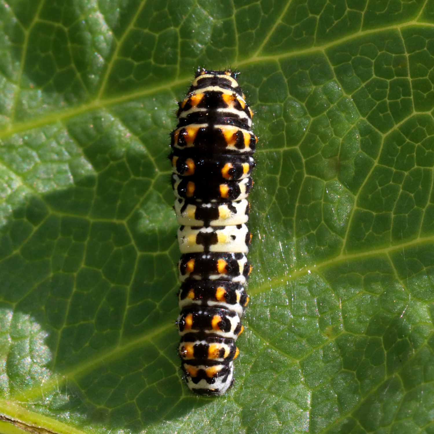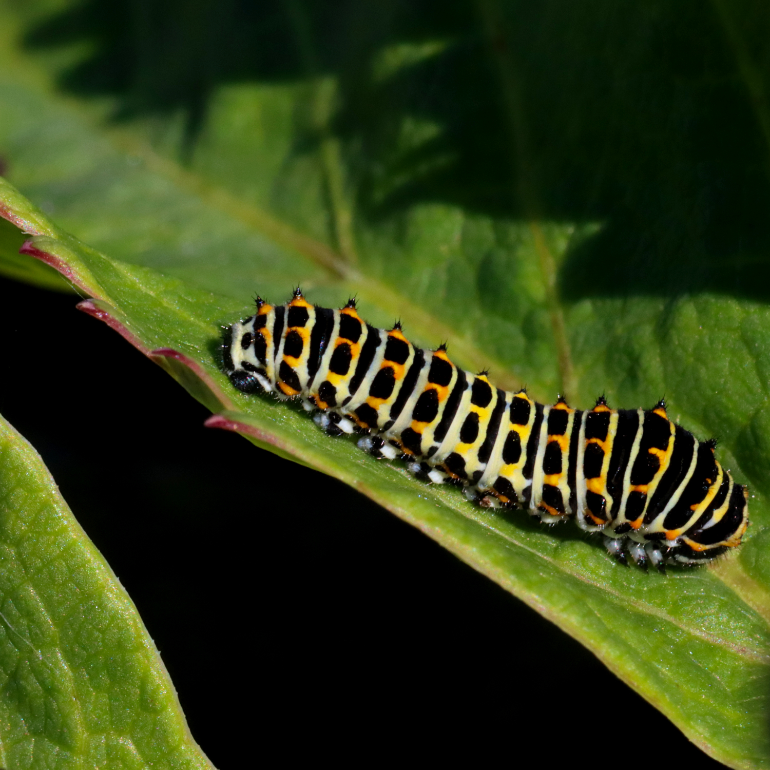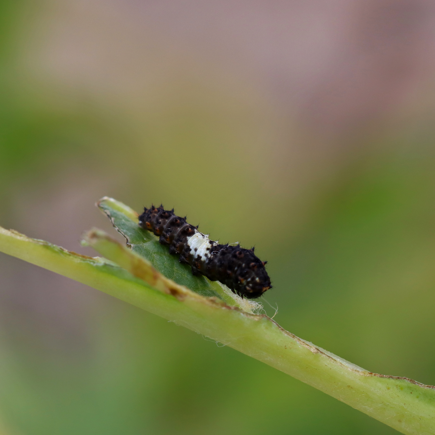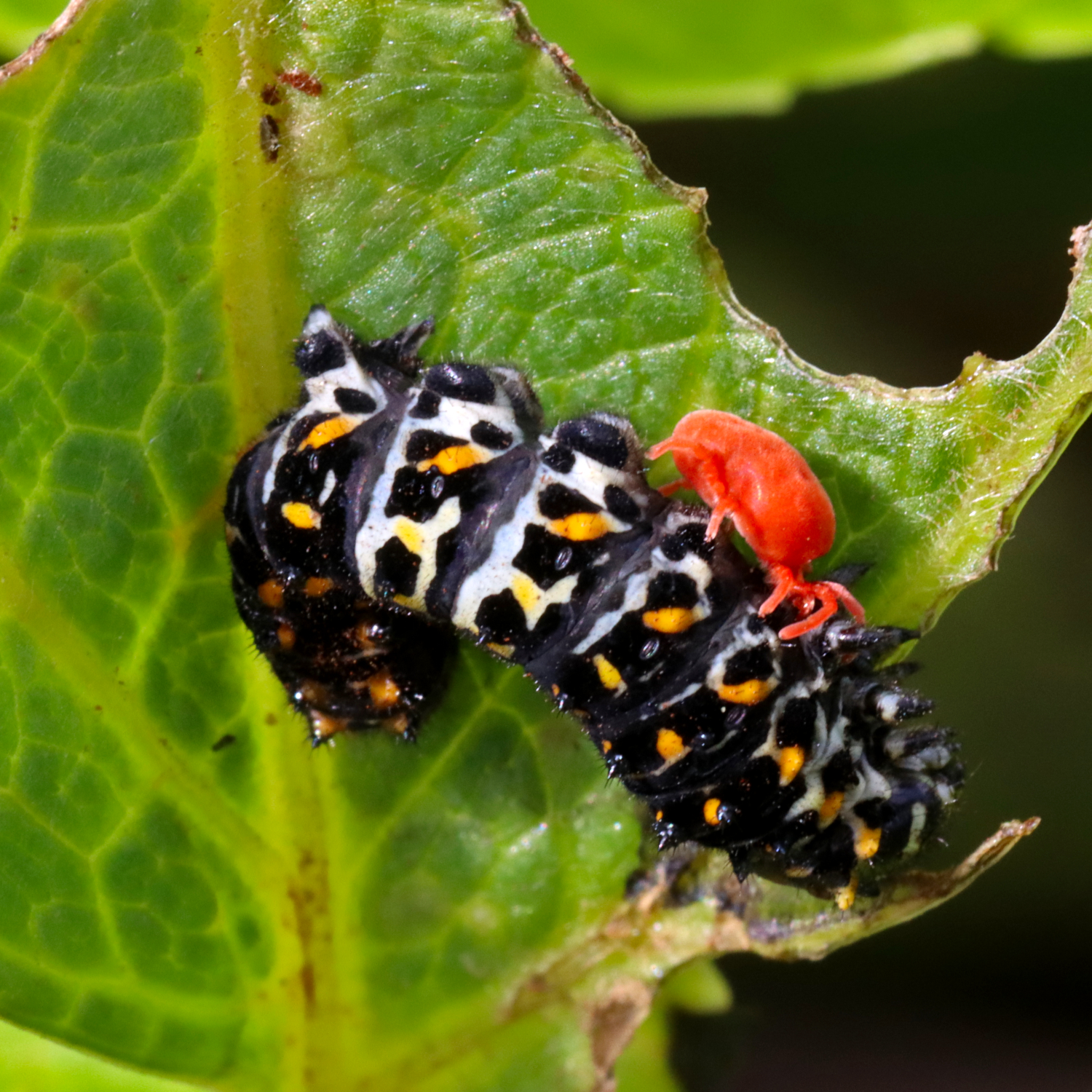 De finns helt plötsligt på en plats i hundratal. Tappar snabbt räkningen efter 250 exemplar, när jag avslutat min fotosession. Kan säkert vara det dubbla om man djupdykt ner i varje busklik planta. De finns i alla olika larvstadier. De minsta nykläckta svarta med vit midja ska enligt expertisen efterlikna fågelbajs och därmed lura fiender. Detta för att de än så länge inte utvecklat något effektivt skydd, där inte bara fåglar utan även små kvalster kan utgöra ett allvarligt hot (se den röda ”spindeln” på bilden nedan).