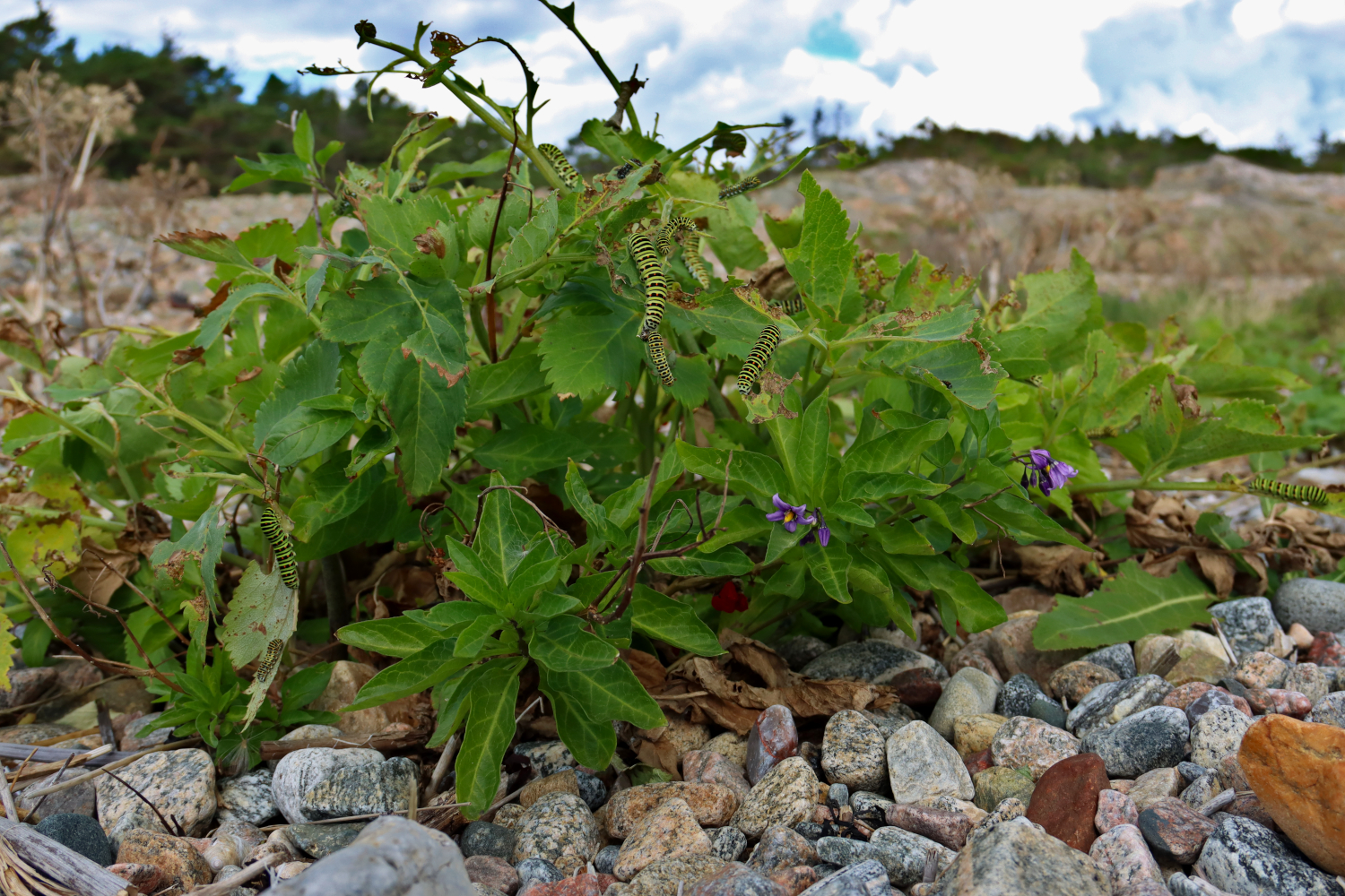 Inte sett en enda Makaonfjäril (Papilio machaon) i år, när jag plötsligt trampar in i deras barnkammare. På en liten stenfylld yta vid en rännil till bäck ser jag larver av makaonfjärilen överallt. Platsen ligger i en oskyddad utsatt vik nära västerhavet på Saltö, tillhörande Kosterhavets nationalpark. Ganska snart blir jag varse varför de finns just här. Strandkvanne (Angelica archangelica subsp. littoralis) har brett ut sig på ömse sidor om bäcken och trots att den blommat ut så erbjuder dess tjocka frodiga blad precis det larverna behöver.