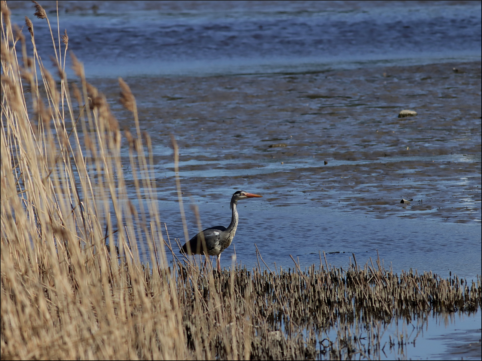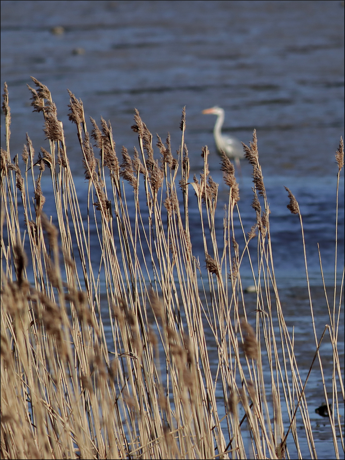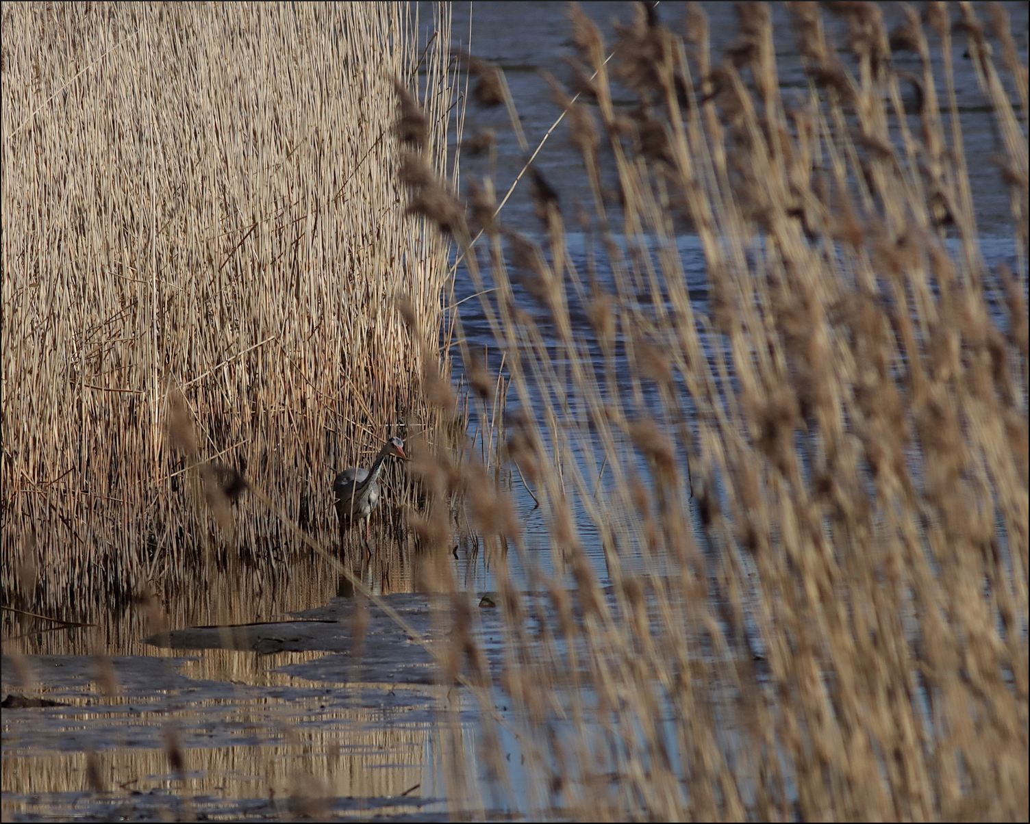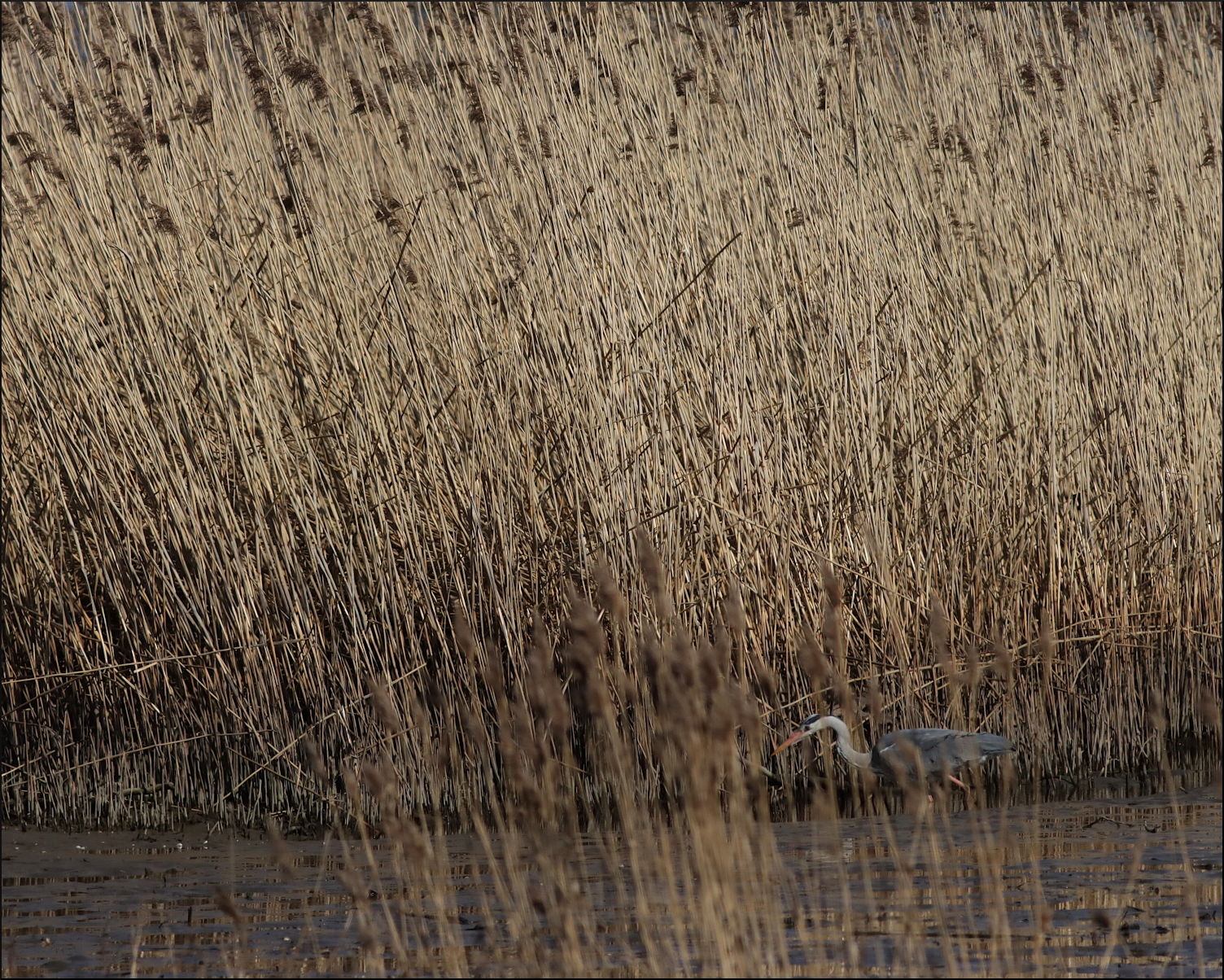 Satt i tornets eftermiddagsskugga när gråhägern landade hundra meter ut, till hälften dold bakom vassruggen. Den smög försiktigt i vasskanten, frös till i en stelnad position ibland, fullt fokuserad på rörelser under vattenytan. Sneglade åt mitt håll, men jag försökte hålla mig bakom det massiva räcket, med bara huvud och kamera synligt. När den lurade mig och kom fram på ”fel” sida, måste jag resa mig halvvägs, för att slippa få räcket i bild. Så, det slutade som vanligt. Med en flyktbild bakifrån.