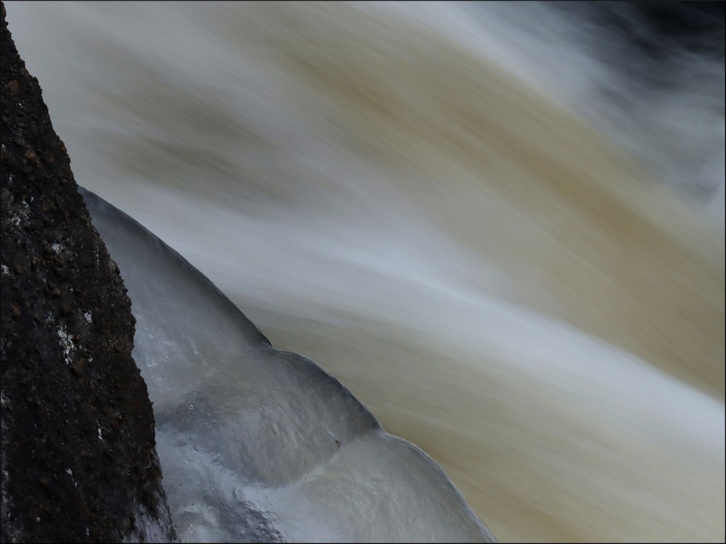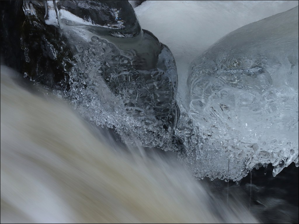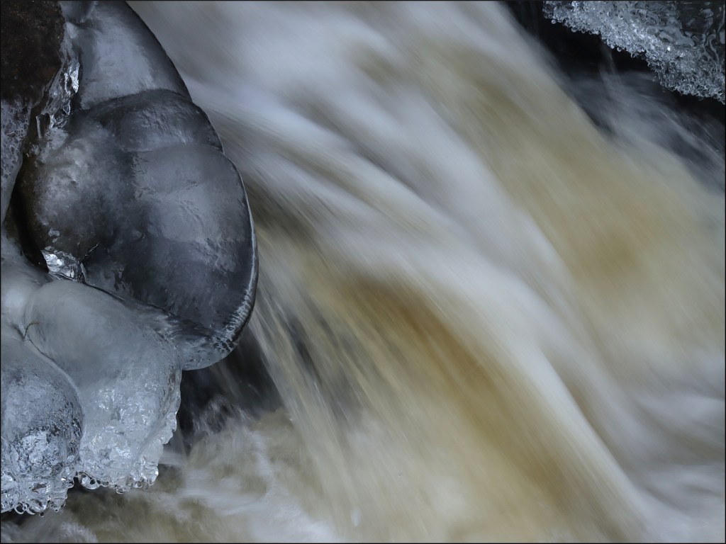 Försökte igår beskriva processen, hur det flödande vattnet skapar skulpturer av is. Det var ännu svårare att försöka dokumentera med långa slutartider och stora rörelser i de istyngda kvistarna. Tog istället några korta filmsekvenser med kalla händer, för att kunna spara ögonblicket och kanske återkomma för att se hur det utvecklar sig nu när kylan skall återkomma igen under veckan. Vi får väl se….