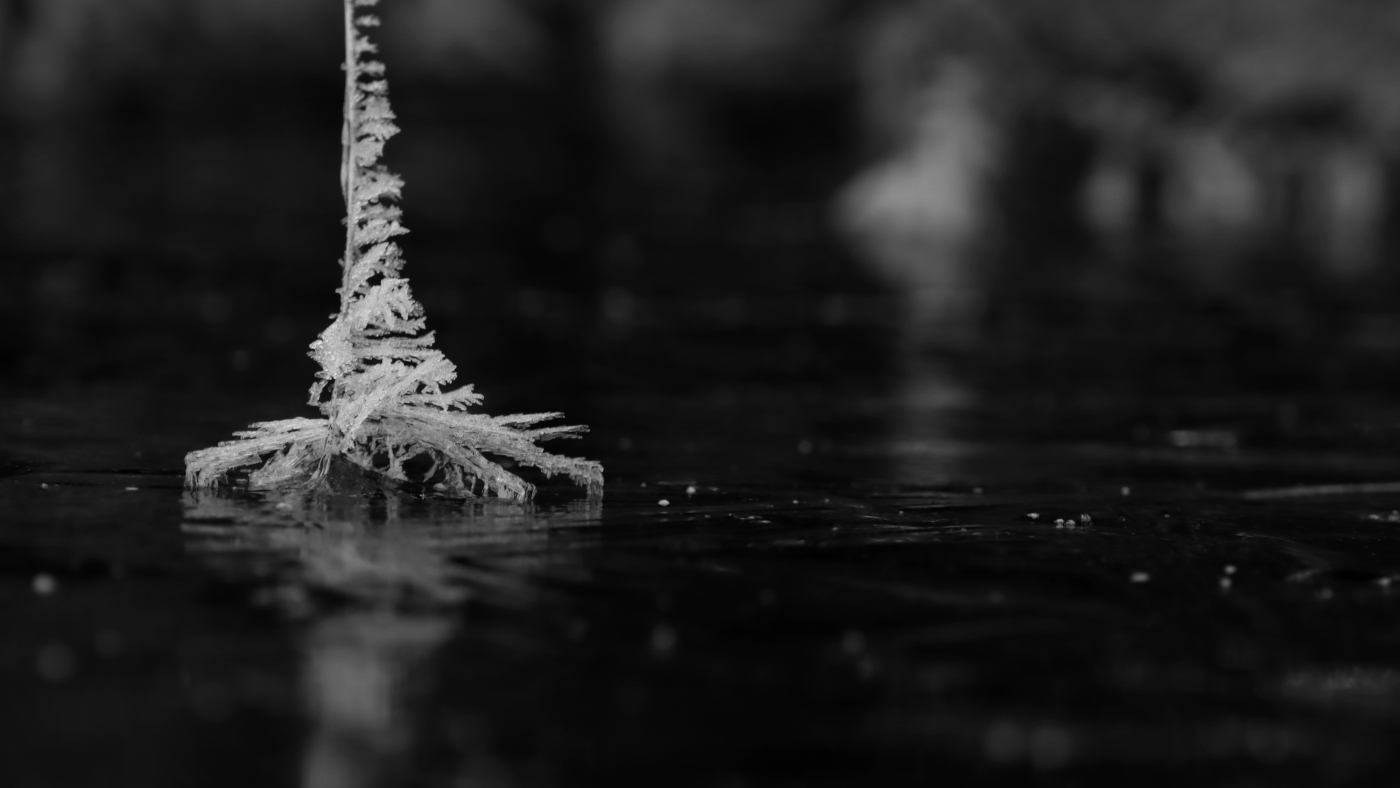 Sjön är frusen med decimetertjock is, men bäcken står emot vid utloppet.