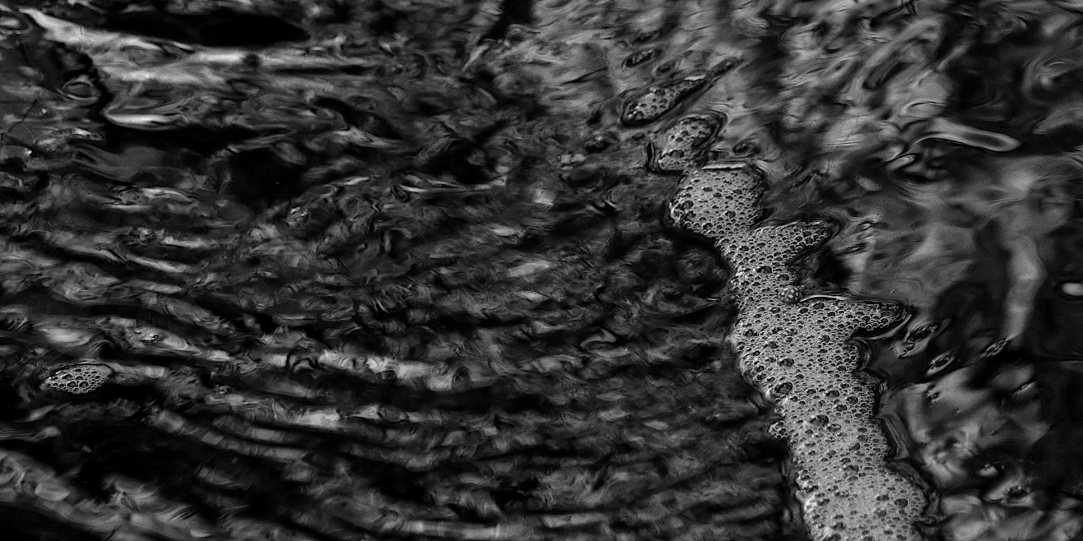 En ljusgrå himmelsspegel i rörligt vatten, där endast skuggorna av träden avslöjar bottenstrukturen.