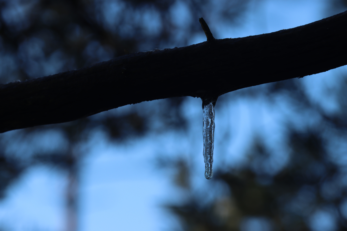 En dag med blek decembersol, delvis skymd bakom tunna moln vid horisonten. Nattis som inte hunnit tina i ett dike längs skogsvägen. Kan aldrig sluta fascineras av vatten, speciellt i denna spröda form.