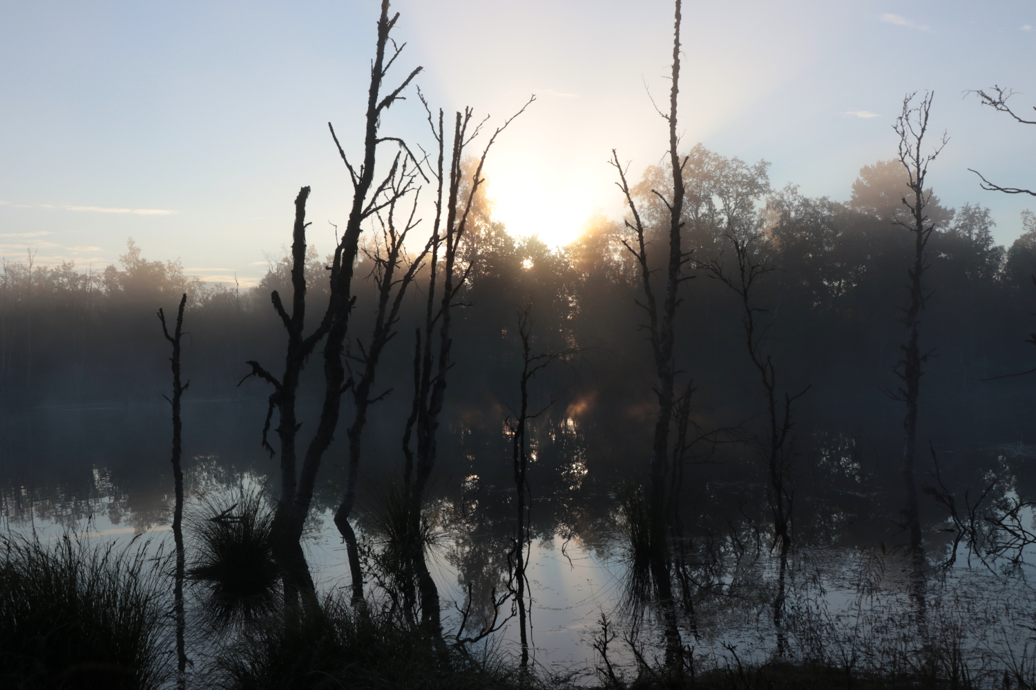 Klockan visar bara 4.55, morgonsolen försöker bryta ner dimman i den namnlösa tjärnen.
